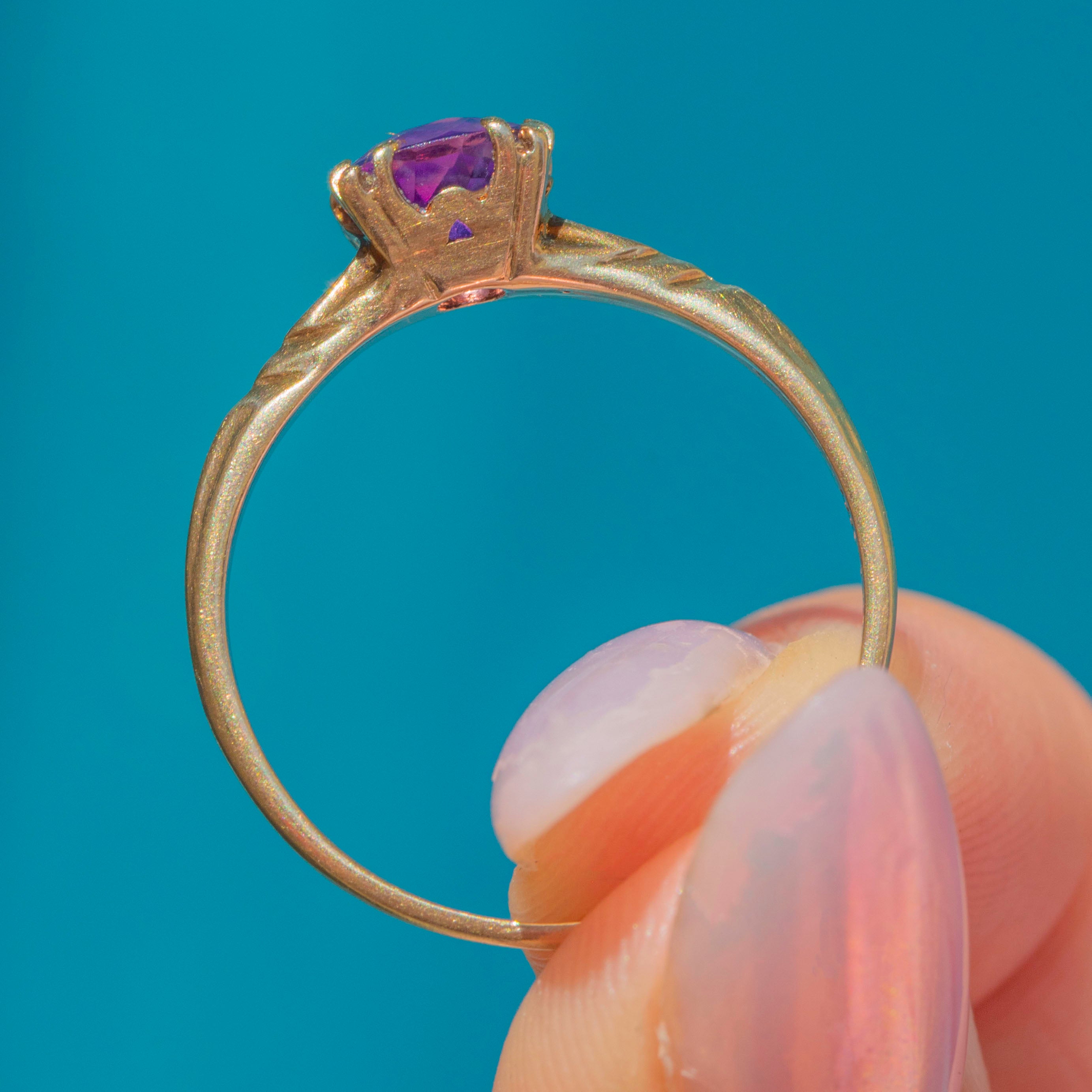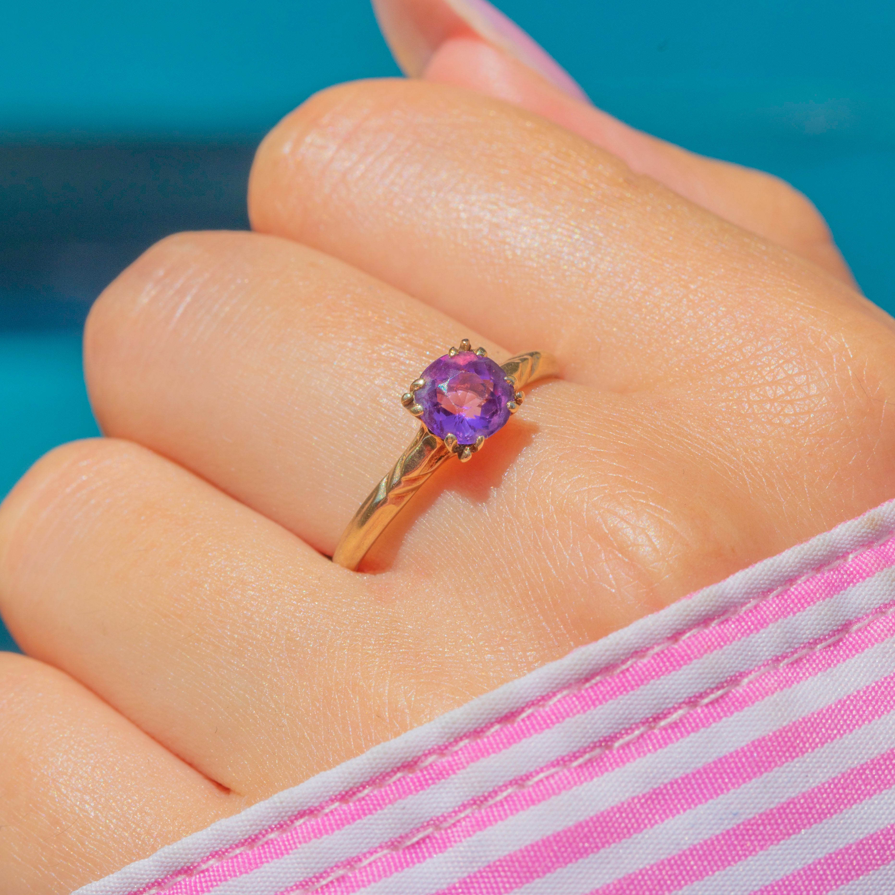 A dainty 0.50ct Amethyst solitaire ring, projecting resplendent saturated purple hues from its gorgeous facets. The round-cut Amethyst is set within glossy 10ct Gold claws and flanked by engraved shoulders, providing a lovely decorative finish.