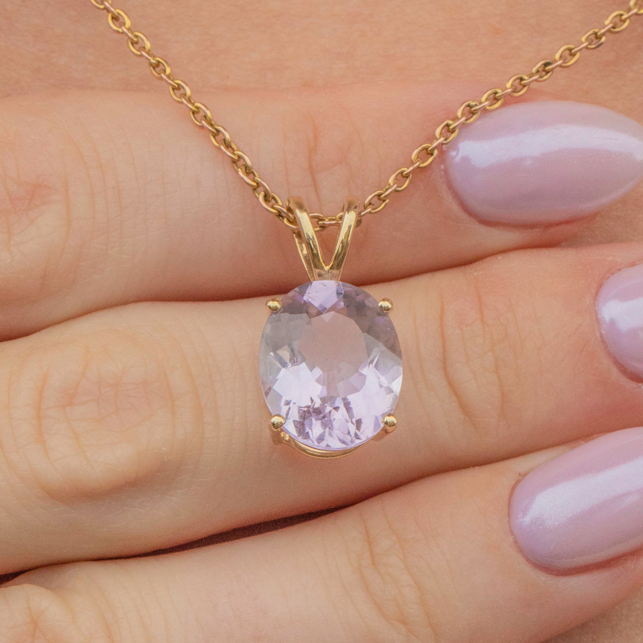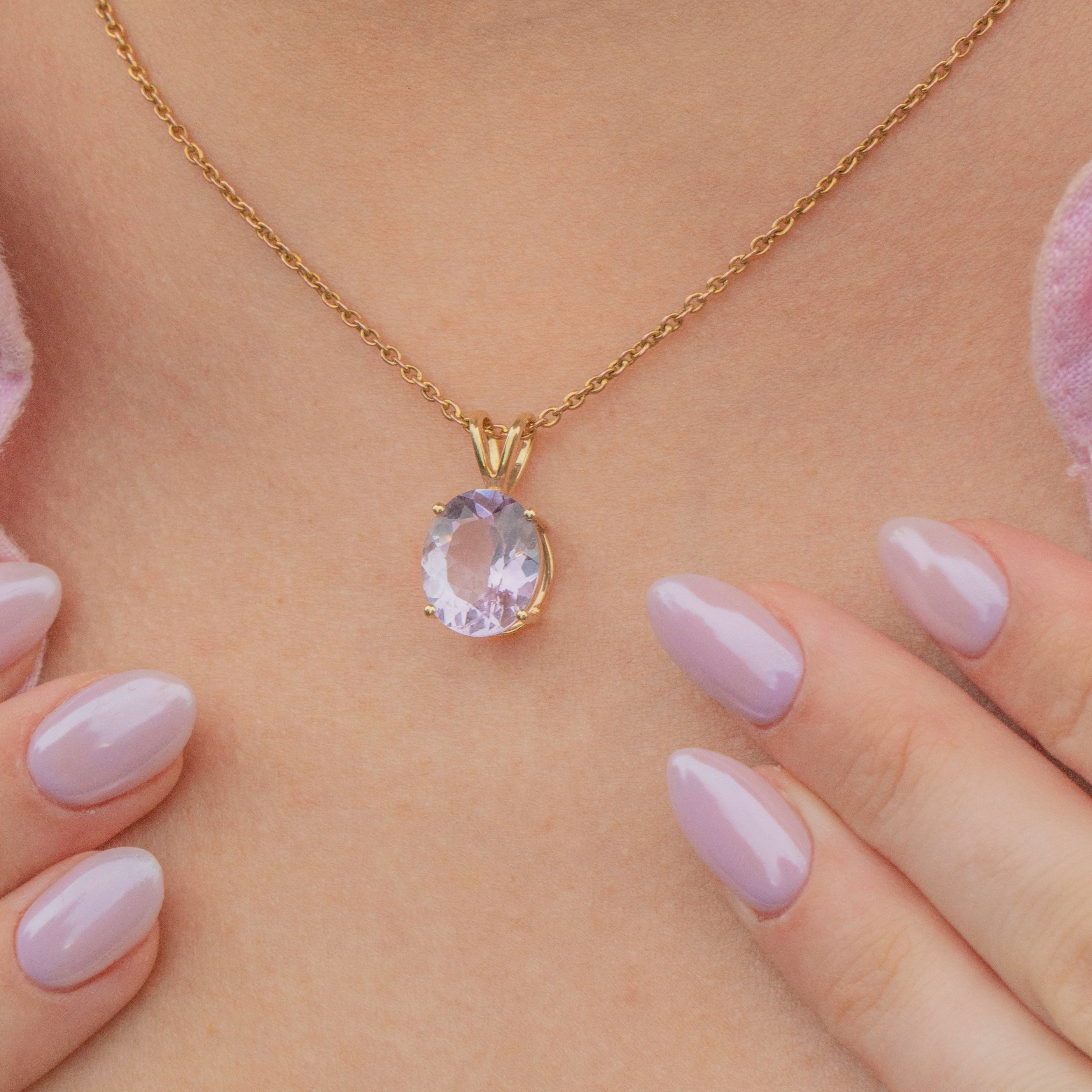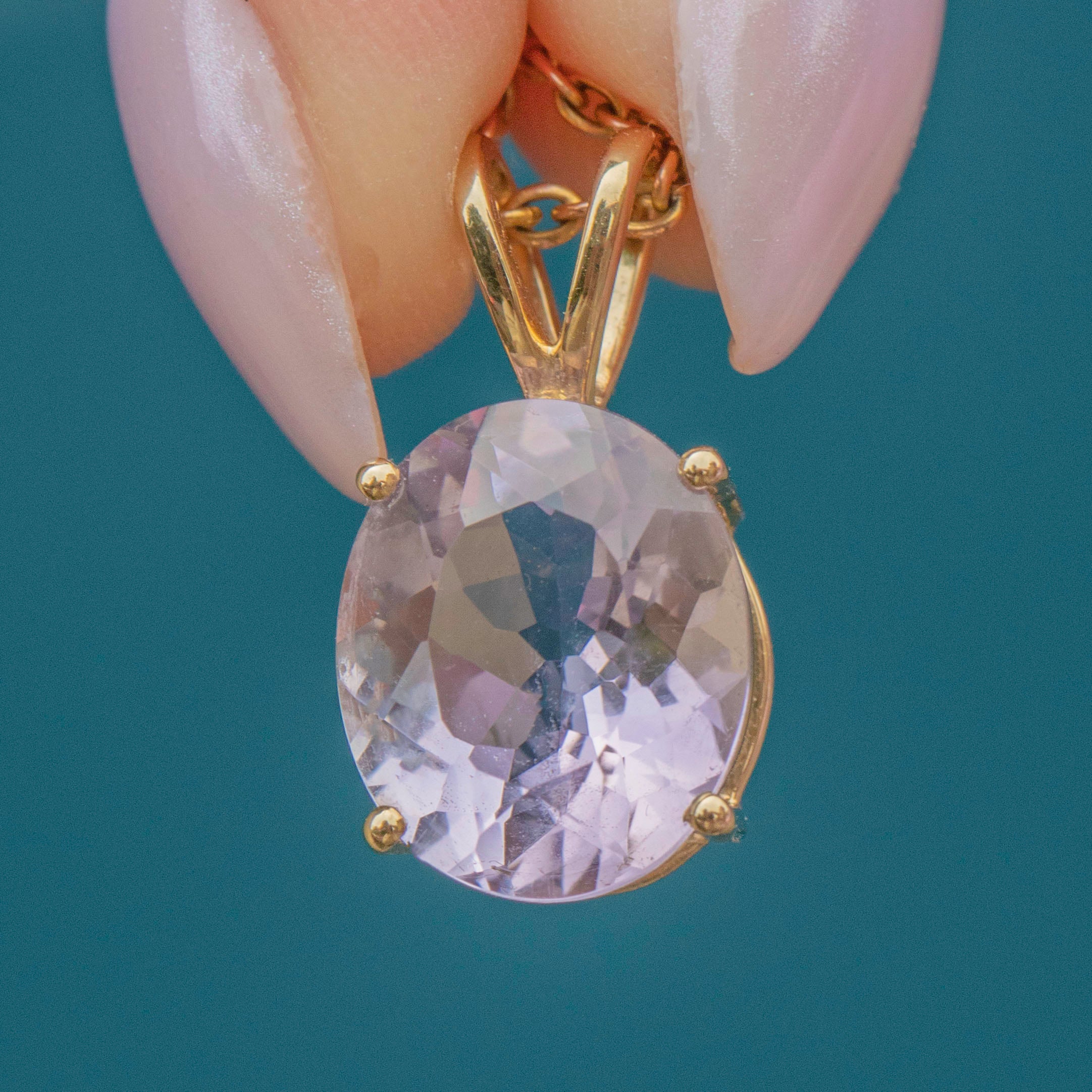 EXCELLENT. This 10ct Gold Kunzite pendant is in excellent condition. The gemstone has a lovely light lilac hue and securely set into place, free from chips or abrasions. This Gold pendant is ready to wear straight from the box!