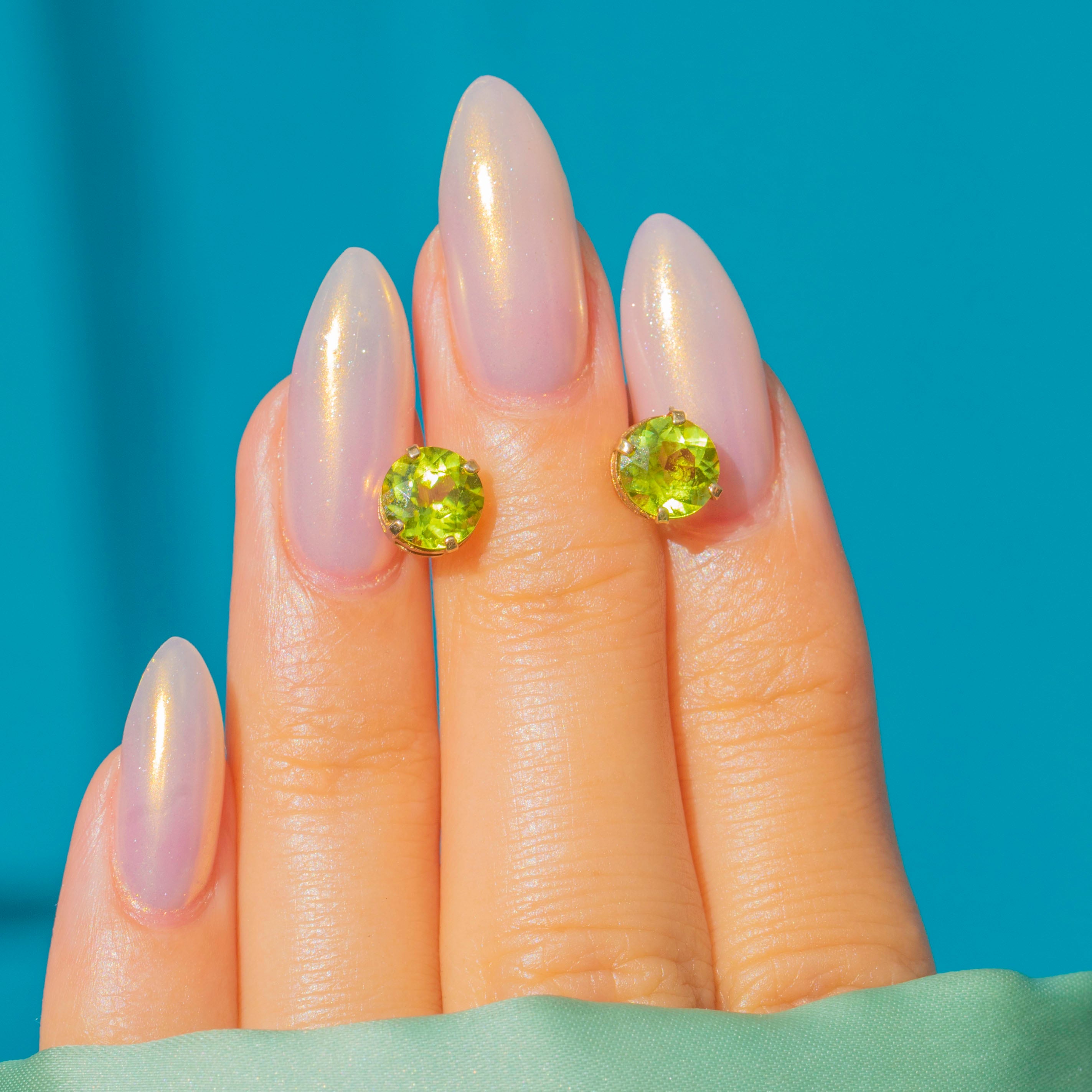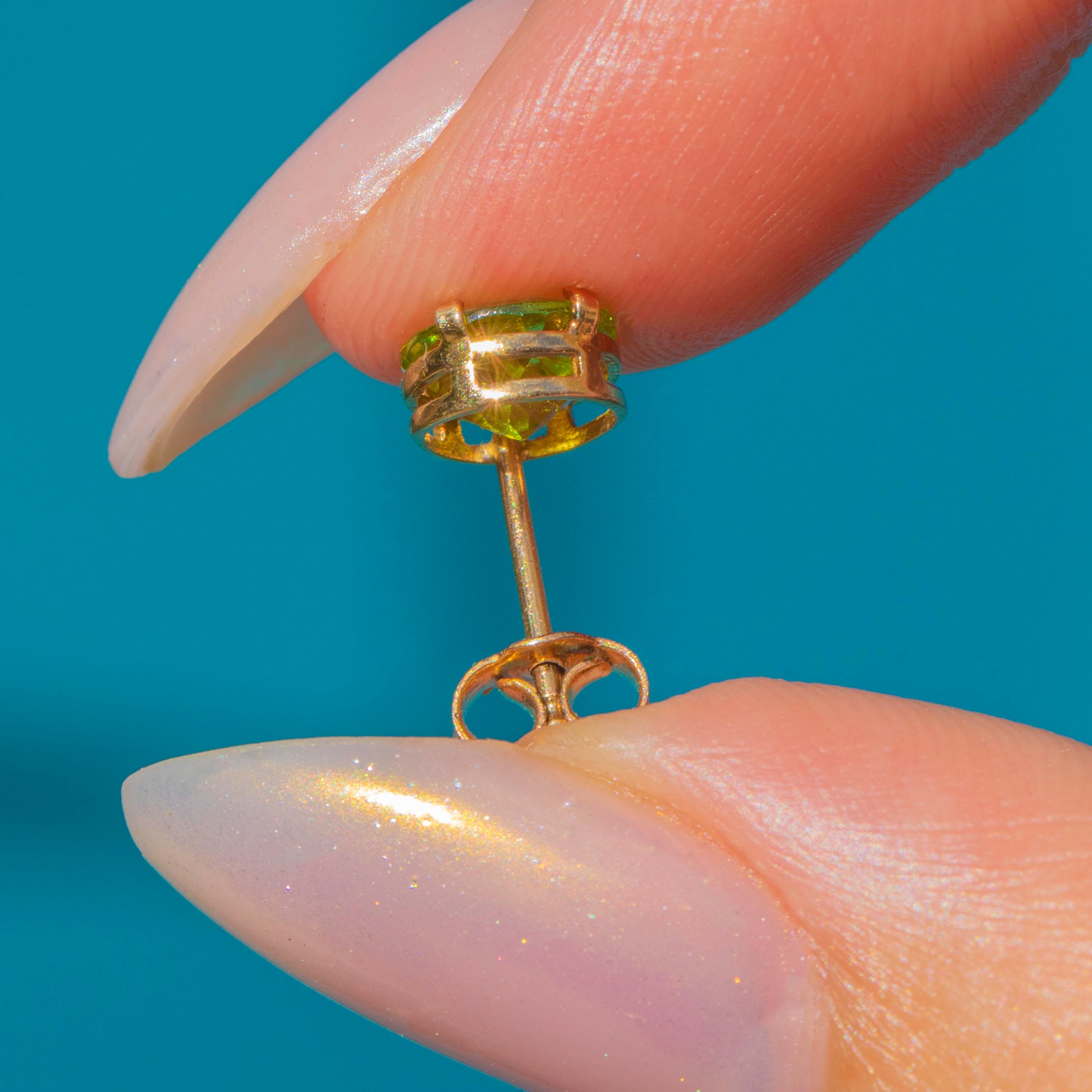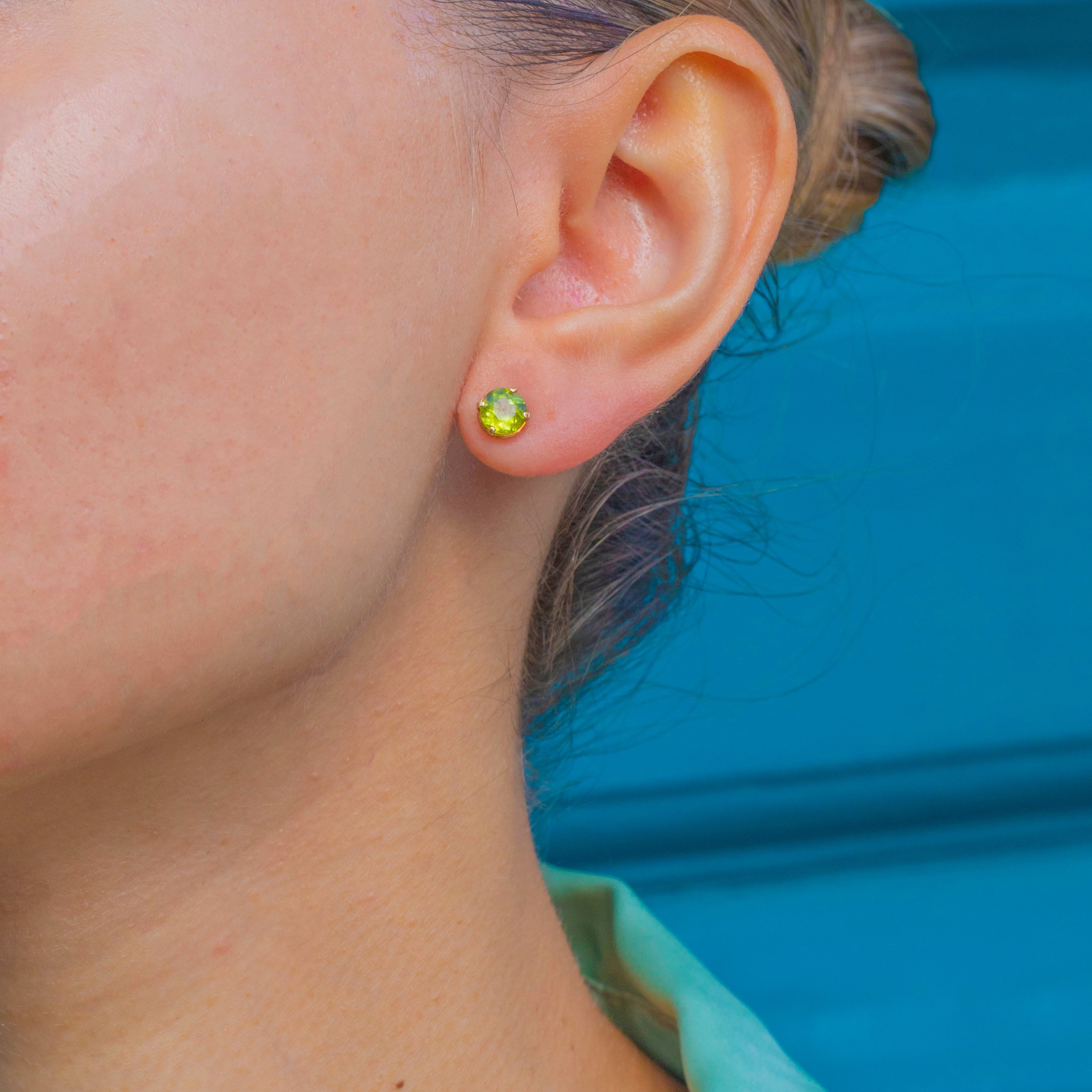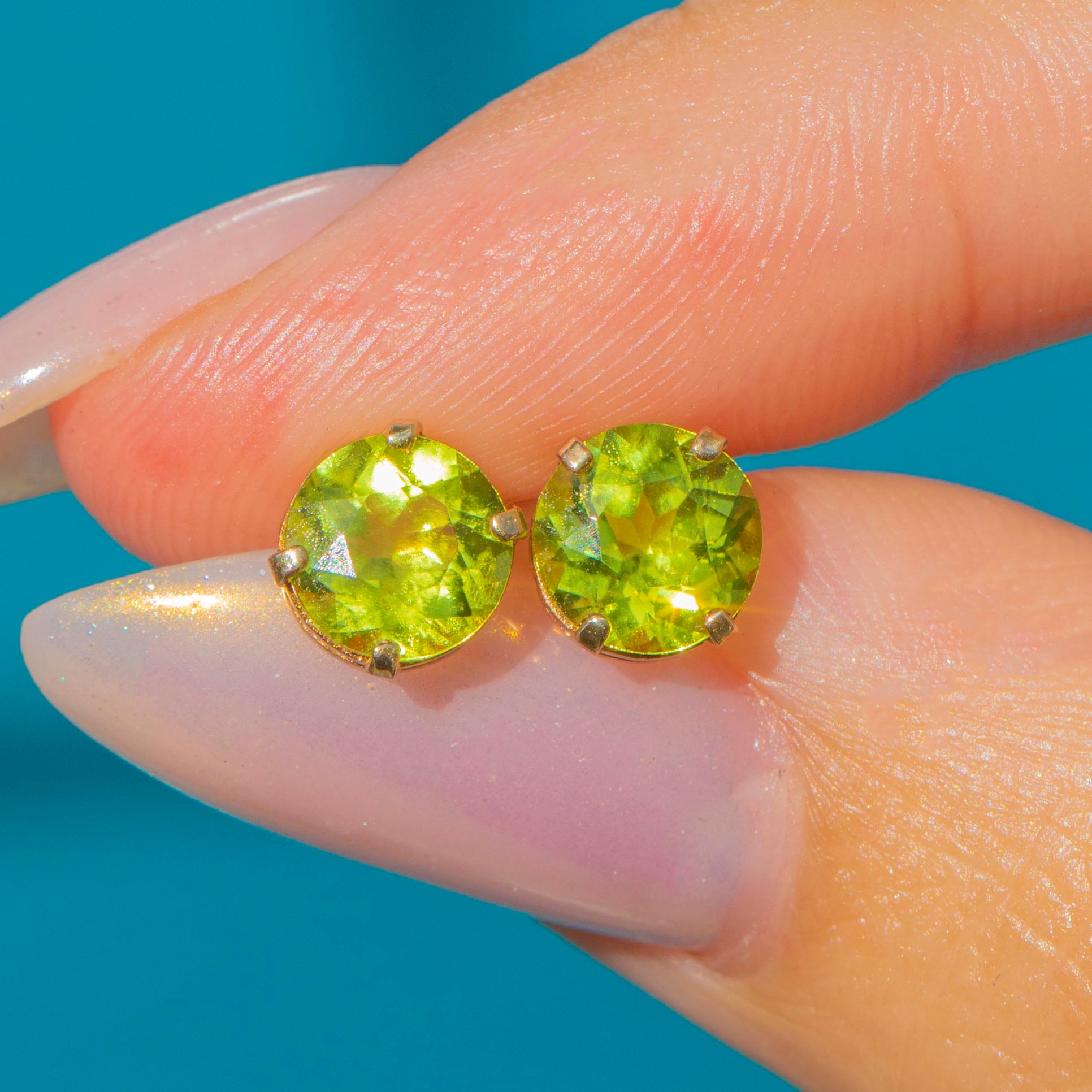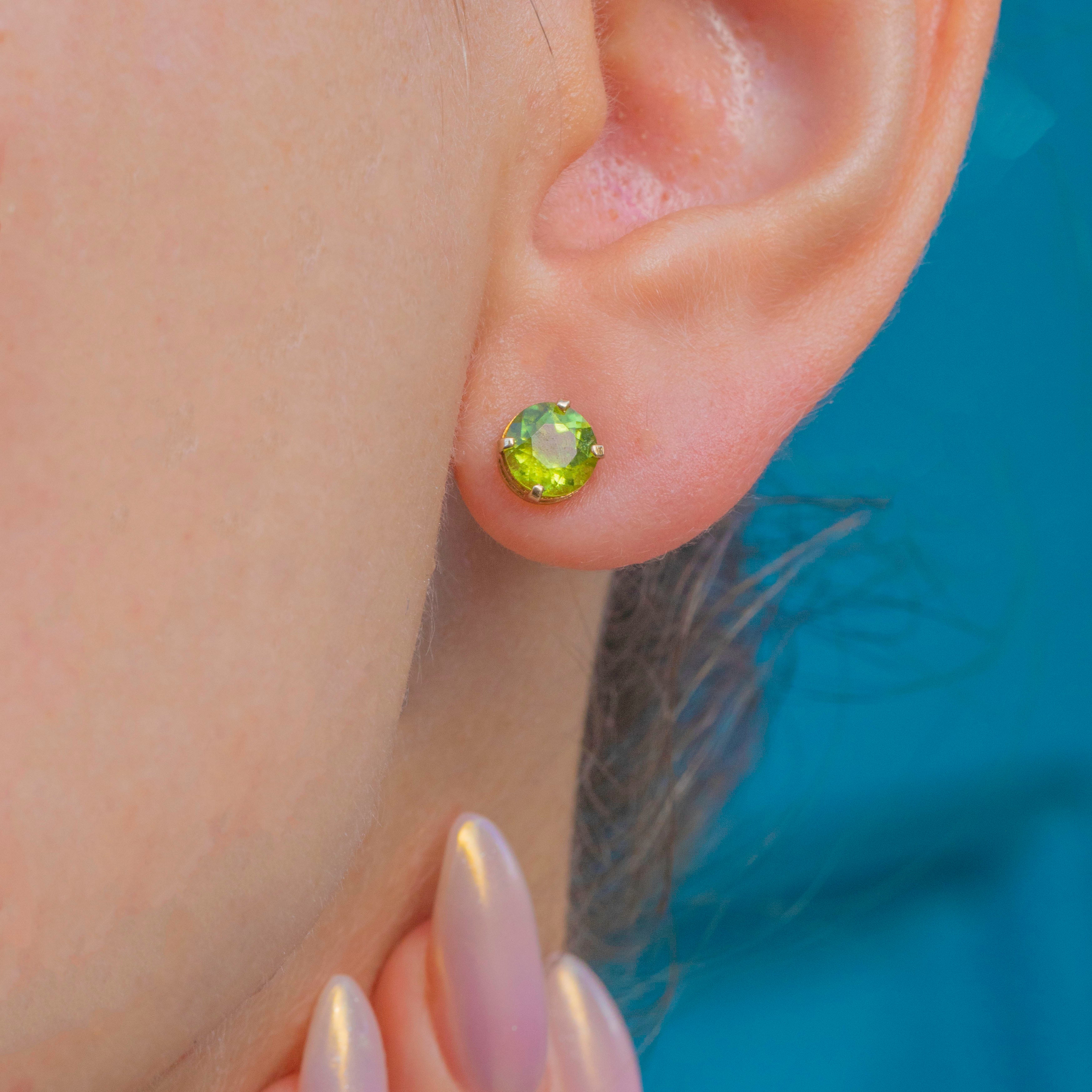 Classic and clean: a pair of bright Peridot studs set in warm 10ct Gold. Each round Peridot is 6mm across, well-matched in colour and cut, secured in neat four-claw settings.
