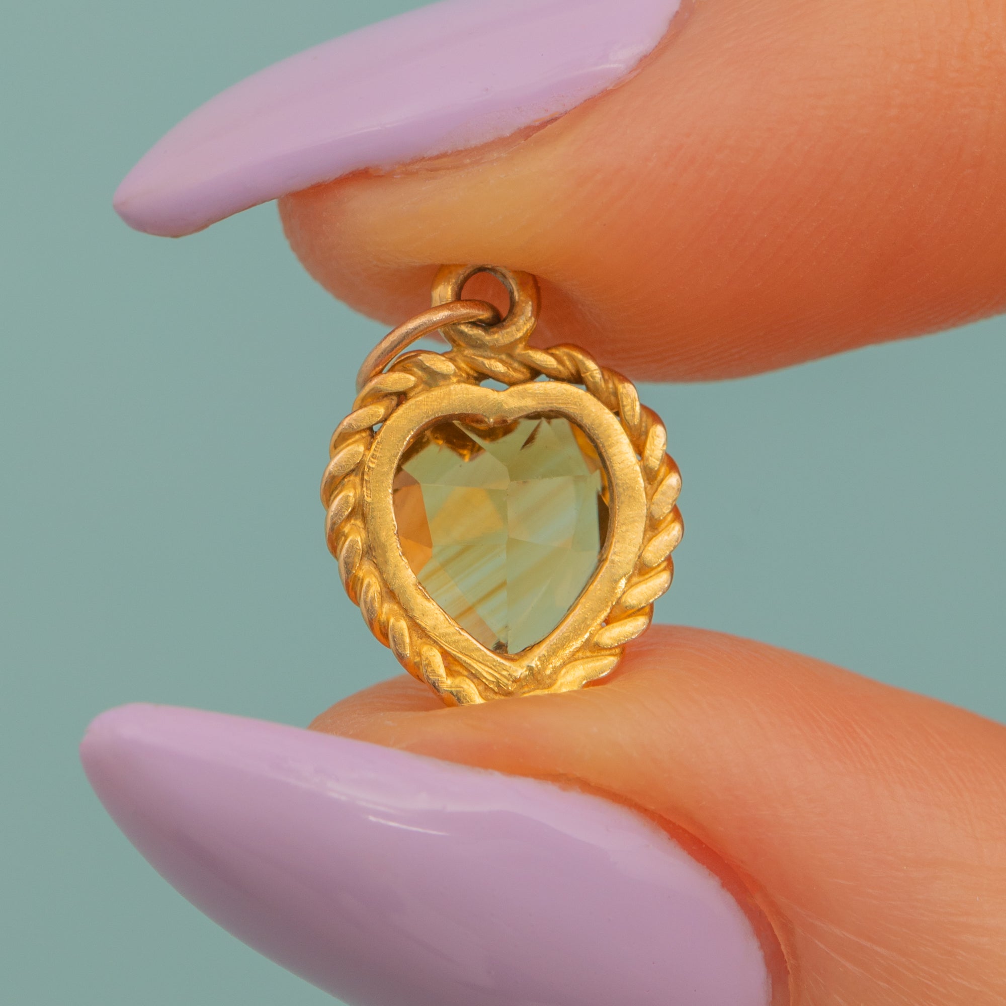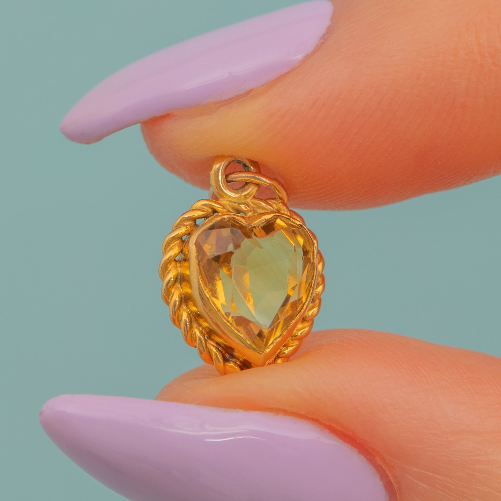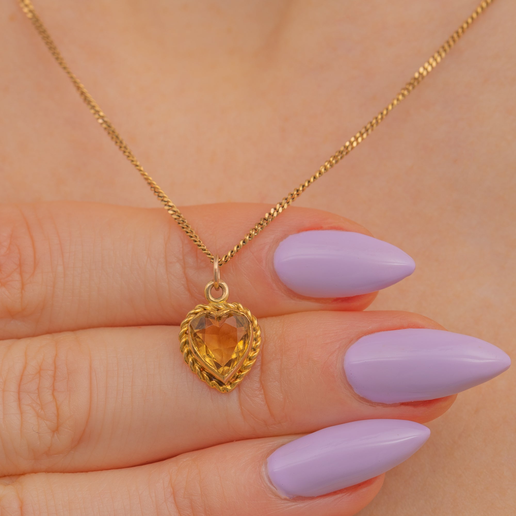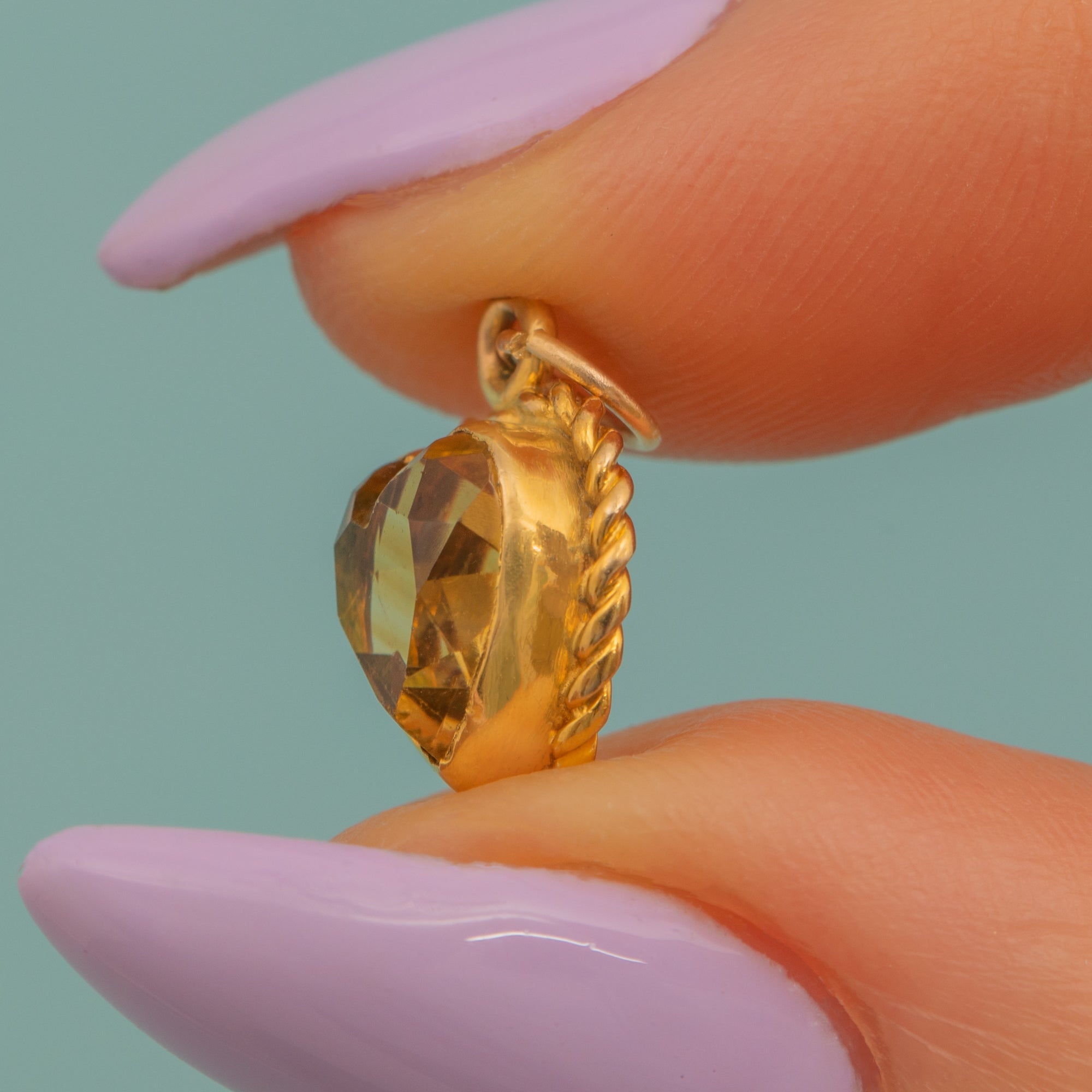 VERY GOOD-EXCELLENT: This 14ct Gold Citrine heart charm is in wonderful condition. The Citrine is wonderfully faceted and free from any scuffs or nibbles. The Gold is bright with only some minor wear around the edges of the bezel, but this is only noticeable under close inspection and the Citrine remains securely set. With a soldered jump ring, you can wear her with confidence!