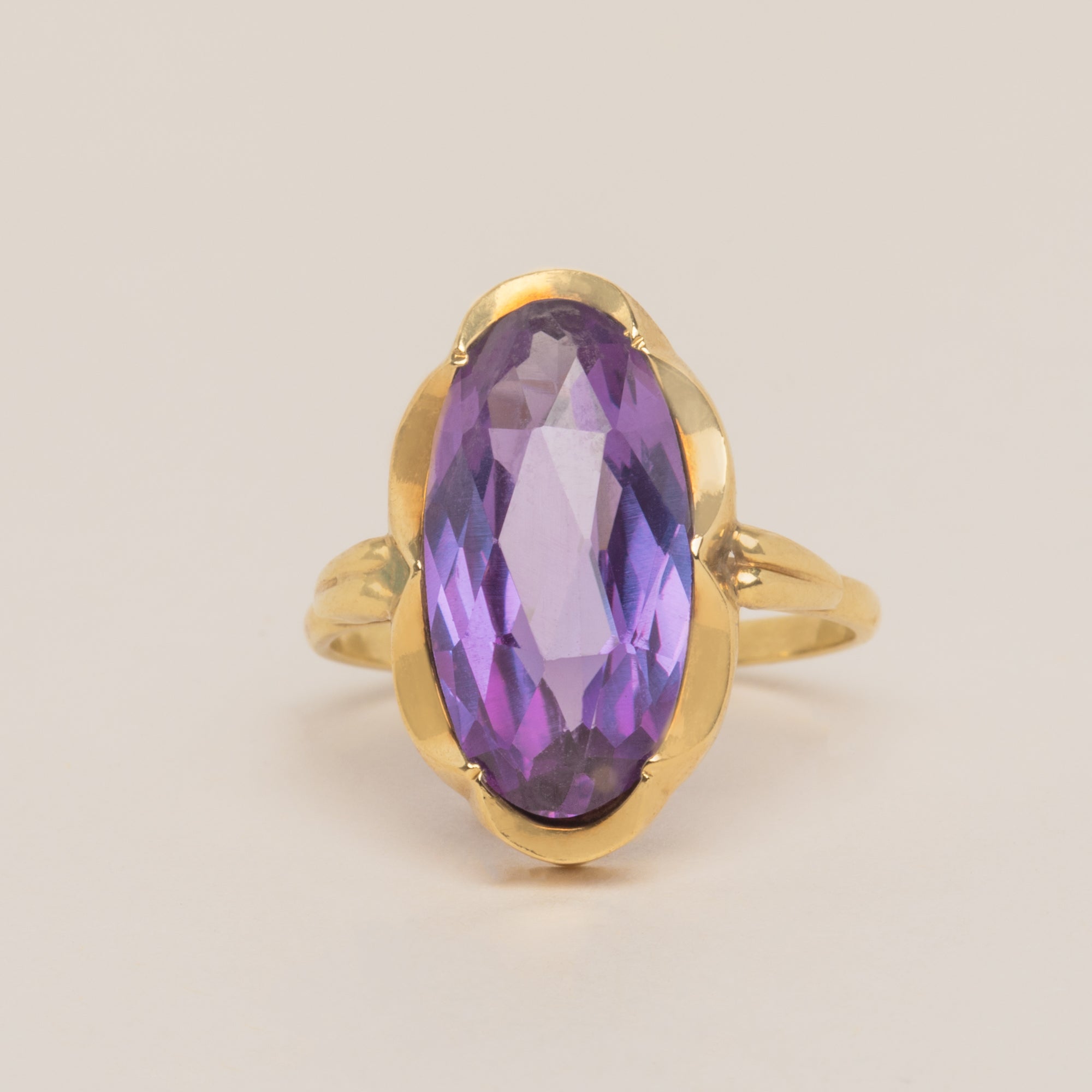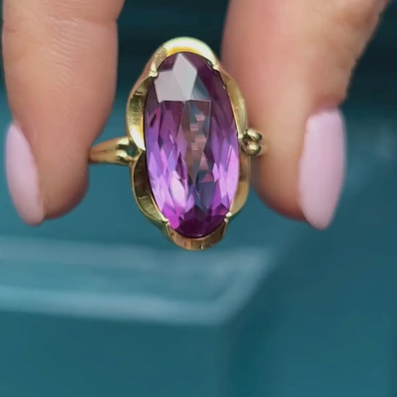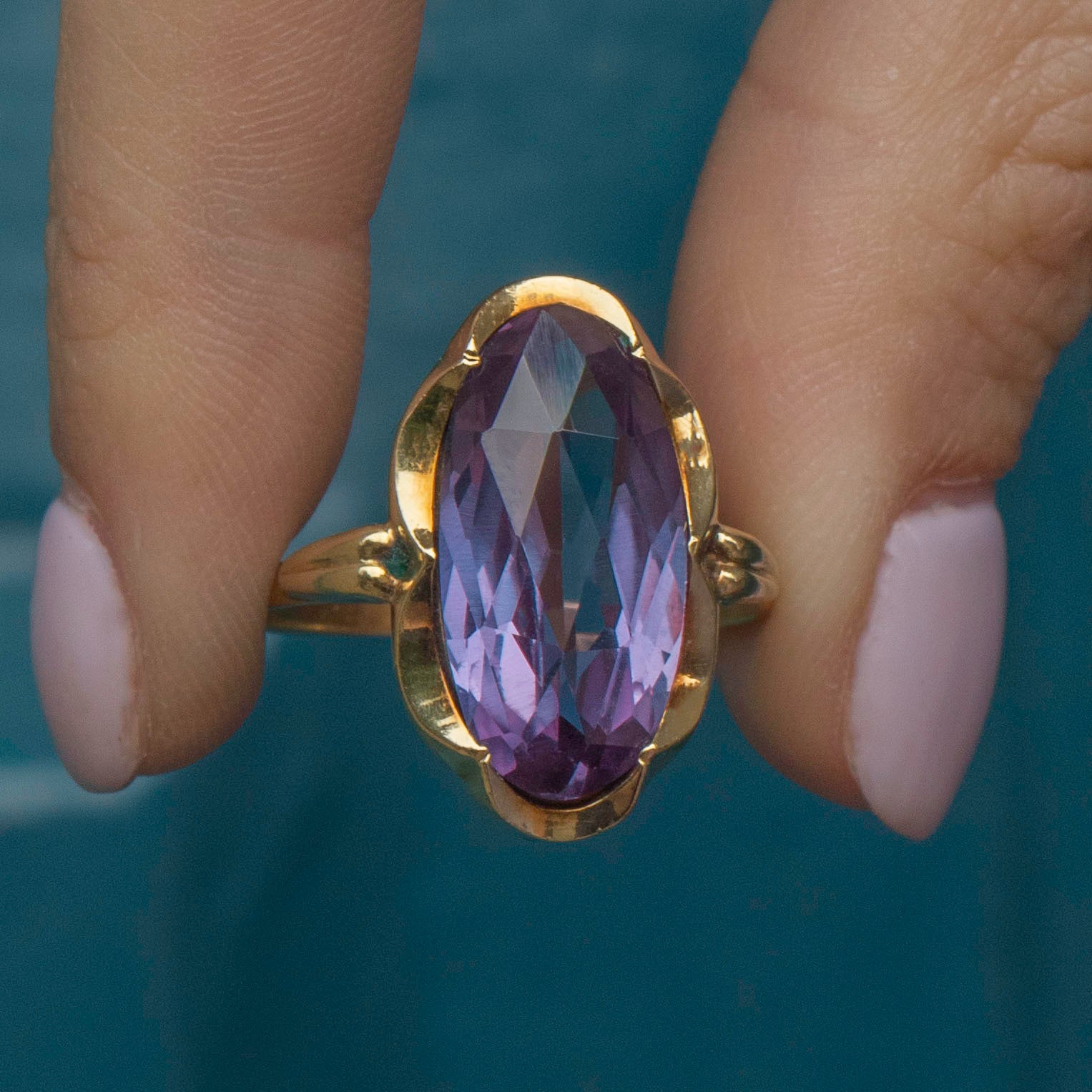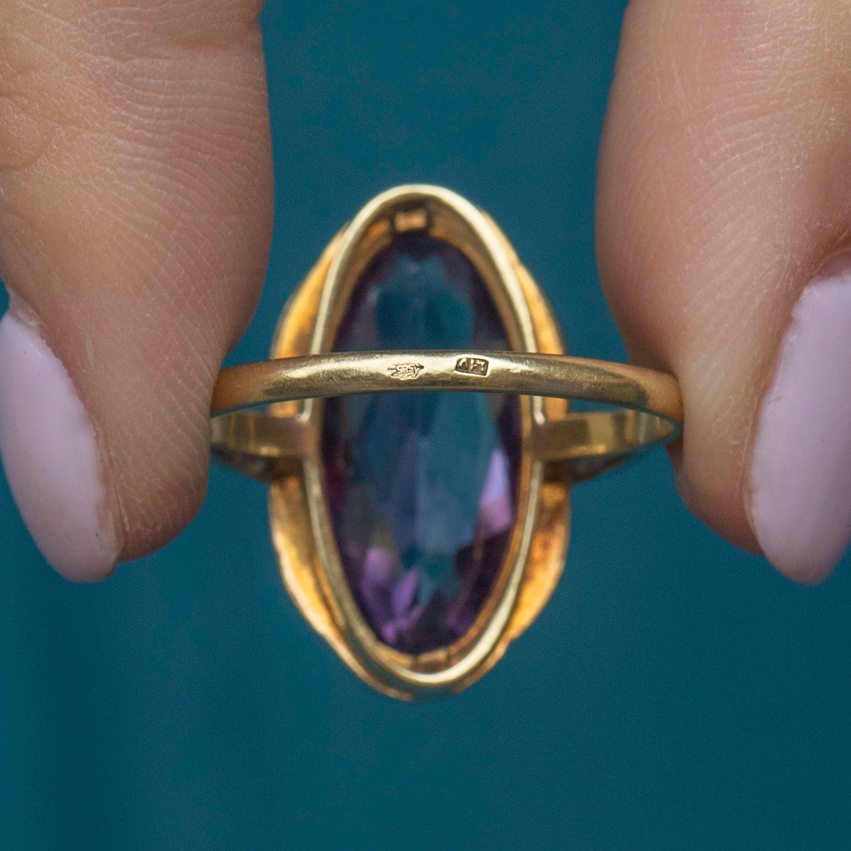 EXCELLENT This 14ct Gold Colour Change Sapphire cocktail ring is in excellent condition. The Sapphire is set securely into her Gold band and is pristine, with no chips or abrasions to note. The band has aged well over the years, with no scuffs or dings accrued. Displaying with clear hallmarks, this sensational vintage Dutch ring is sure to turn heads!