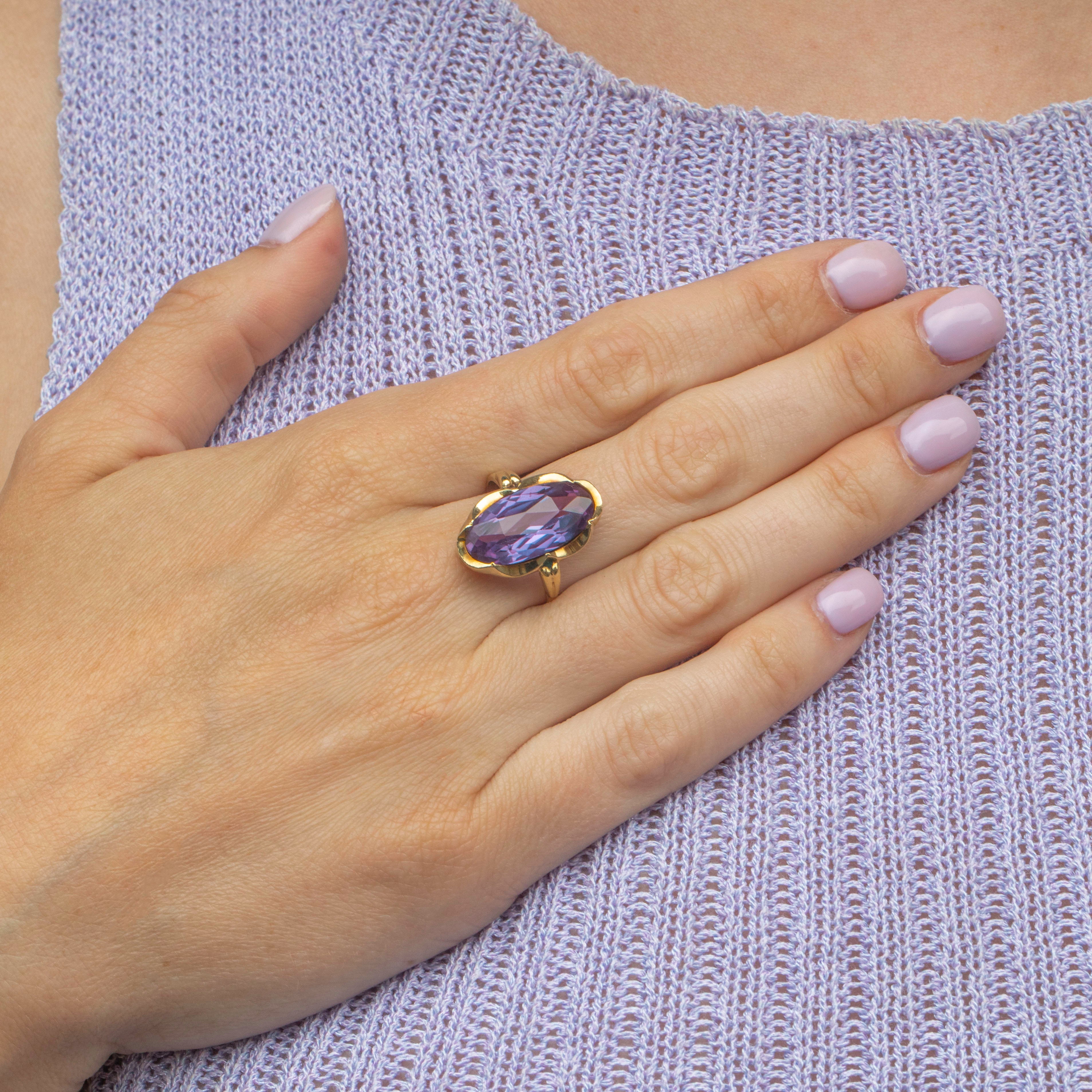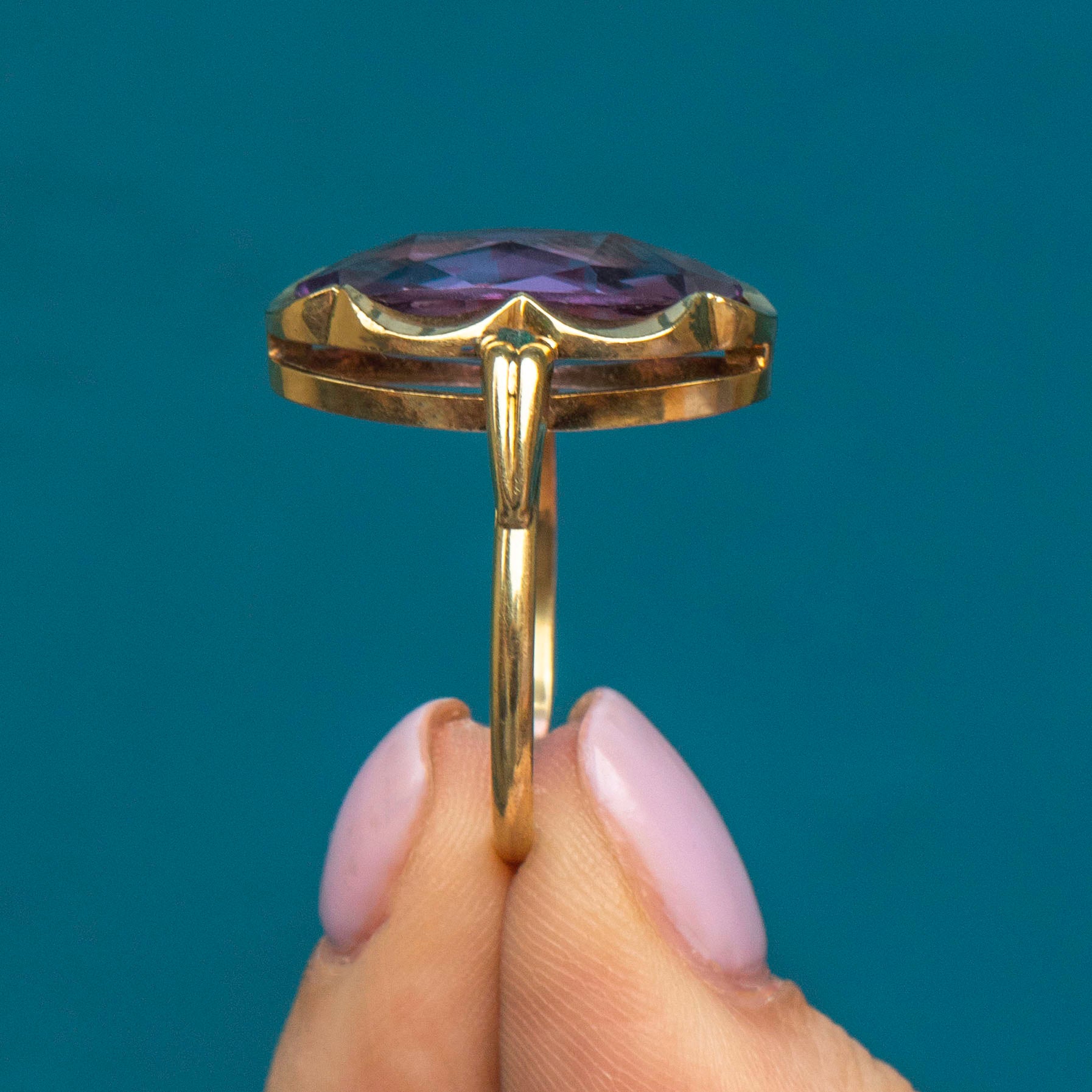 What a bold statement this 14ct Gold Colour Change Sapphire cocktail ring makes! Boasting a whopping 7.10ct, the synthetic colour change Sapphire's facets display a rich purple hue with interchanging flashes of deep sea blue, sure to mesmerise anyone who casts their eyes on her.