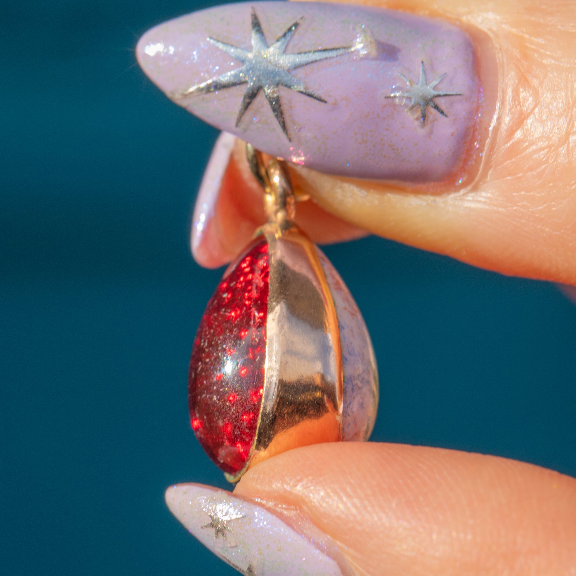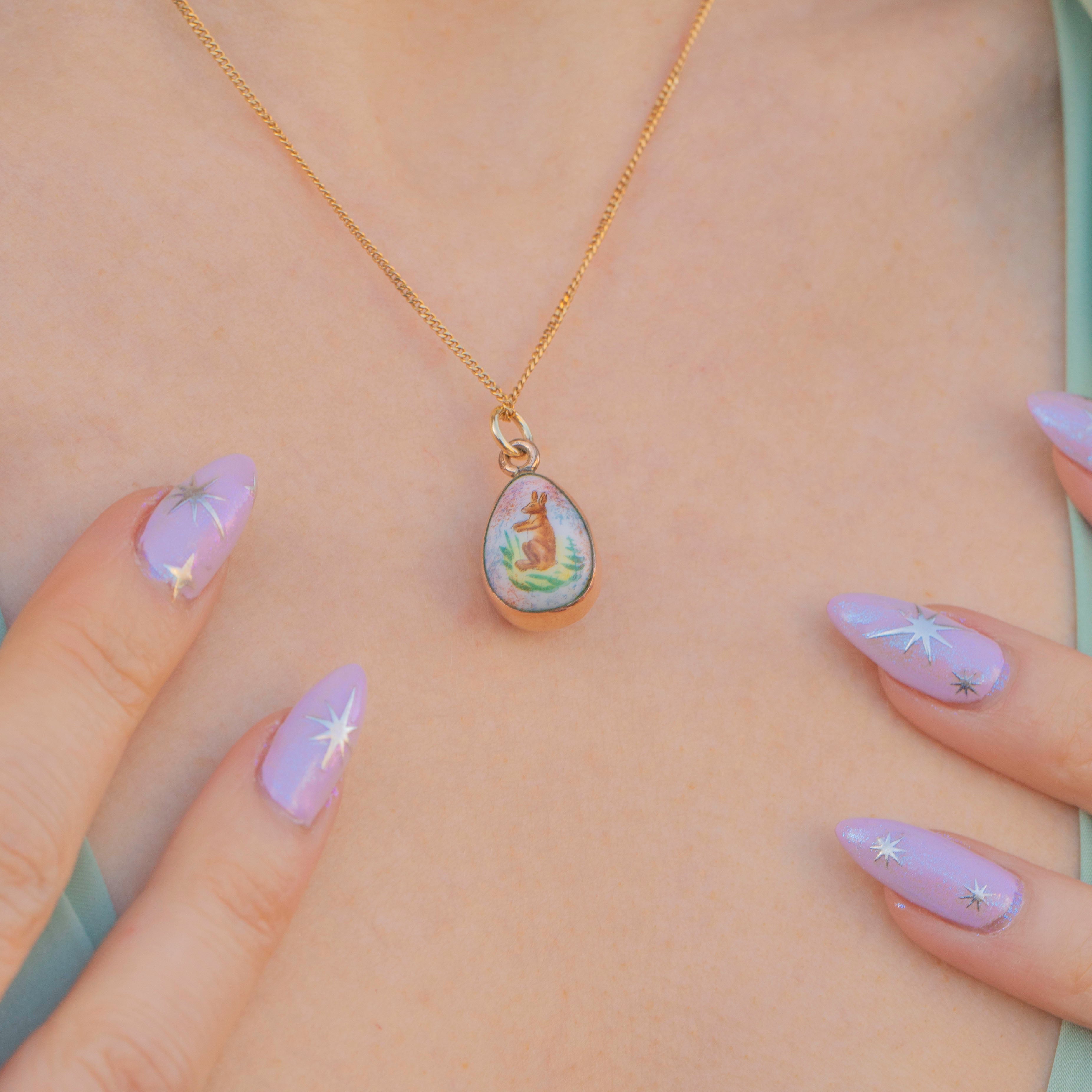 One side depicts a characterful bunny perched amongst foliage, with an intricately dappled sky adding bundles of charm - the level of detail achieved is truly remarkable. The other side is deep crimson and shimmers in the light, complemented by buttery Gold creating a seductive and luxurious colour palette. Offering you two pieces in one, this vintage Enamel egg pendant can be styled however you please!