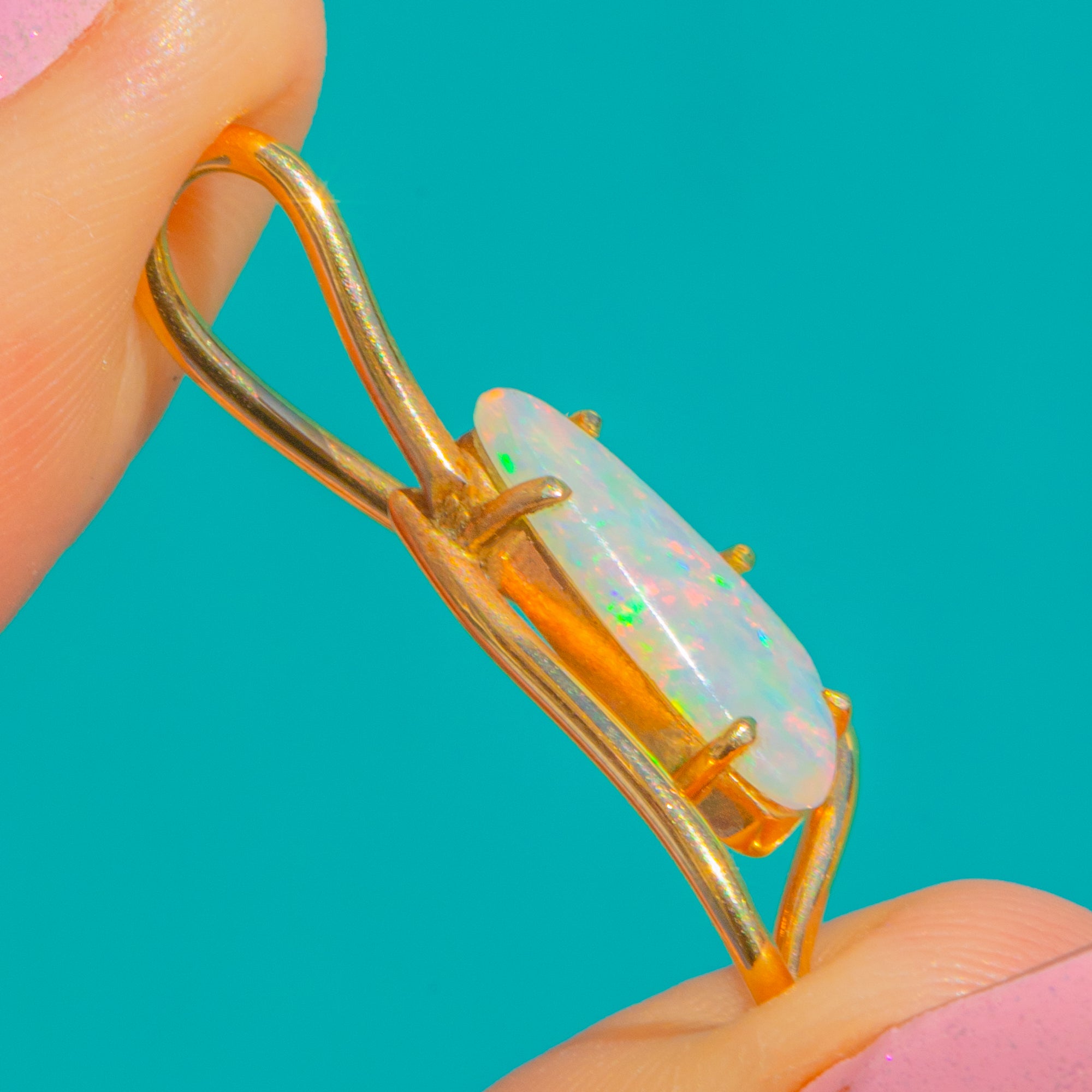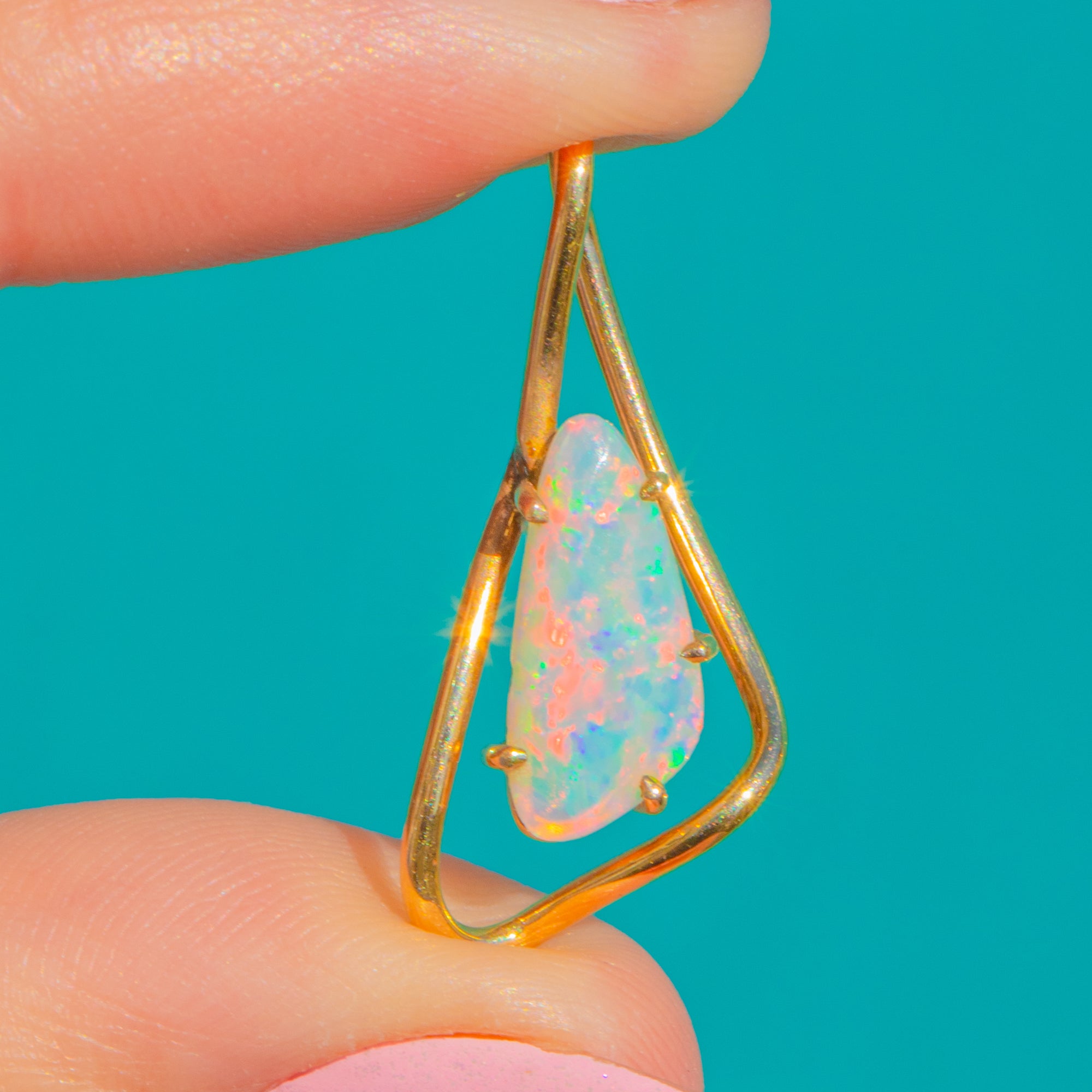 A sleek Mid-Century “Loupe” pendant crafted in 14ct Gold, this piece spotlights a freeform Opal cabochon alive with pink, green, blue and peachy-orange flashes. Its luminous play-of-colour glows against the warm Gold, creating a quietly luxurious focal point.
