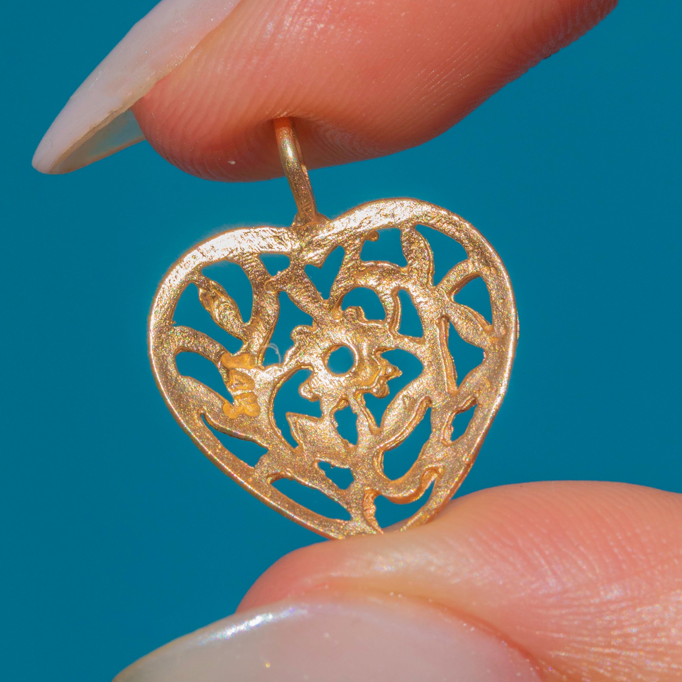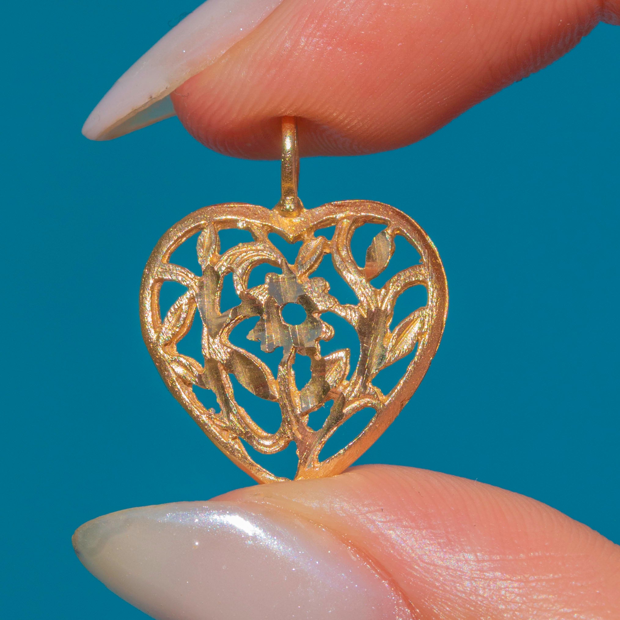 EXCELLENT. The Gold is brightly saturated, and the details are pristine with no dings or scuffs. The bale is securely soldered, so you can wear this vintage heart pendant with absolute confidence!