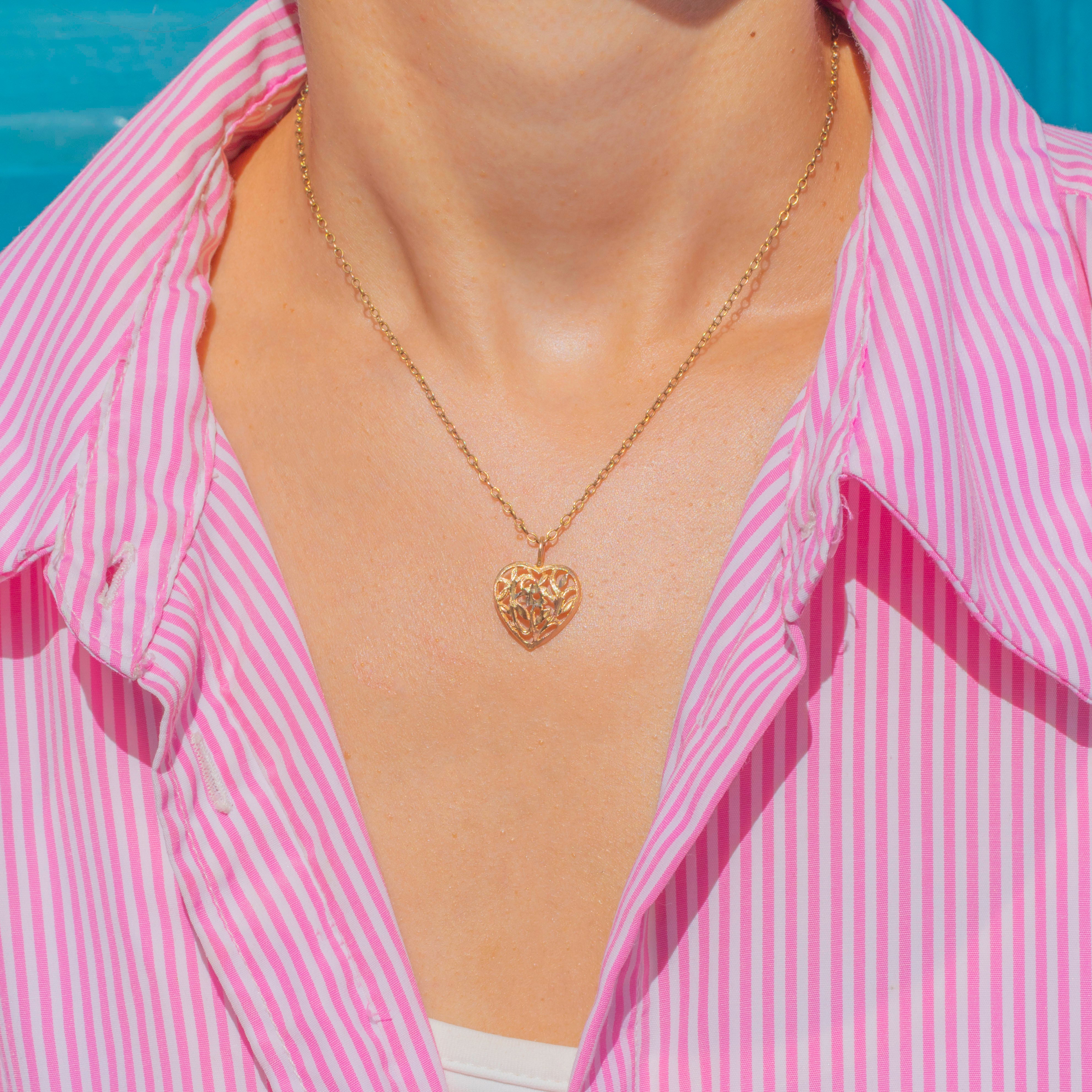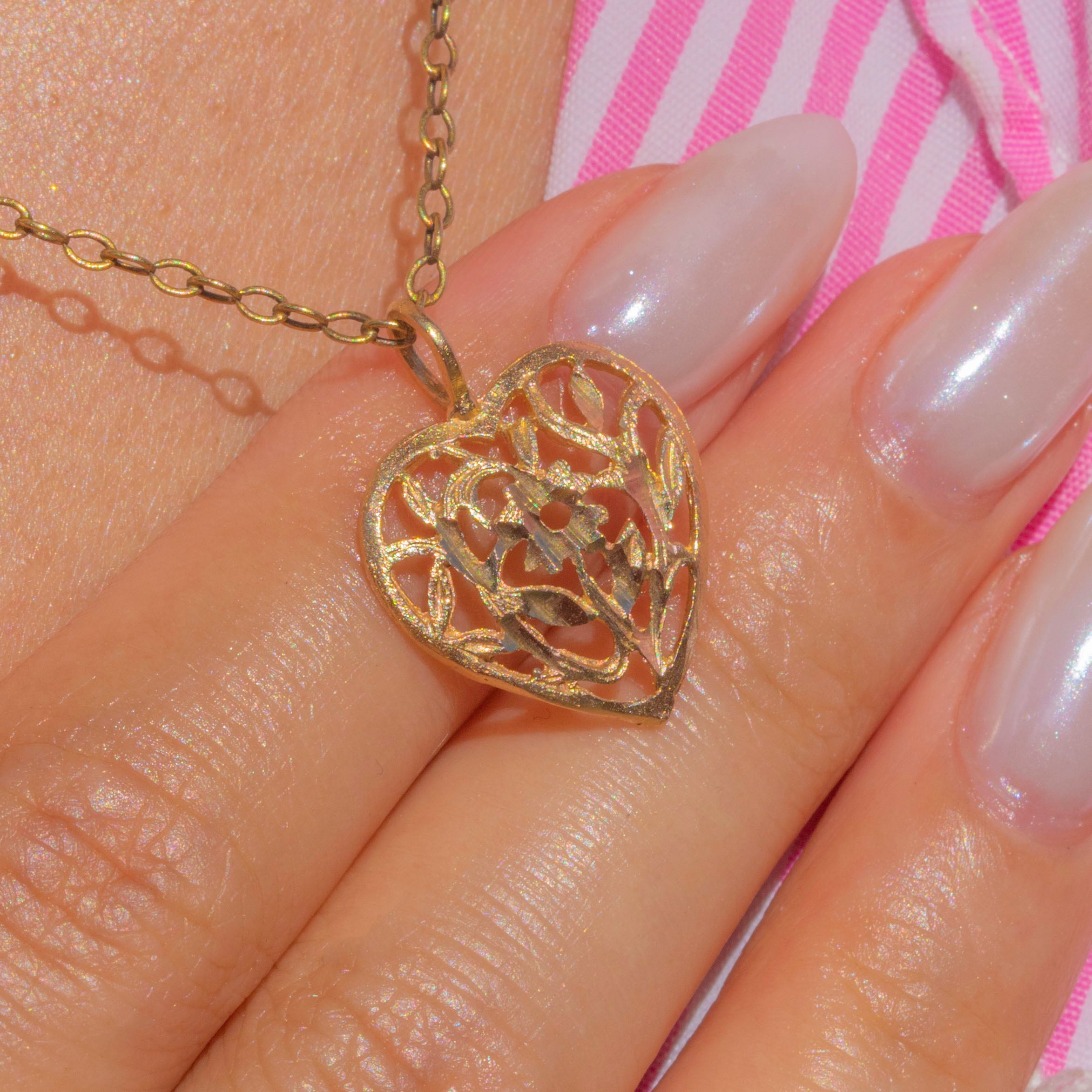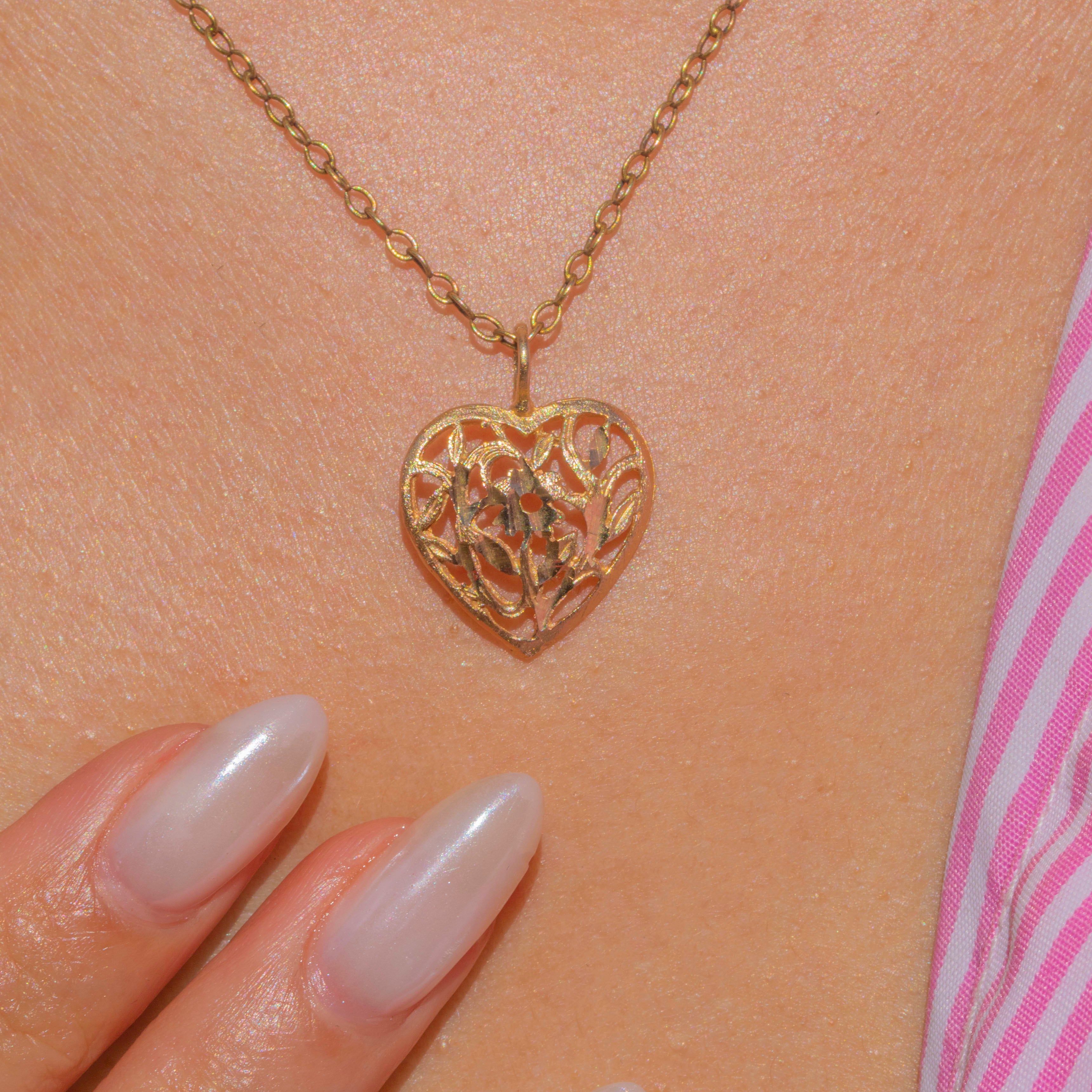 This vintage Gold heart pendant combines everything we love, florals and romance, and is the perfect lightweight piece for everyday wear.