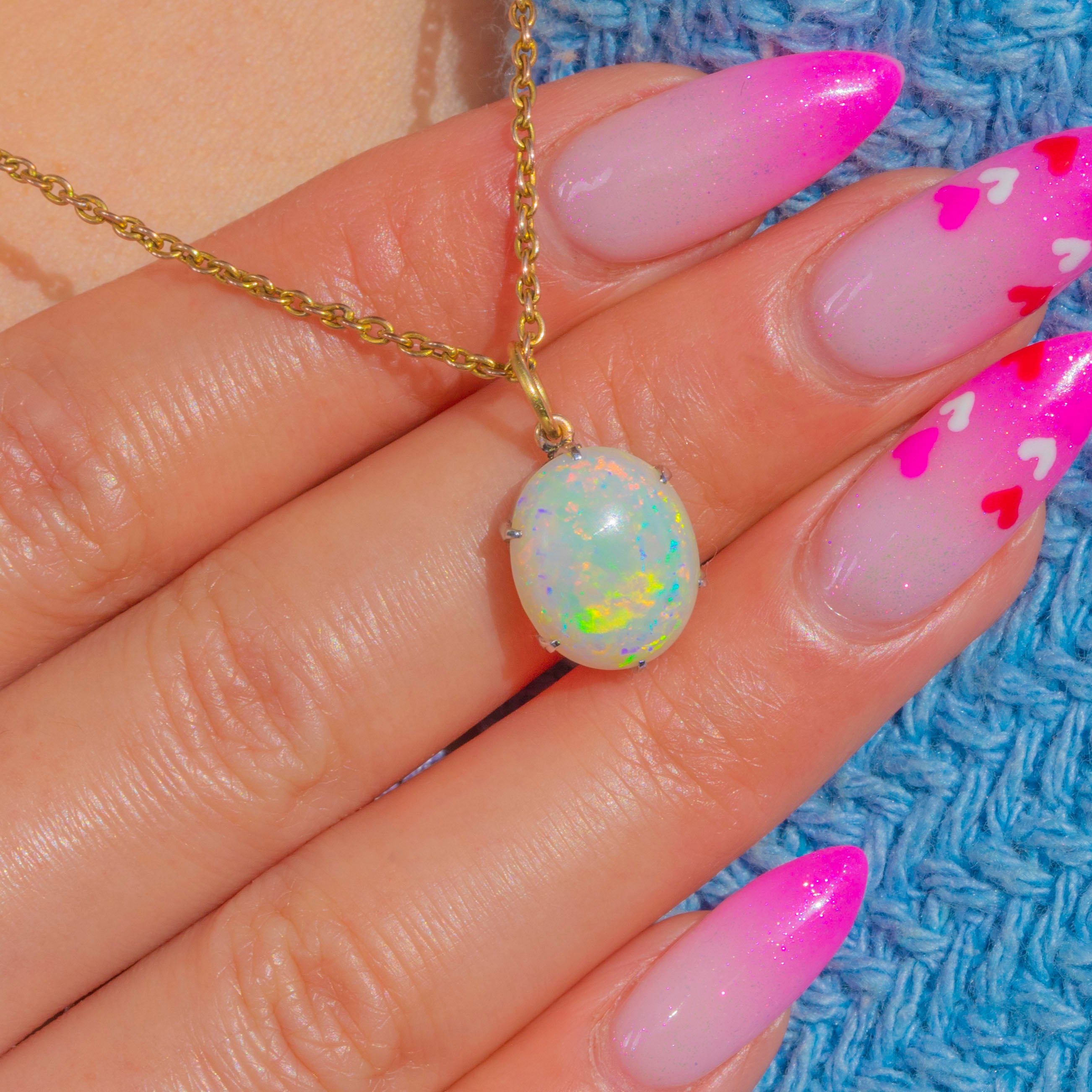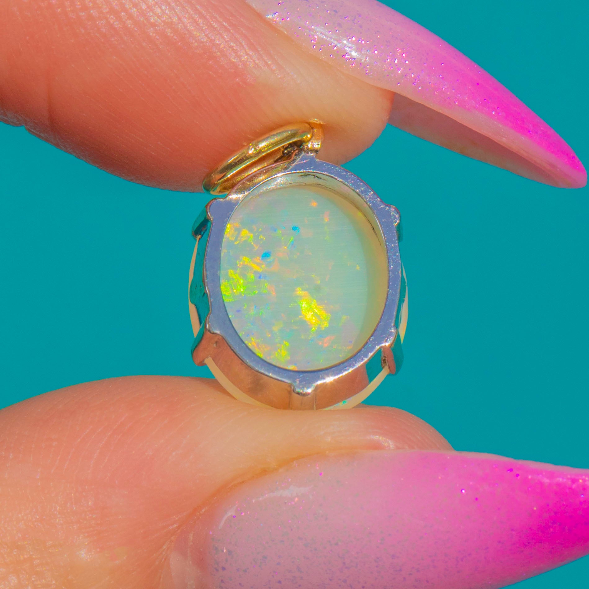 A luminous Opal cabochon takes centre stage in this sleek Vintage charm, alive with flashes of emerald green, electric blue, warm golden orange and delicate pink. Its minimalist solitaire design lets the gemstone’s captivating play-of-colour sing, a timeless piece you’ll reach for again and again.
