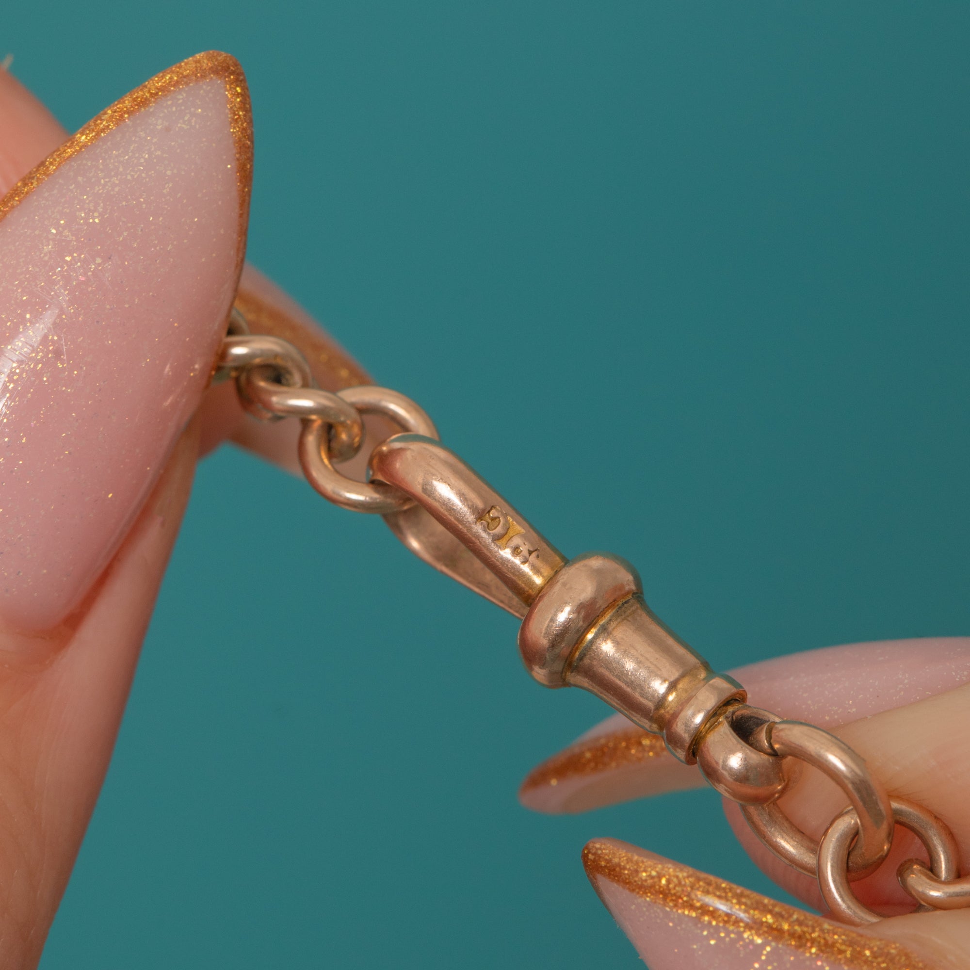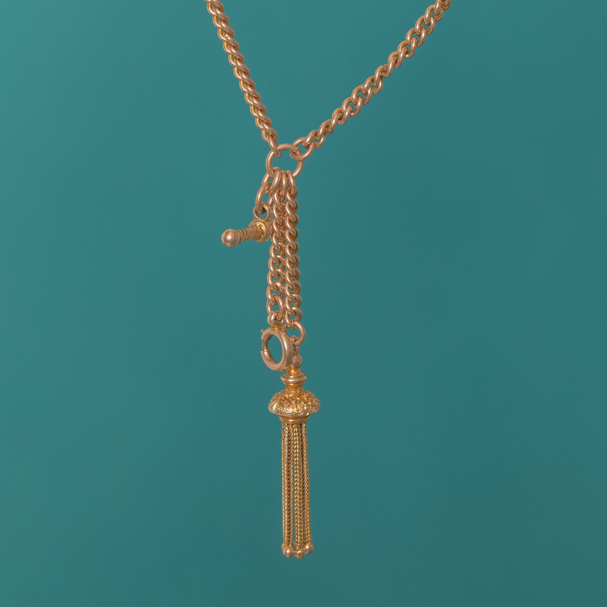 A magnificent Victorian 9ct Gold curb chain showcasing all the charm of the era — a substantial weight, beautiful buttery Gold tone and a cascade of original antique fittings. At the centre hangs a wonderful trio: a tassel drop, a bolt-ring dangle and a fancy T-bar, all moving gracefully with the wearer and adding layers of texture and antique detail.