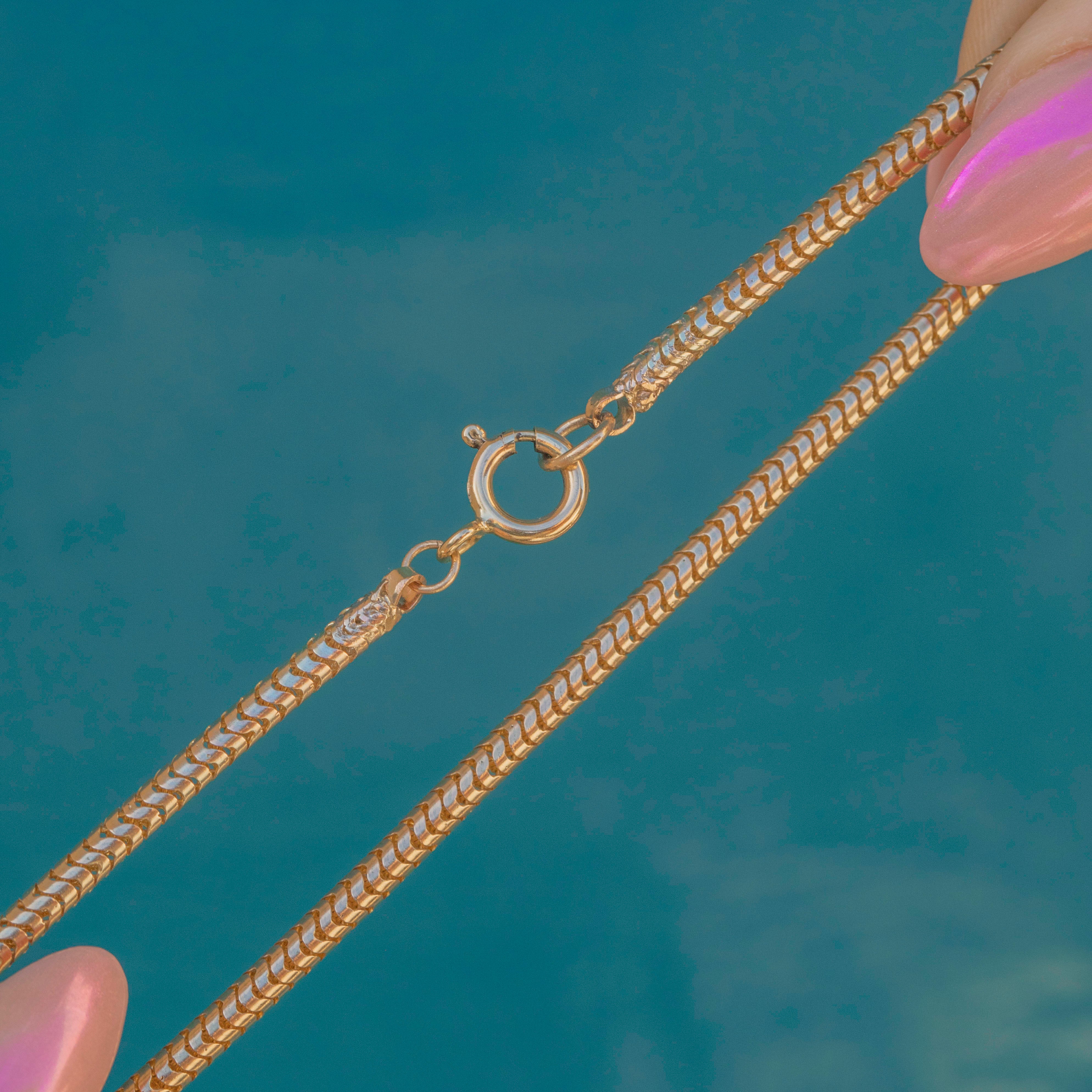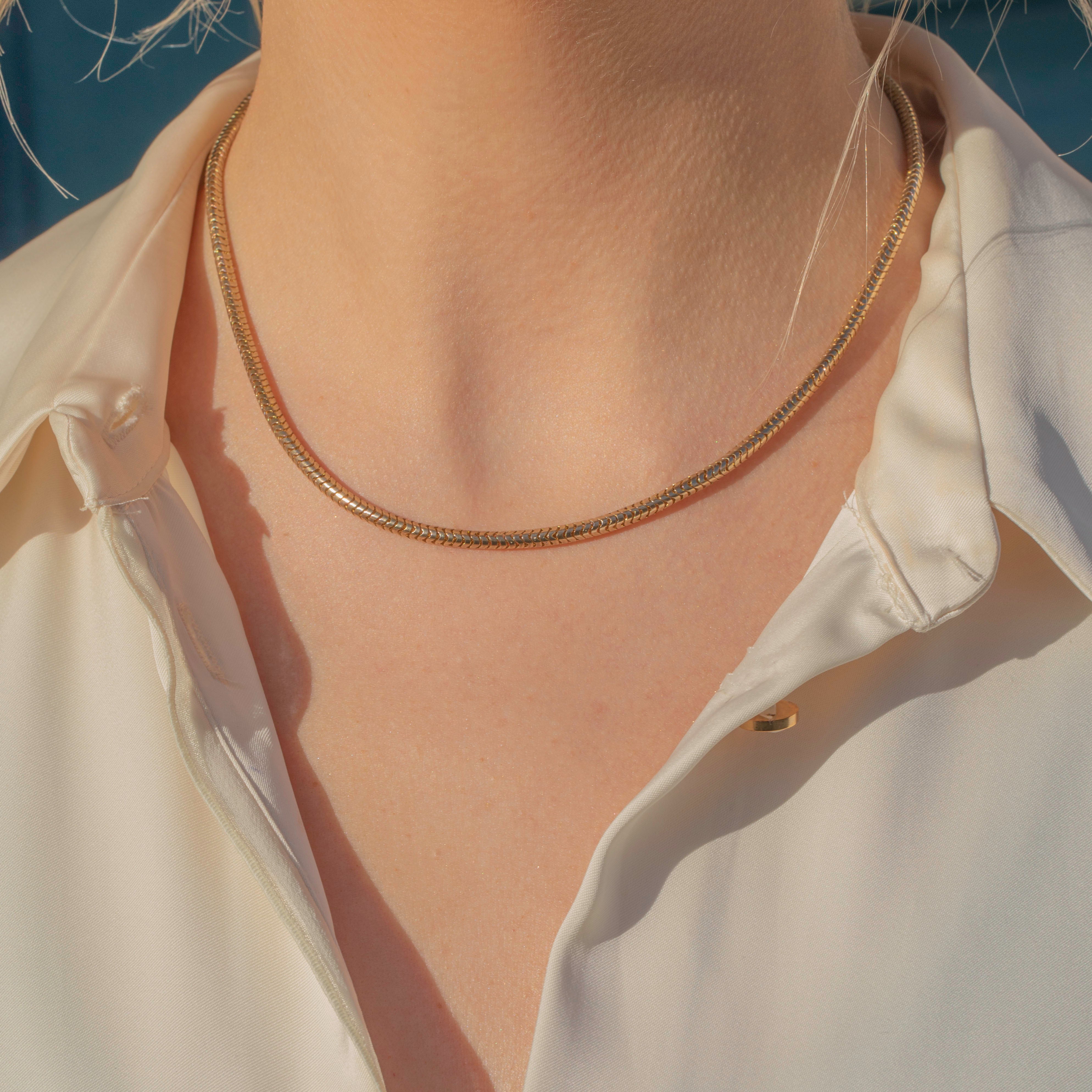 Crafted entirely from buttery 9ct Gold, the sumptuous glow and slinky touch of snake chains cannot be matched! Measuring at an elegant 15.5 inches, this 9ct Gold chain is perfect for framing your décolletage with golden beauty.