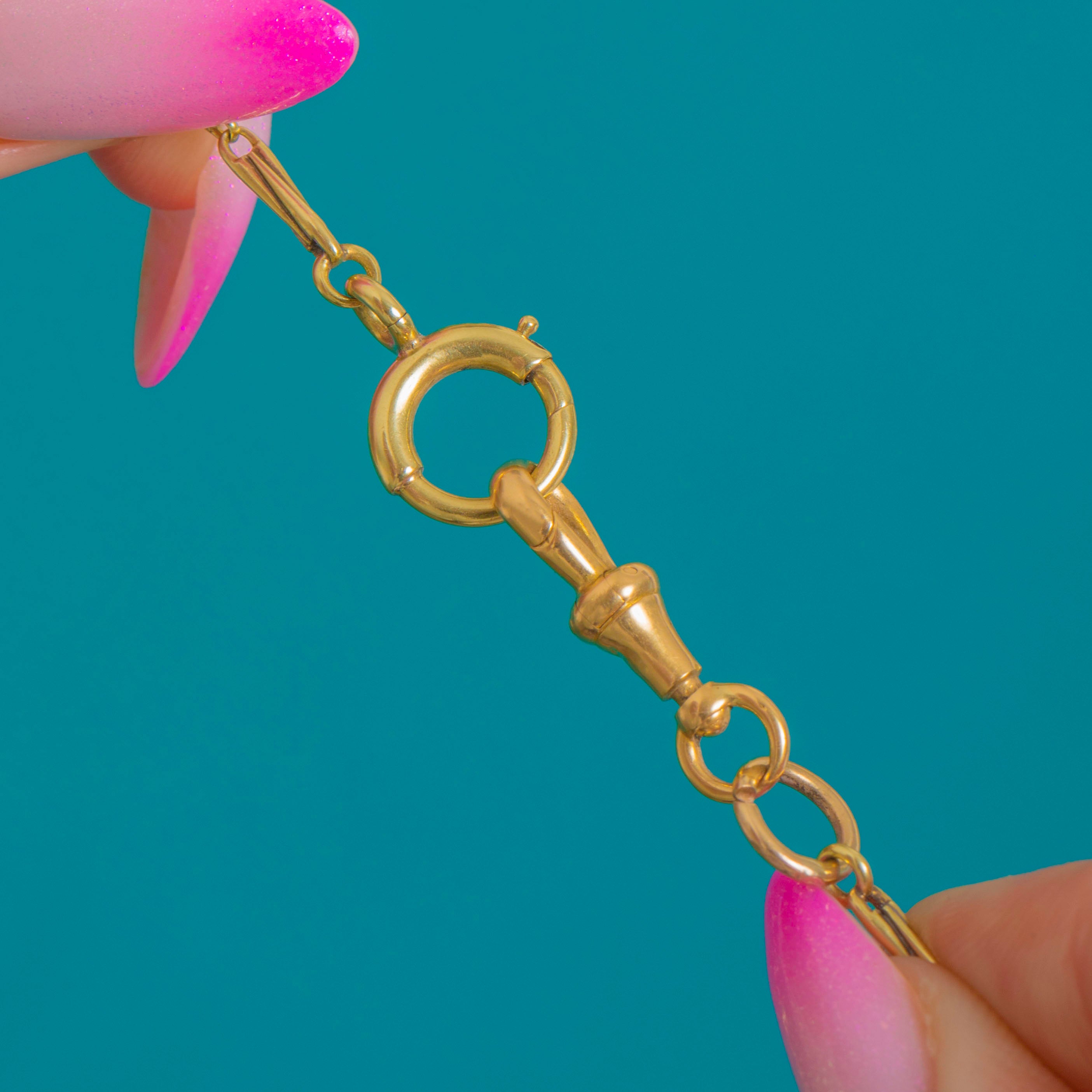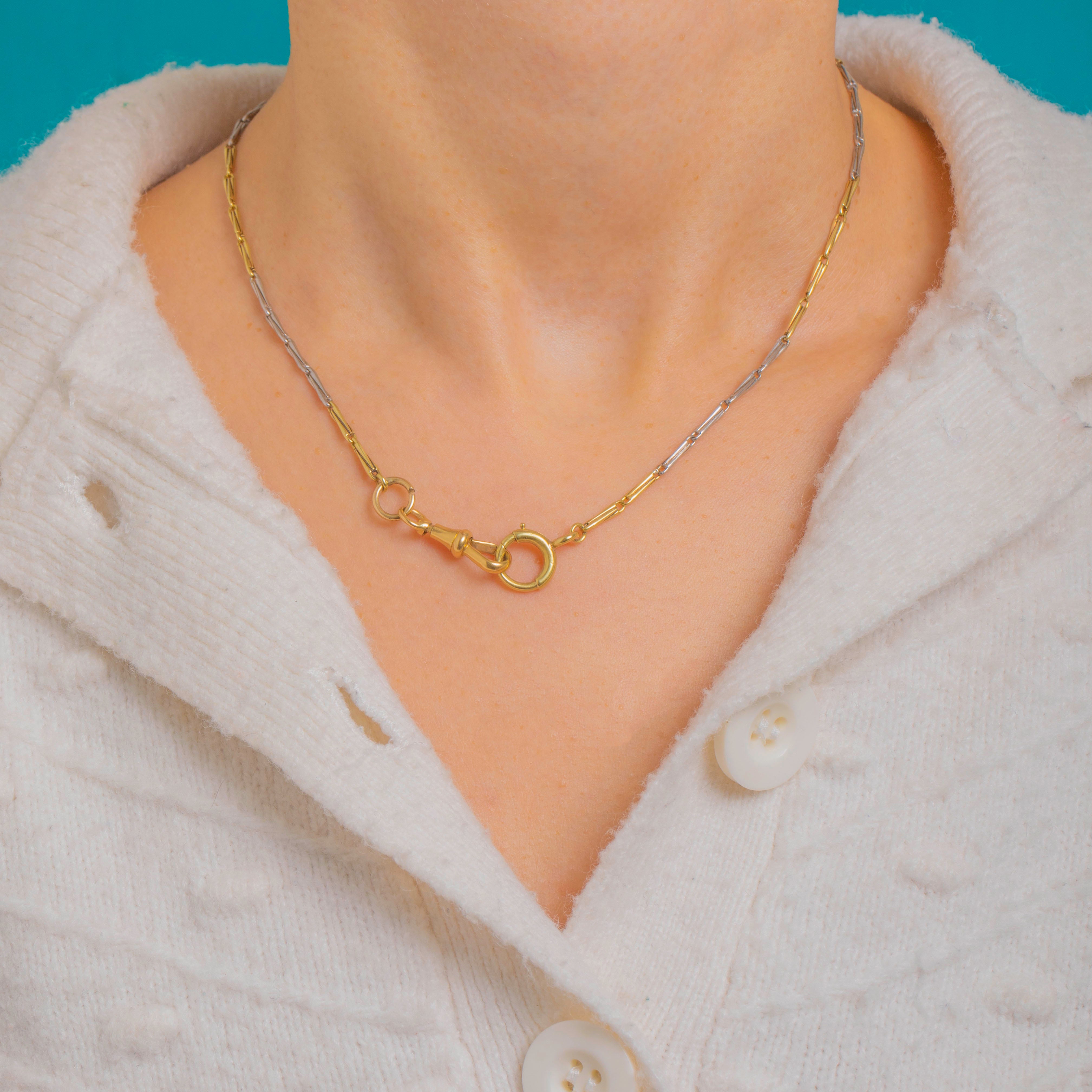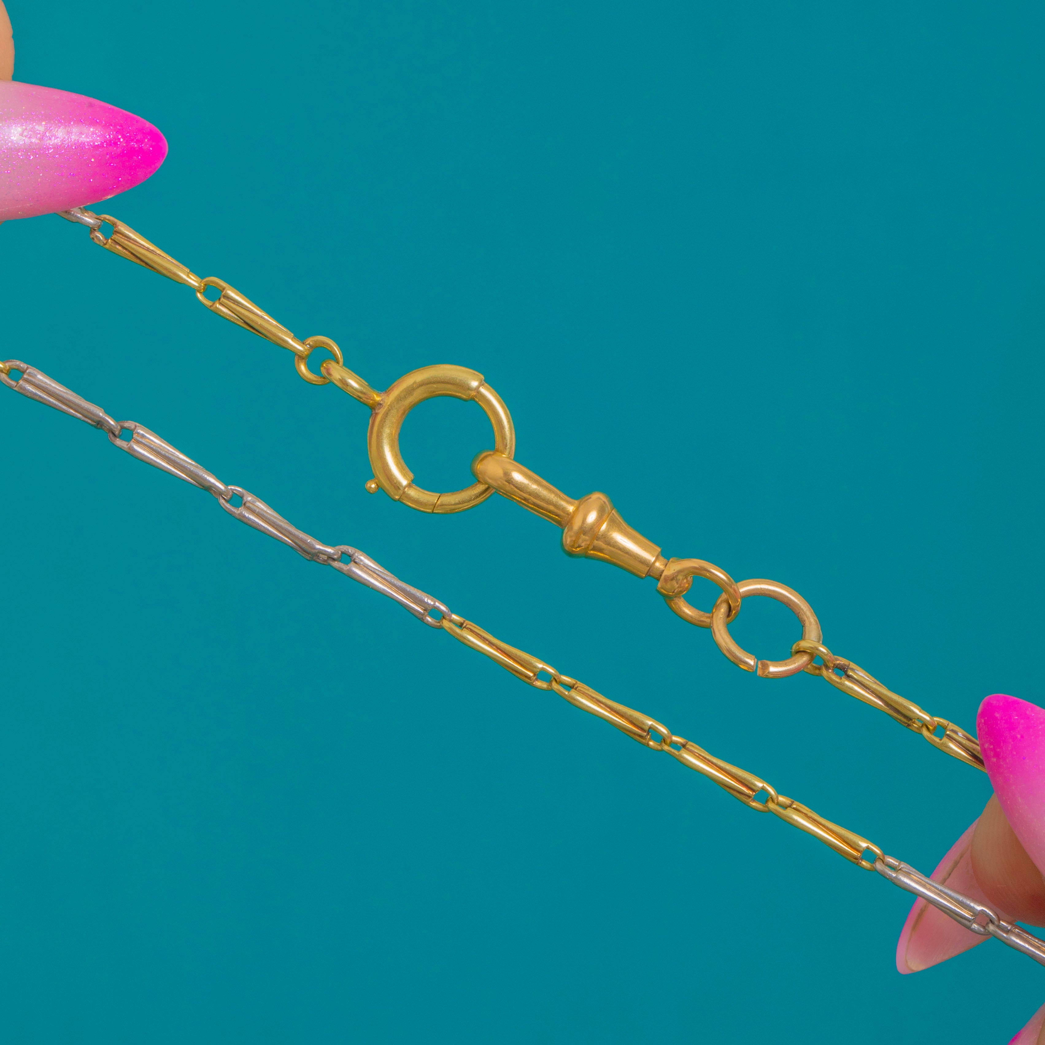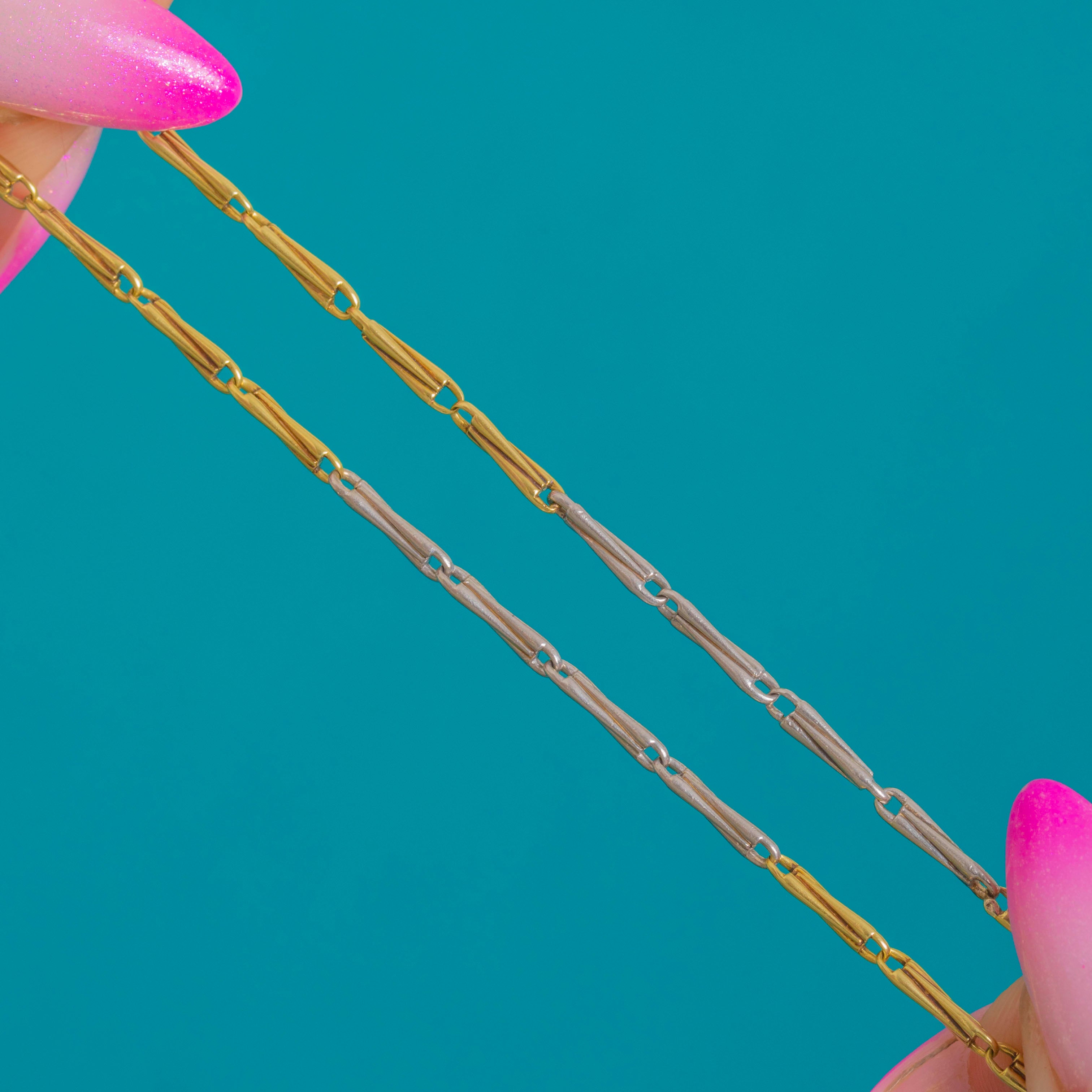 A timeless Victorian fancy chain rendered in luxurious 18ct Yellow Gold and Platinum. Alternating elongated bar links create a sleek geometric rhythm, the warm glow of Gold playing beautifully against cool Platinum for an effortlessly elegant two-tone look.