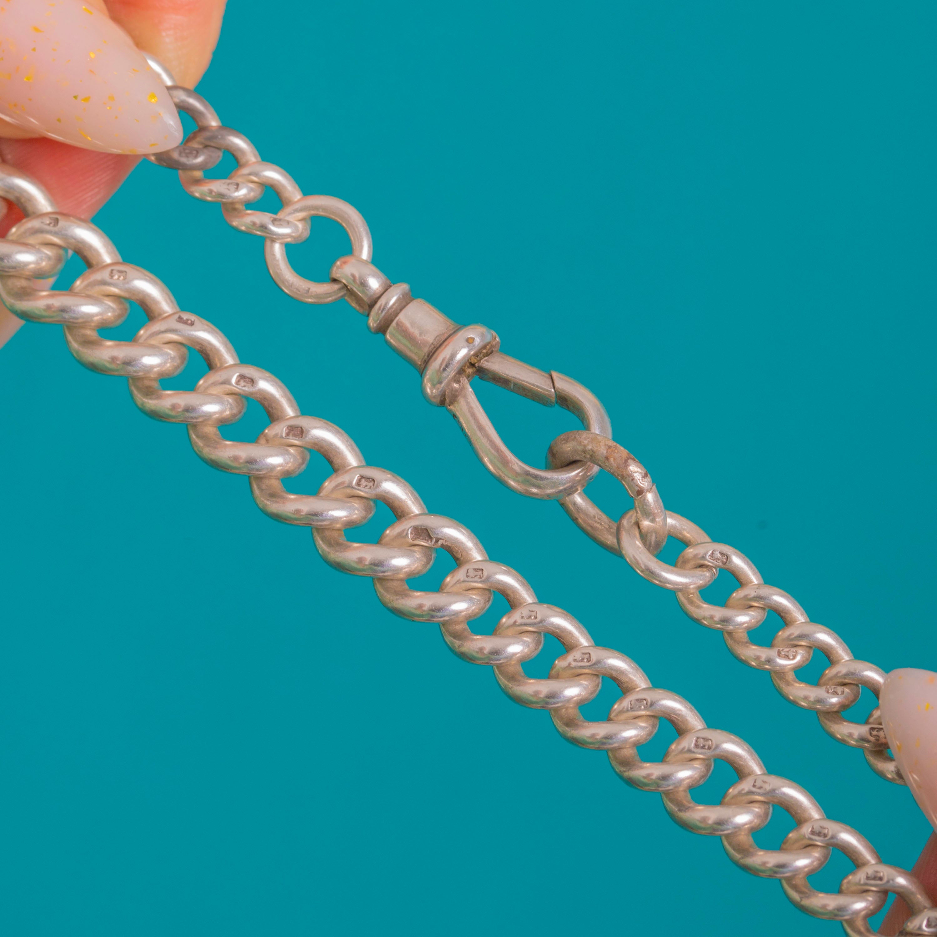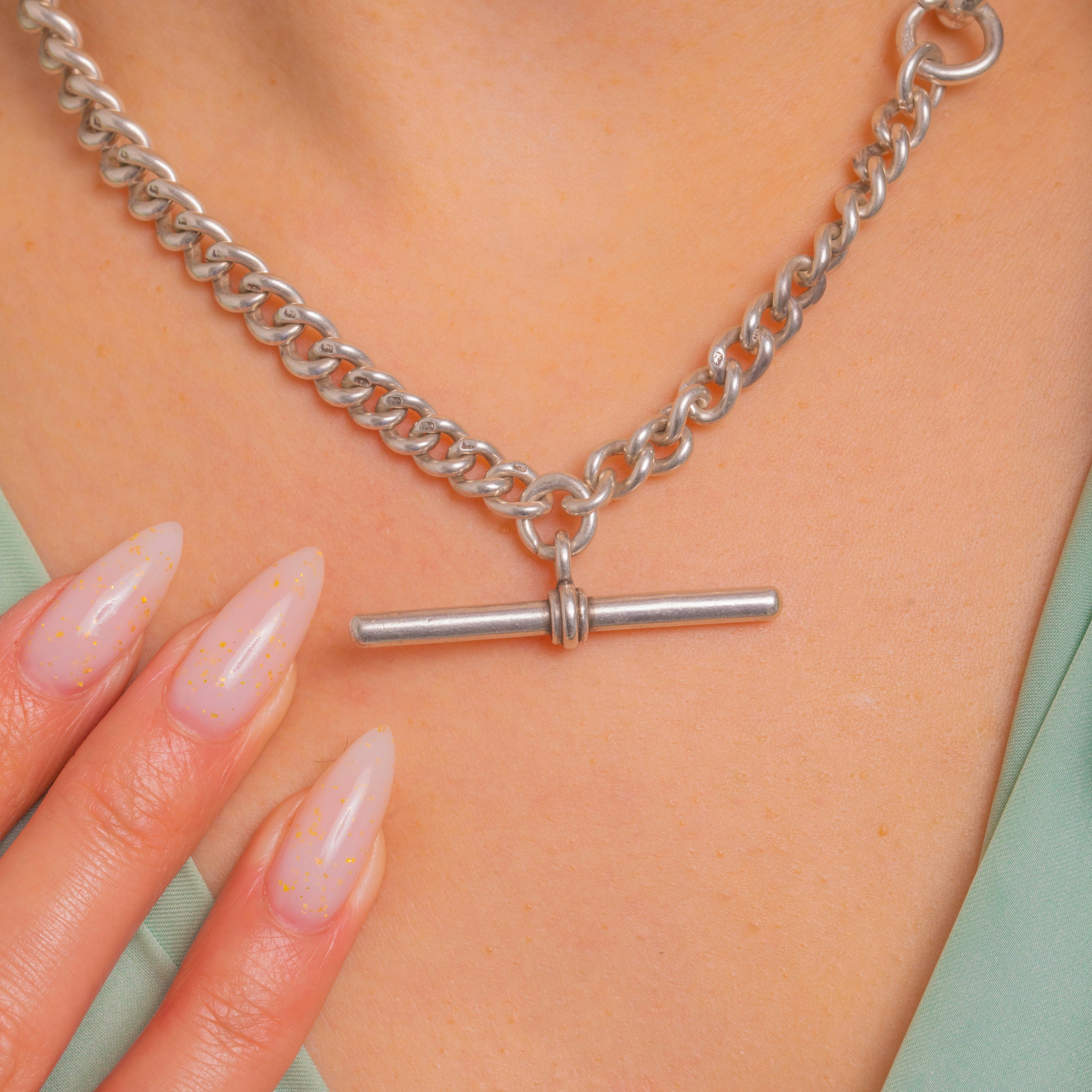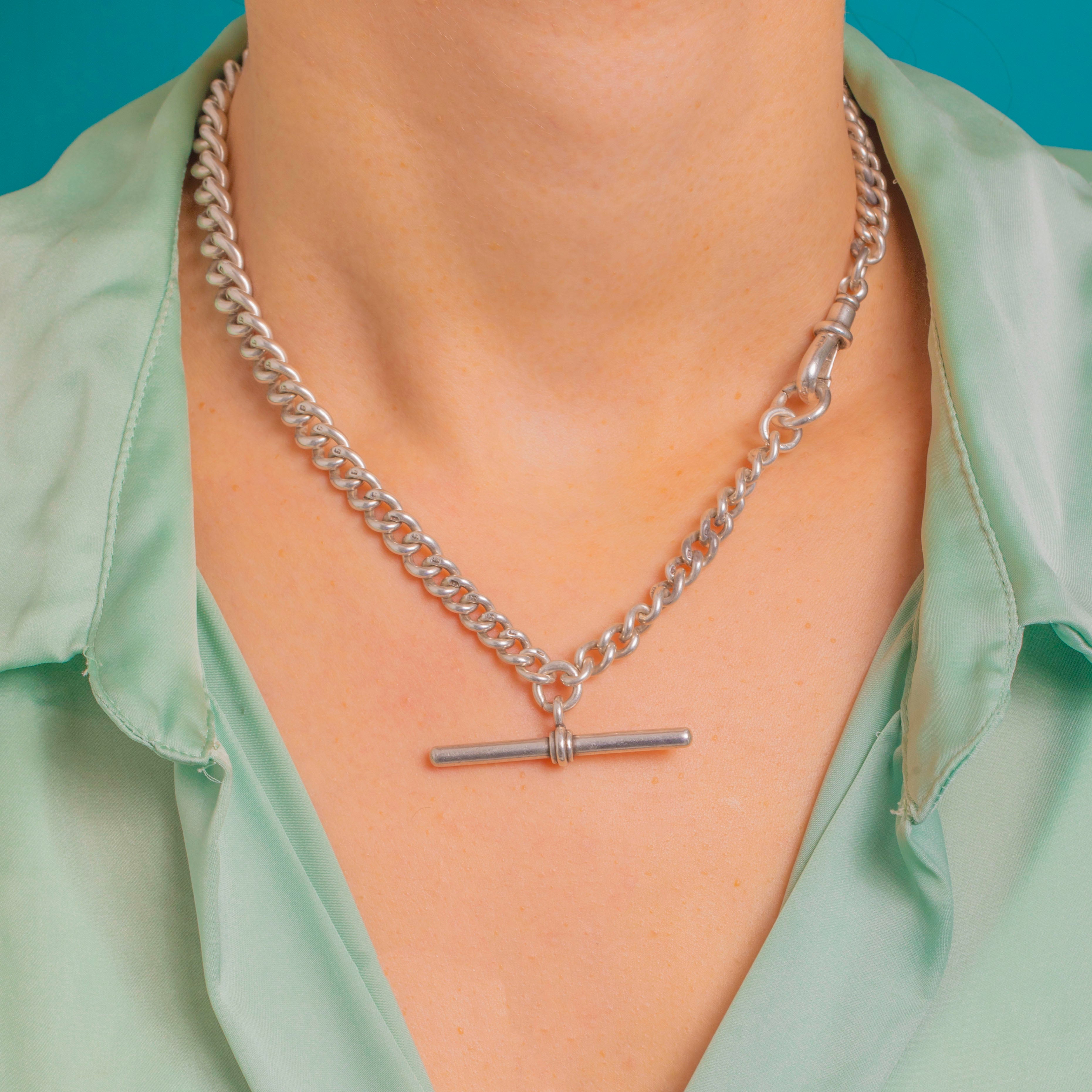 A classic Victorian Albert chain, transformed into a striking short necklace with a bold curb-link profile and central T-bar drop. The solid, soldered links and dog-clip clasp bring that clean, utilitarian elegance collectors love, while the mellow patina adds depth and character.