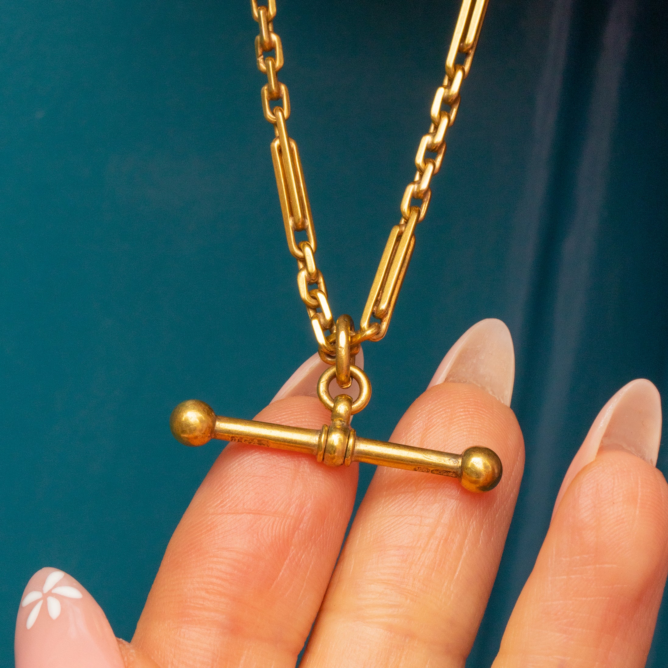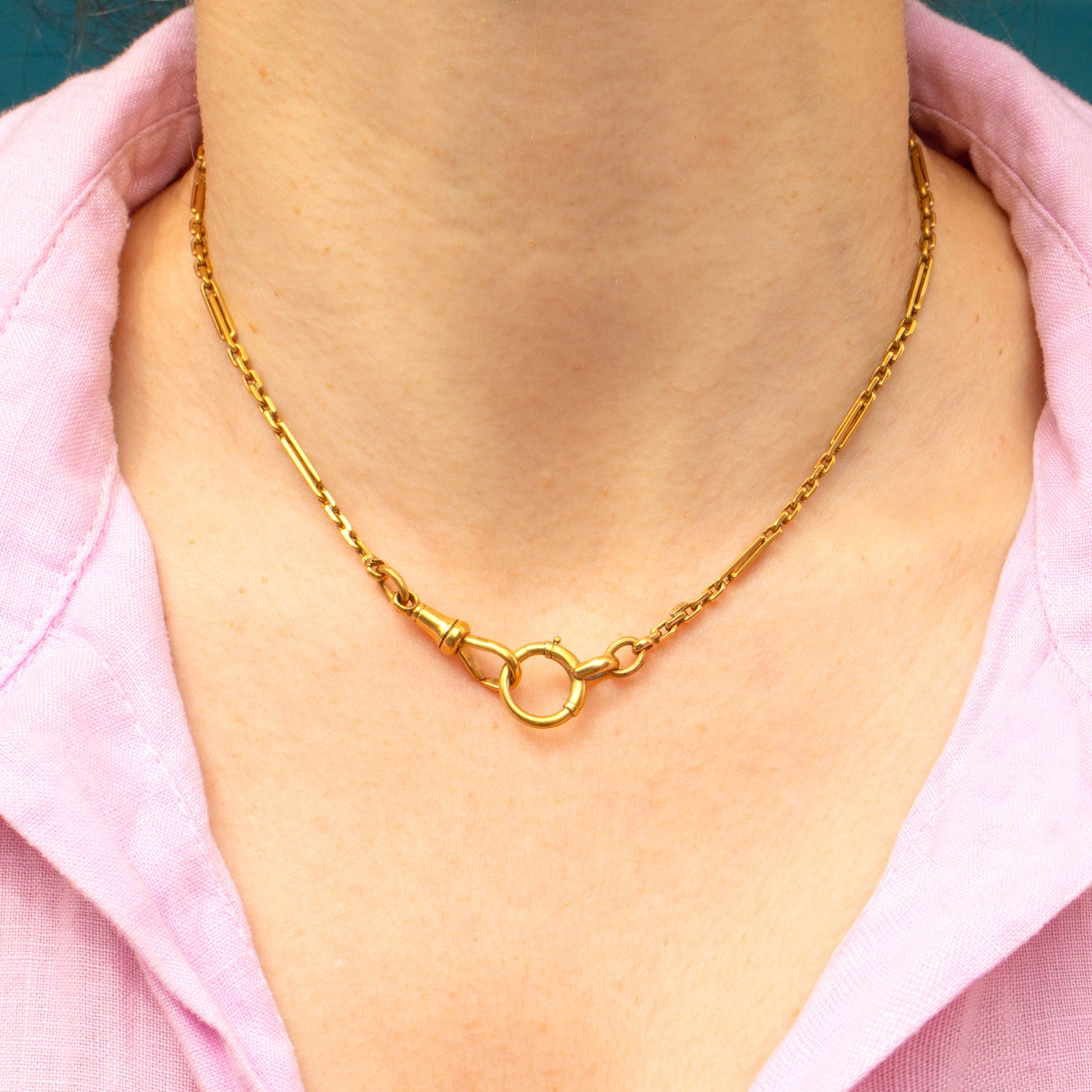 A rare treat, not only does she come with a sumptuous T-Bar drop, but this solid Gold chain has a dog-clip and bolt-ring providing you with ample styling opportunities! Either wear this Victorian necklace with the T-Bar suspended across your clavicle or make use of the clasps and affix your favourite charm or pendant for a personal touch.