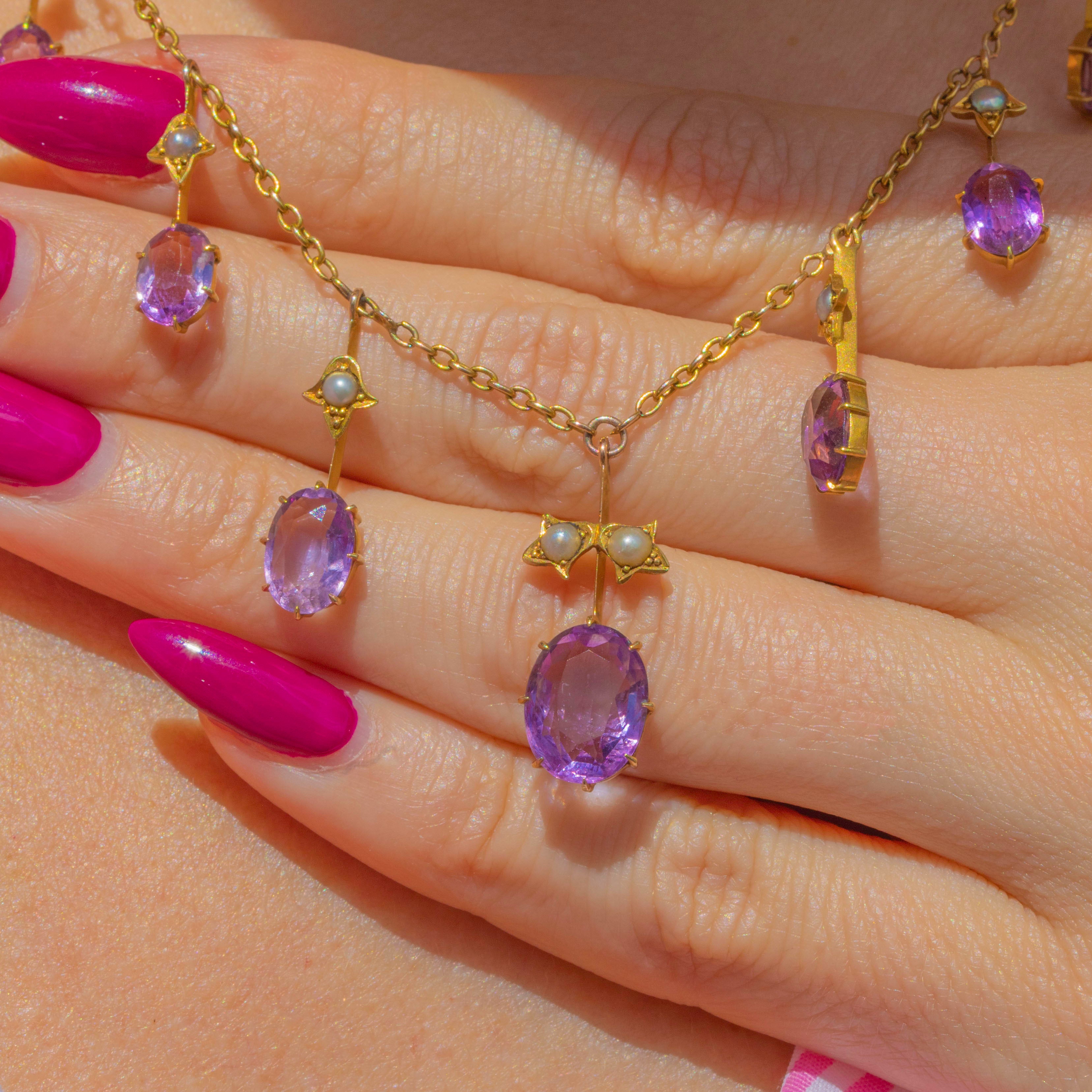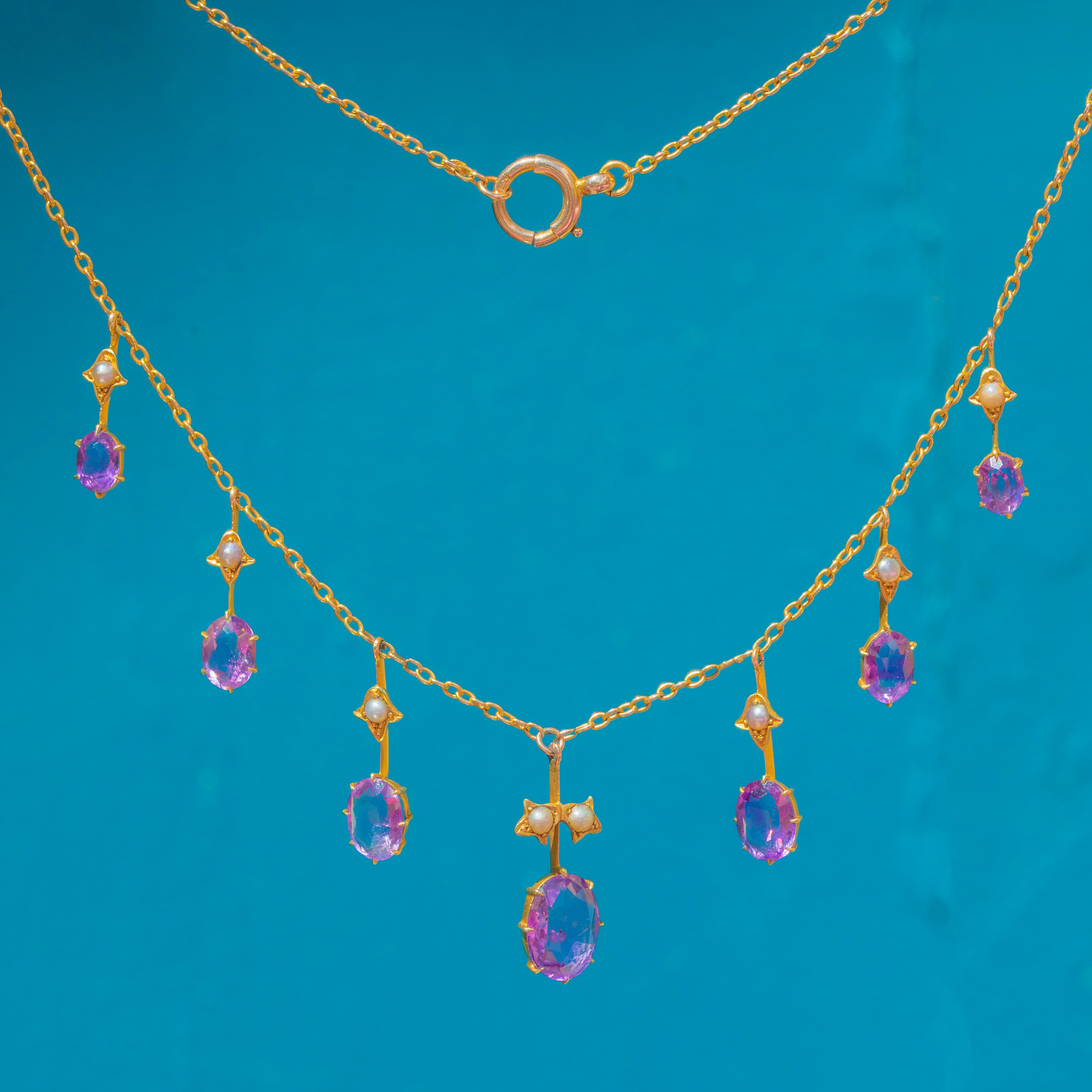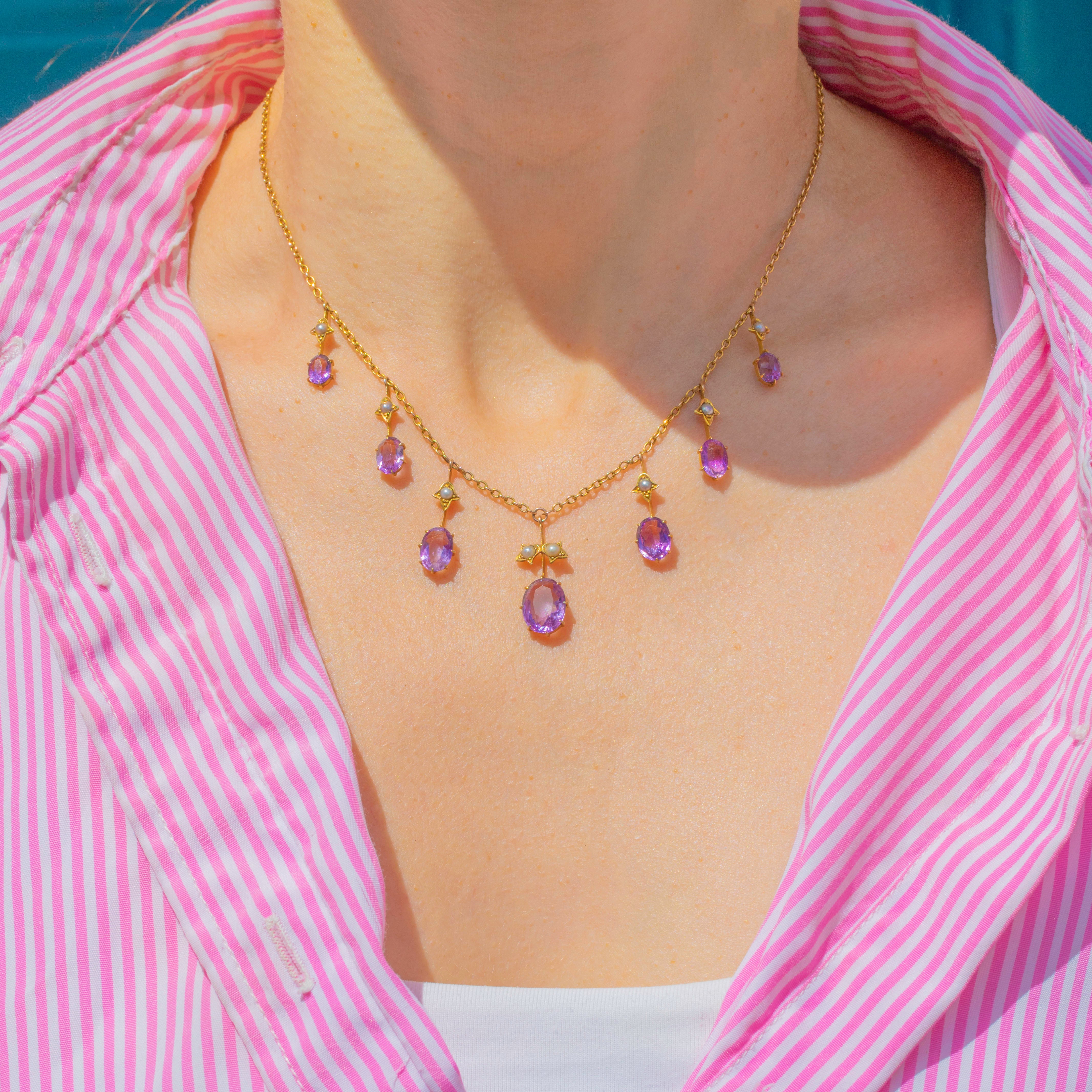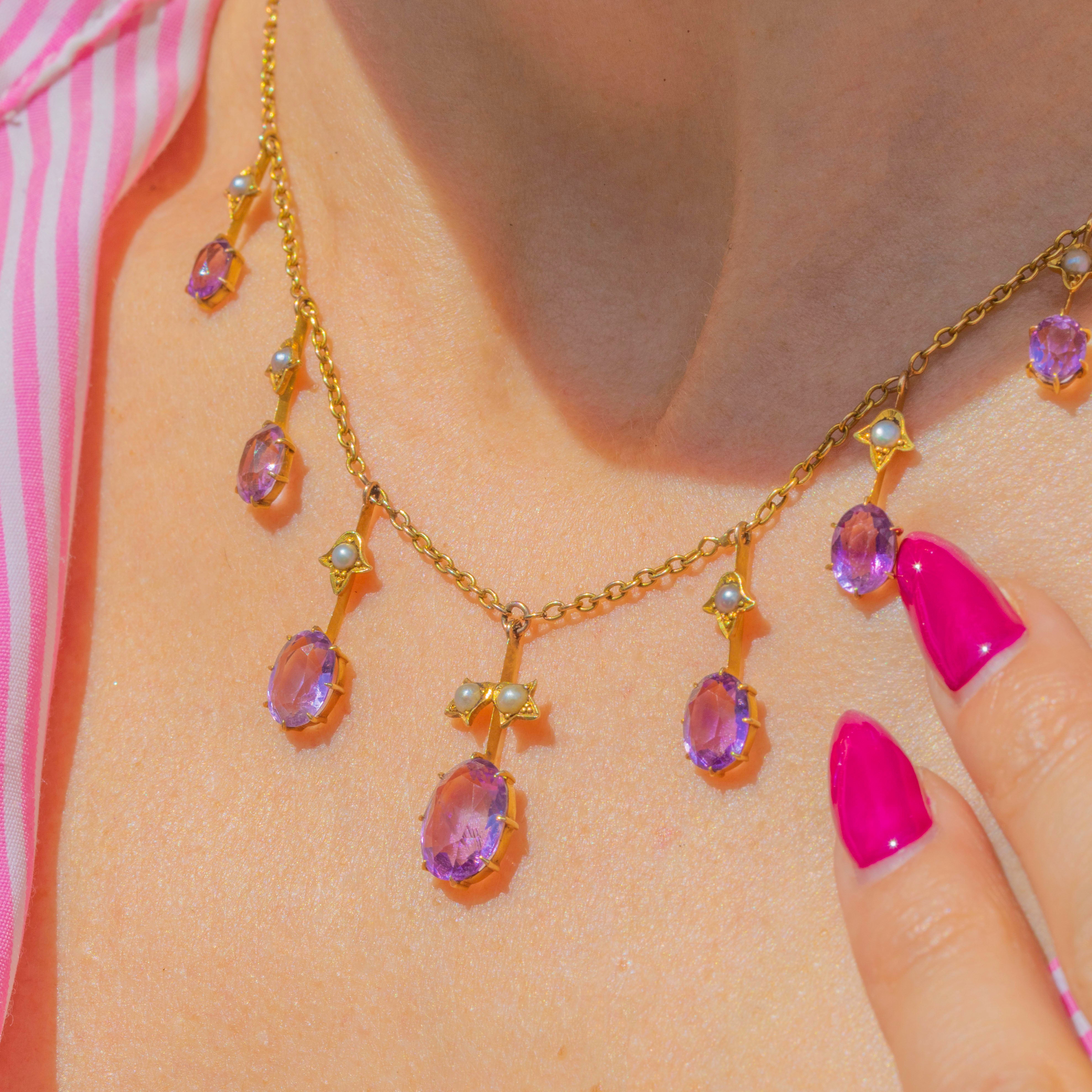 This spectacular Victorian fringe necklace glows with 4.70ct of soft “Rose de France” Amethysts and natural Seed Pearls, all set in rich 15ct Gold. The feminine pastel tones and refined fringe design are classic of the late 19th century, finished with an oversized bolt-ring clasp for that true antique look.
