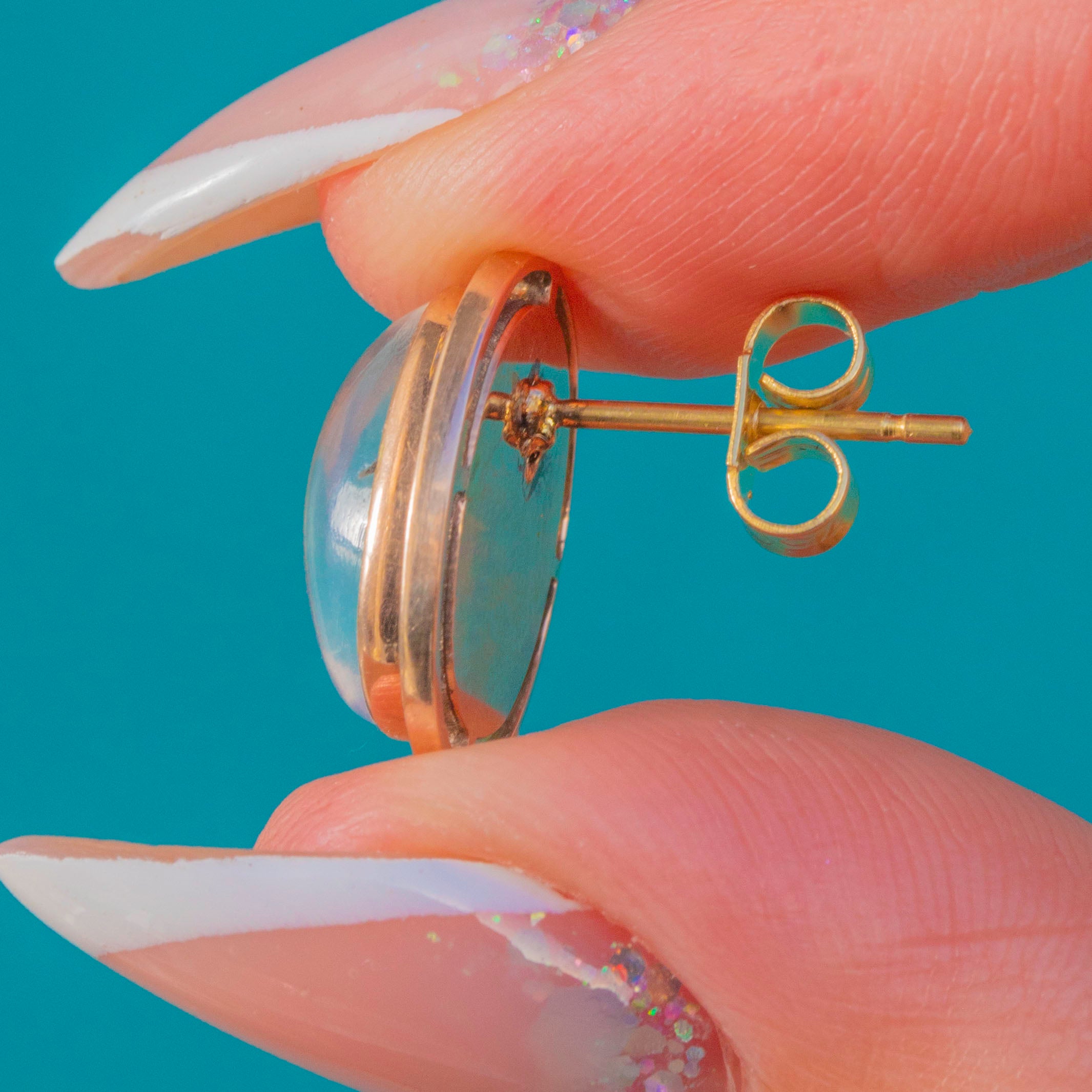 These Art Deco 15ct Gold Moonstone earrings are a glorious way to add a touch of celestial magic to any outfit. Each softly domed Ceylon Moonstone shimmers with an ethereal glow, framed in rich antique Gold that feels both luxurious and striking.