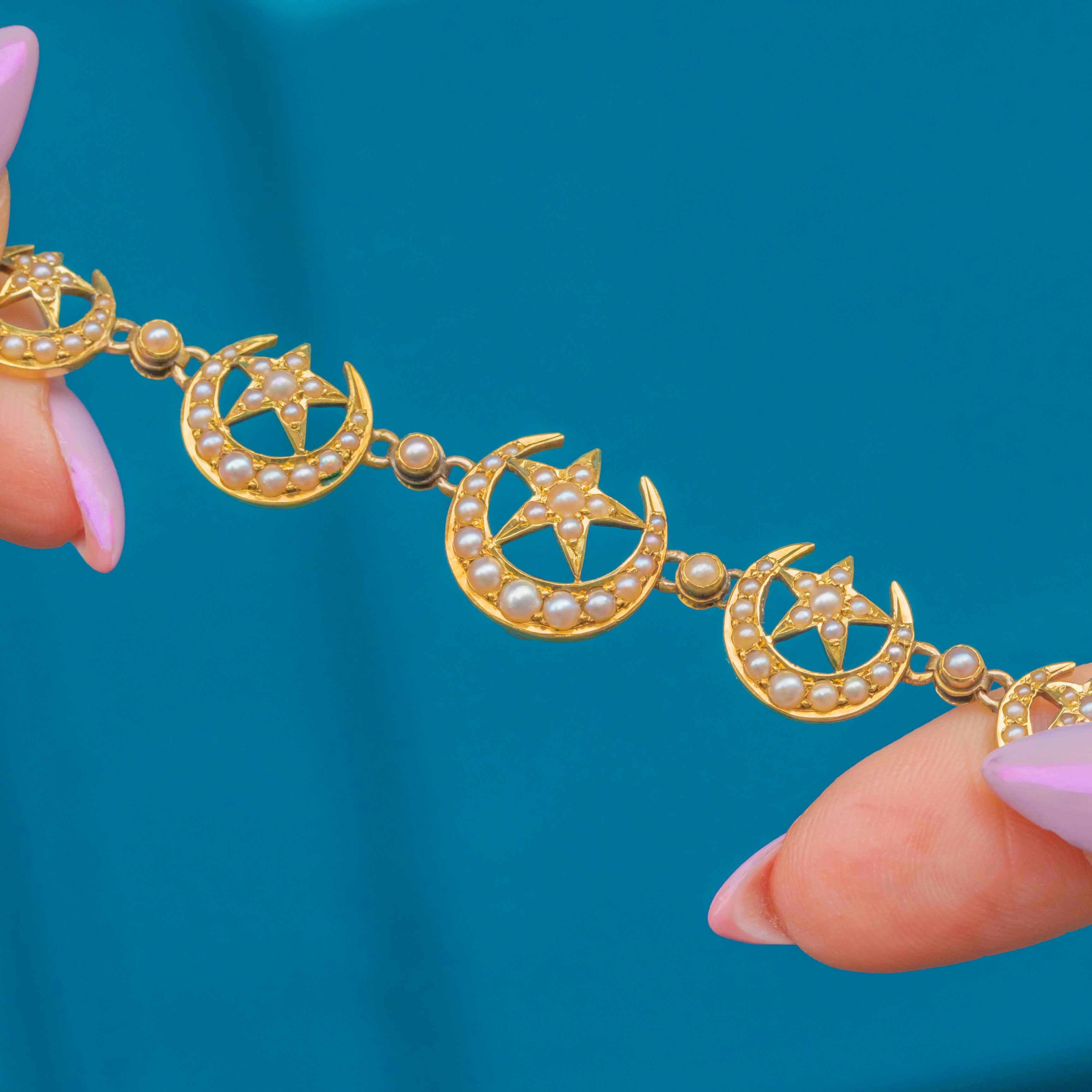 EXCELLENT: The Pearls are lustrous and well-matched, securely set throughout. The Gold retains a rich antique patina with minimal wear. An exceptional example of Edwardian celestial design.