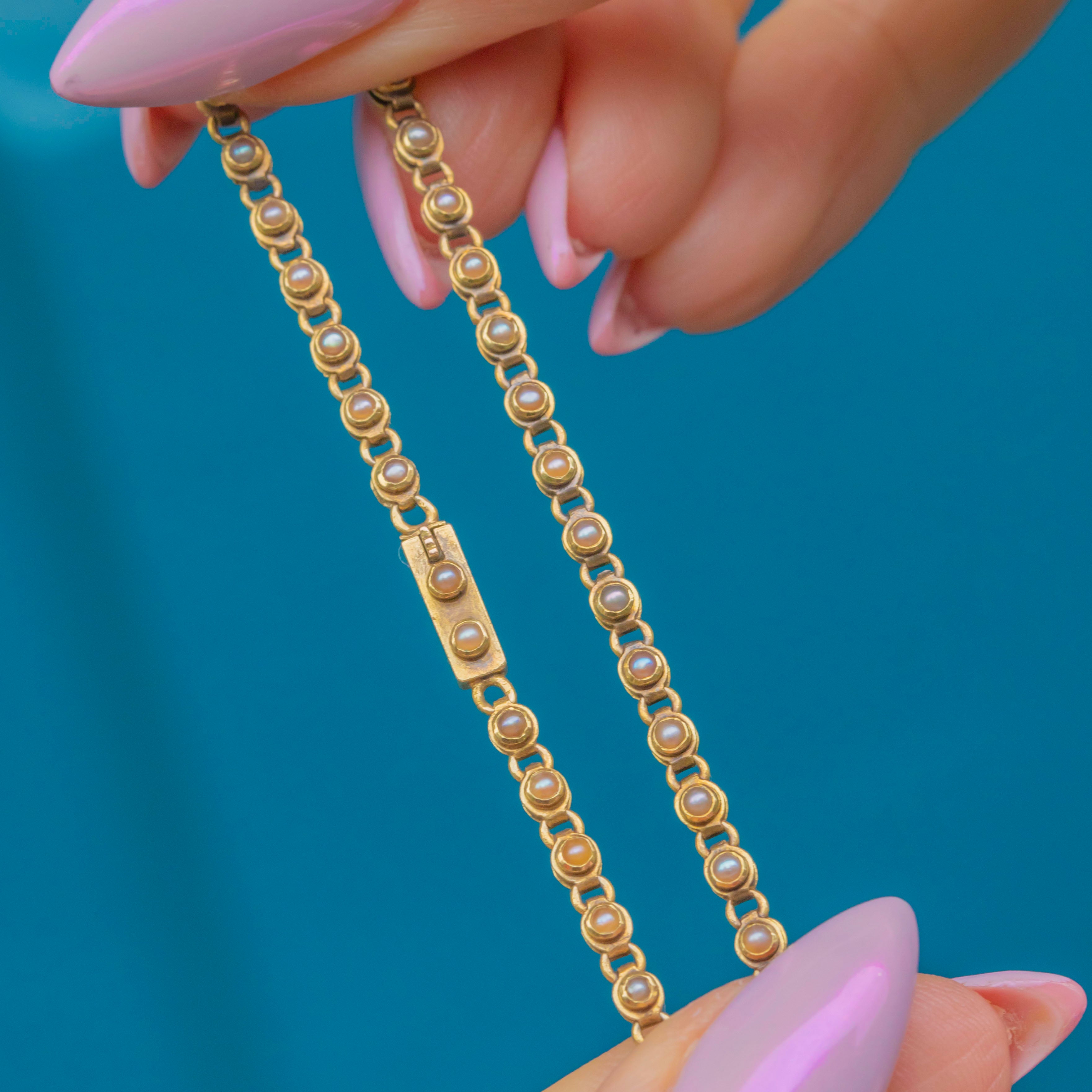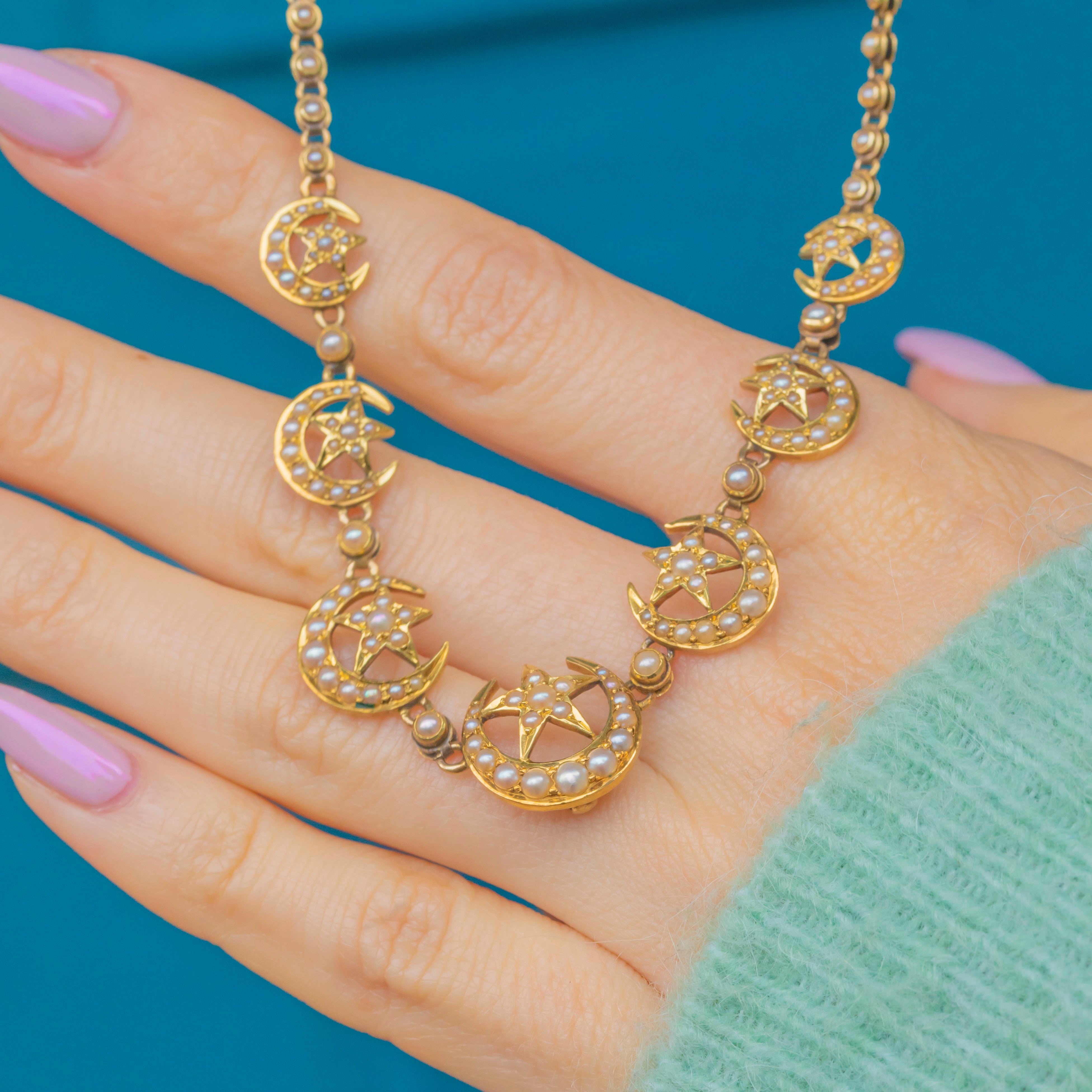 A magnificent Edwardian necklace showcasing one of the era’s most beloved celestial motifs, a glowing Pearl-set crescent moon flanked by tiny twinkling stars. Each Pearl is luminous and well-matched, giving the design an ethereal, romantic quality.