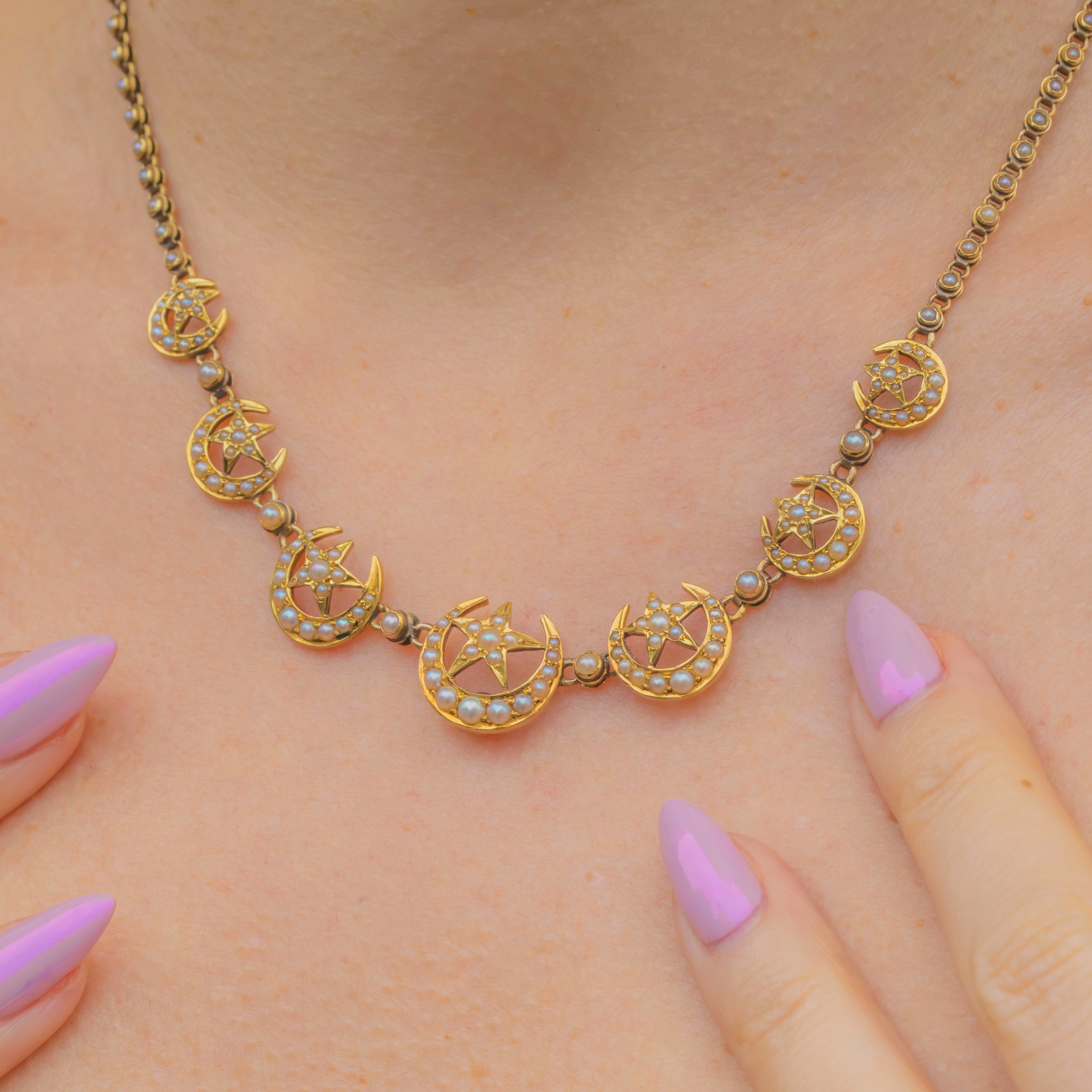 15ct Gold Edwardian Pearl Crescent Moon & Stars Necklace