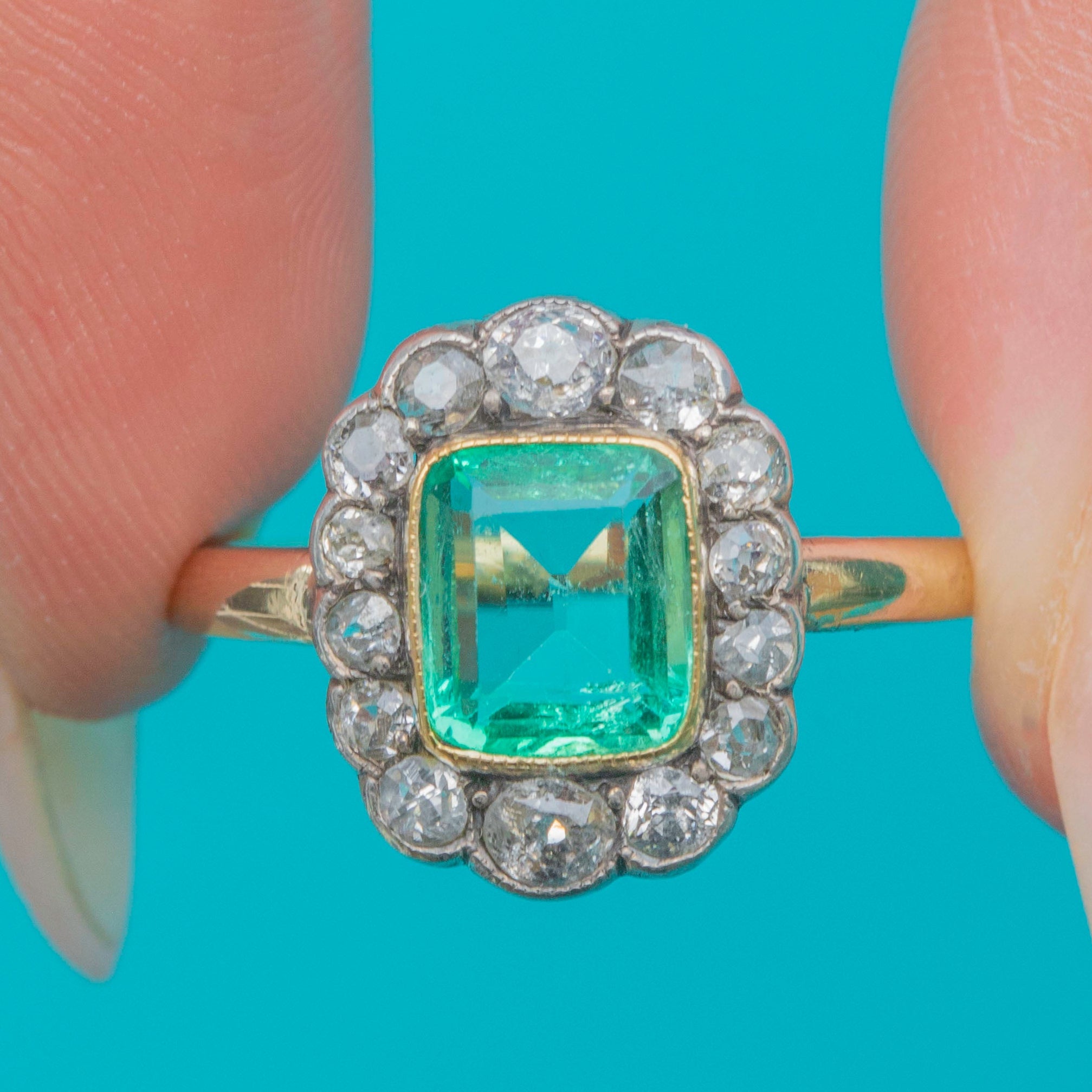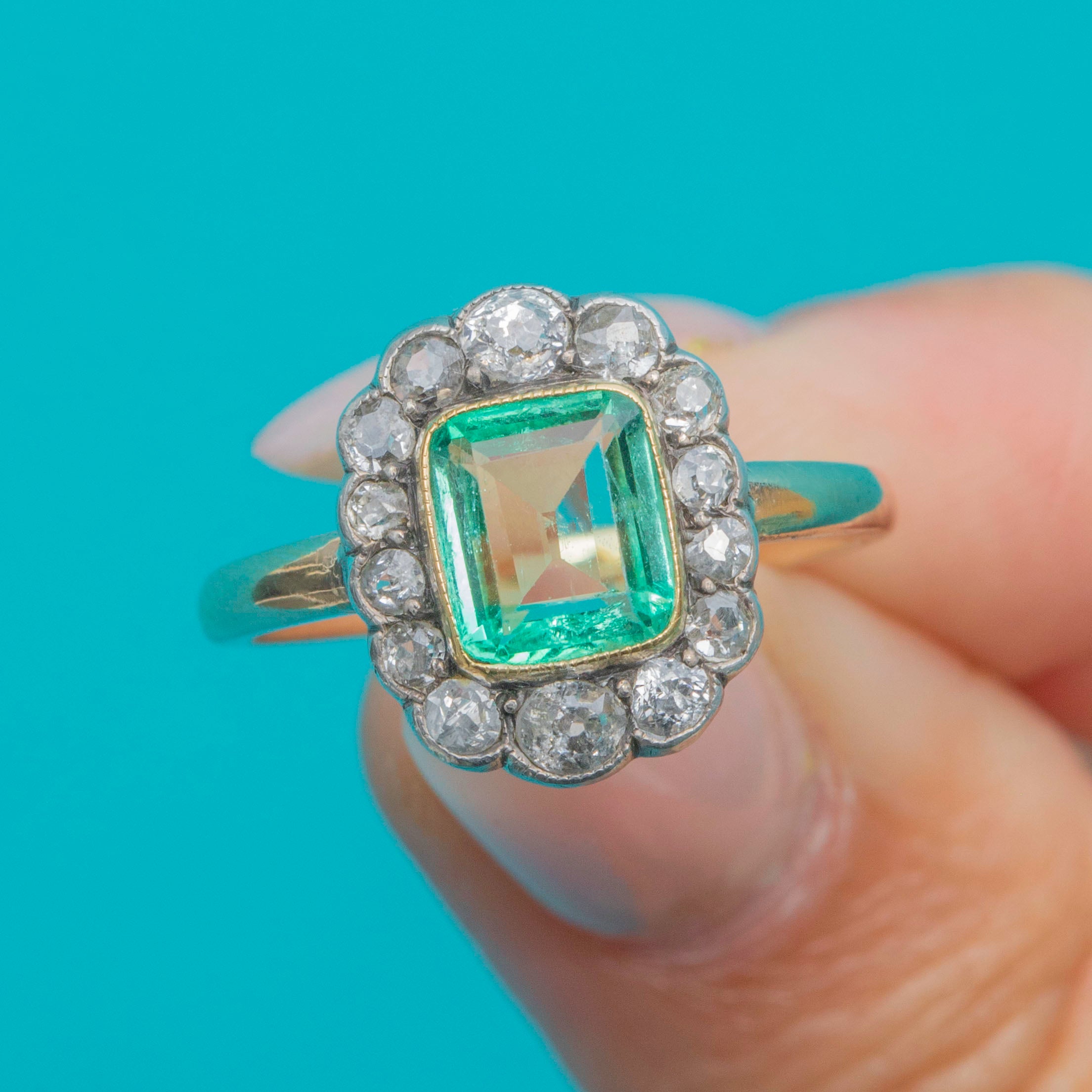 A spectacular Victorian Emerald cluster ring, c.1900, showcasing a striking rectangular 1.00ct Emerald set in warm 15ct Gold with Silver-topped settings. The lush green Emerald is beautifully complemented by a halo of bright and sparkling old mine-cut Diamonds, creating a dazzling and classic cluster design.