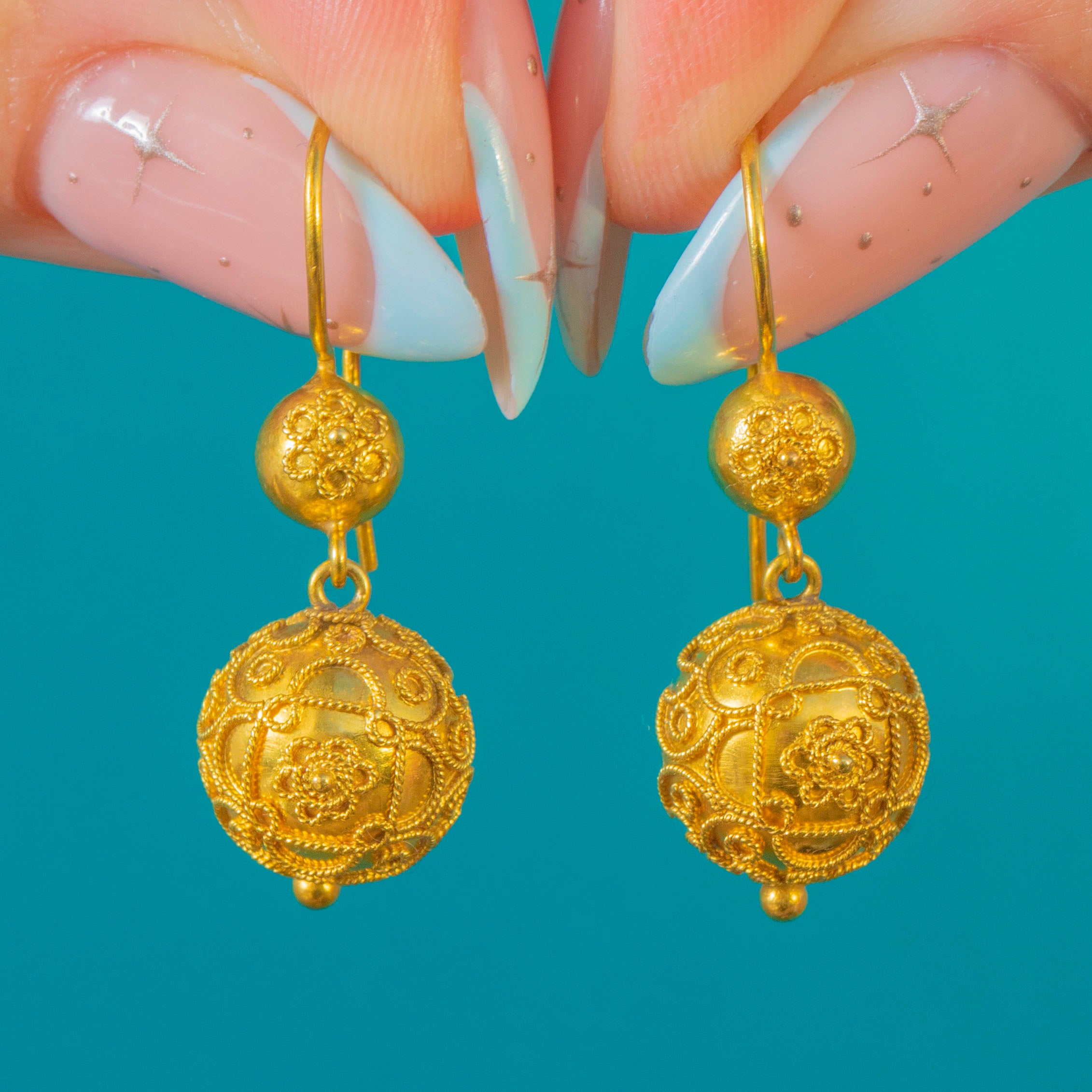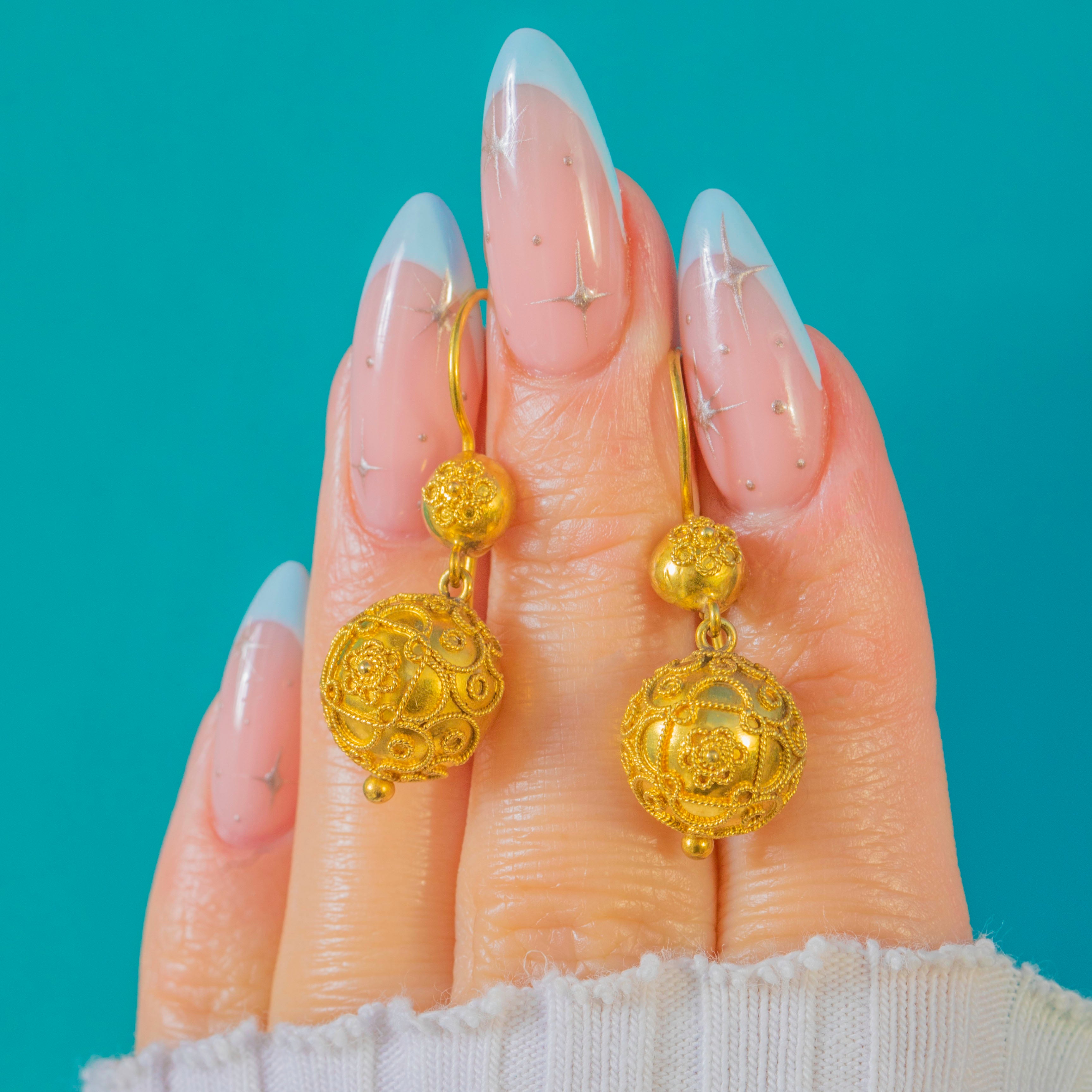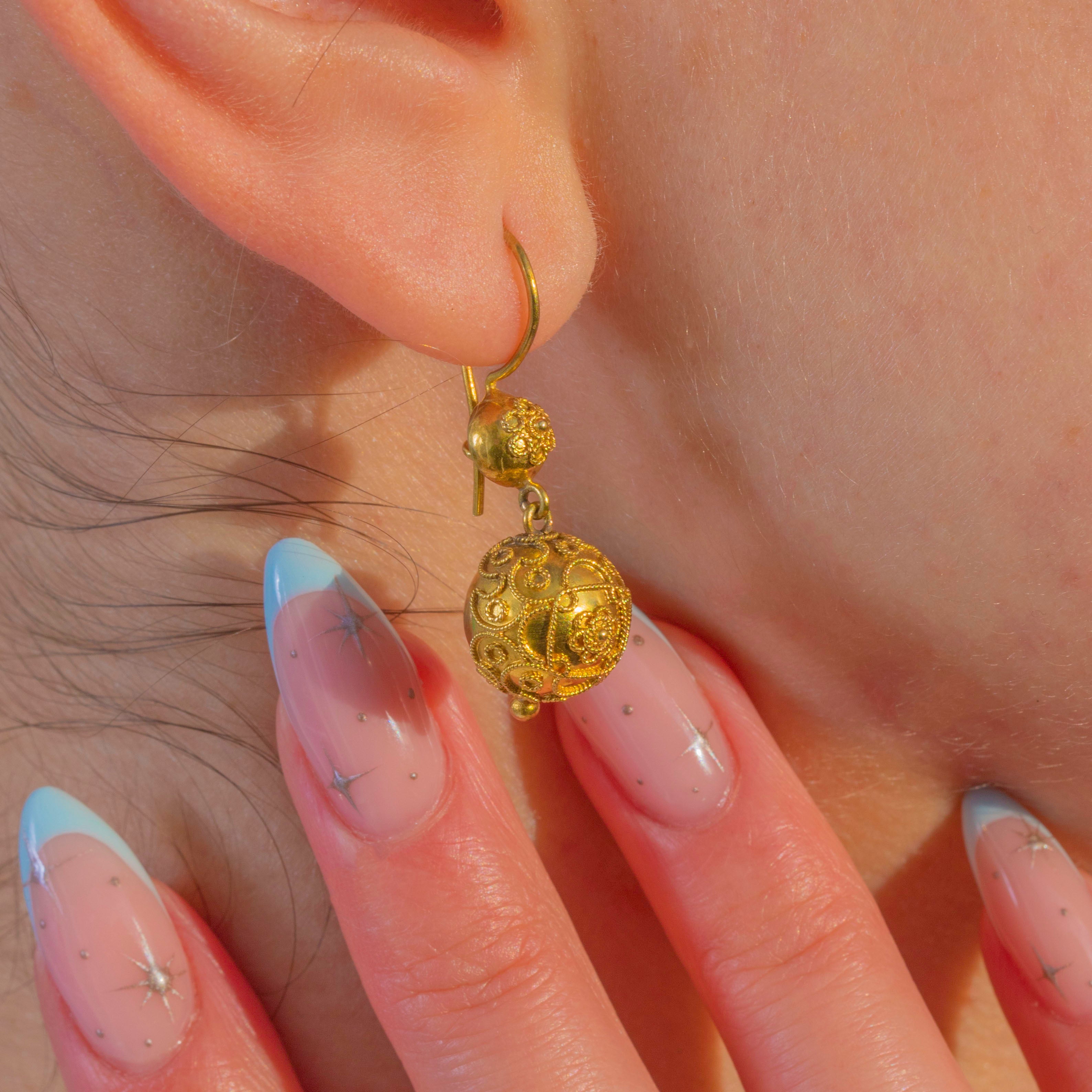Sumptuously textured and beautifully balanced, these Victorian Etruscan Revival orb drop earrings showcase the rich glow of 15ct Gold. The hollow spherical drops are adorned with applied floral cannetille details, finished with a petite beaded terminal for an elegant flourish.
