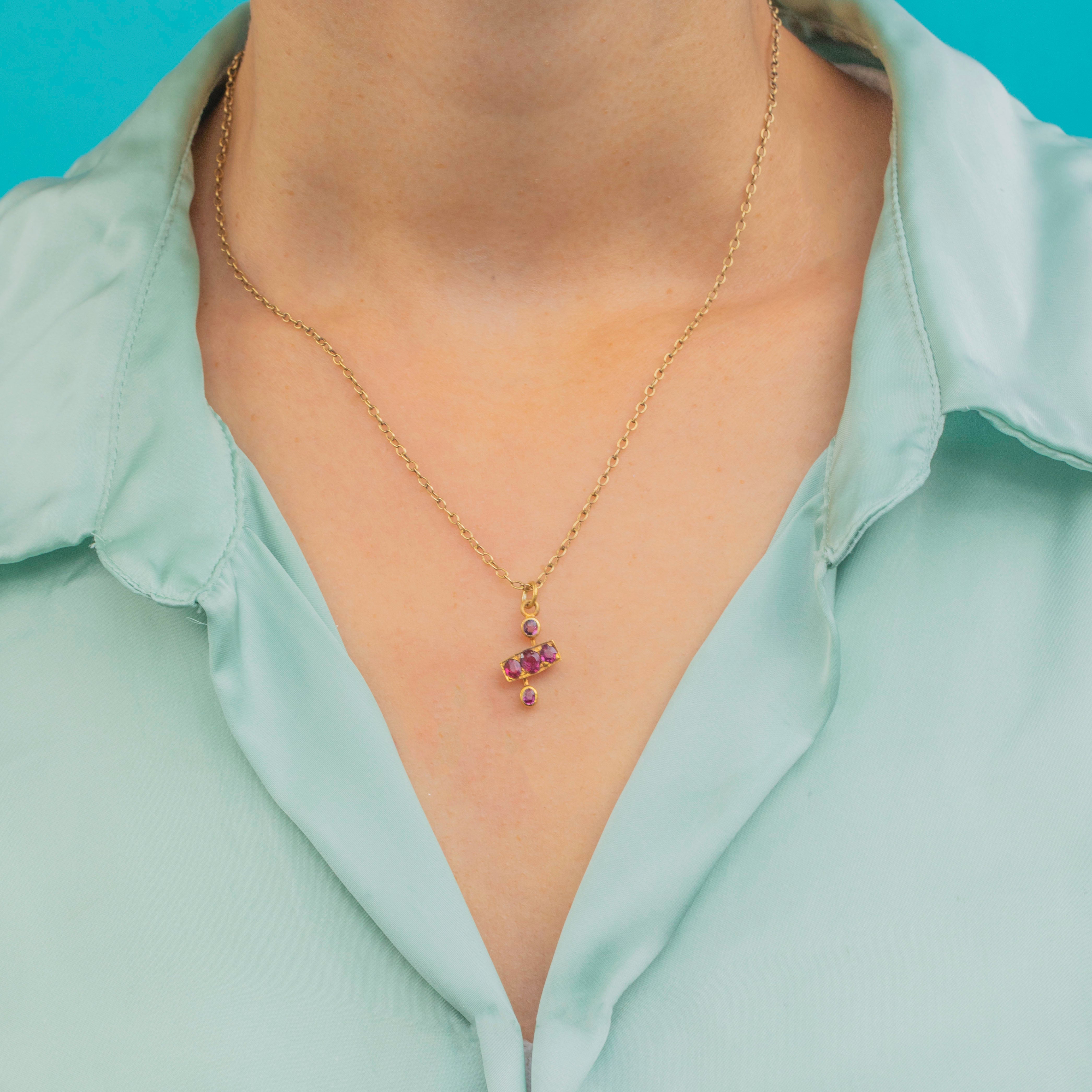 A dainty late-Victorian charm set with glowing raspberry-hued Garnets in warm 15ct Gold. The design features a trio of Garnets set in a slim rectangular panel, accented by single collet-set Garnets above and below for a graceful, elongated silhouette. Lovely on a fine Gold chain or added to a curated charm stack.