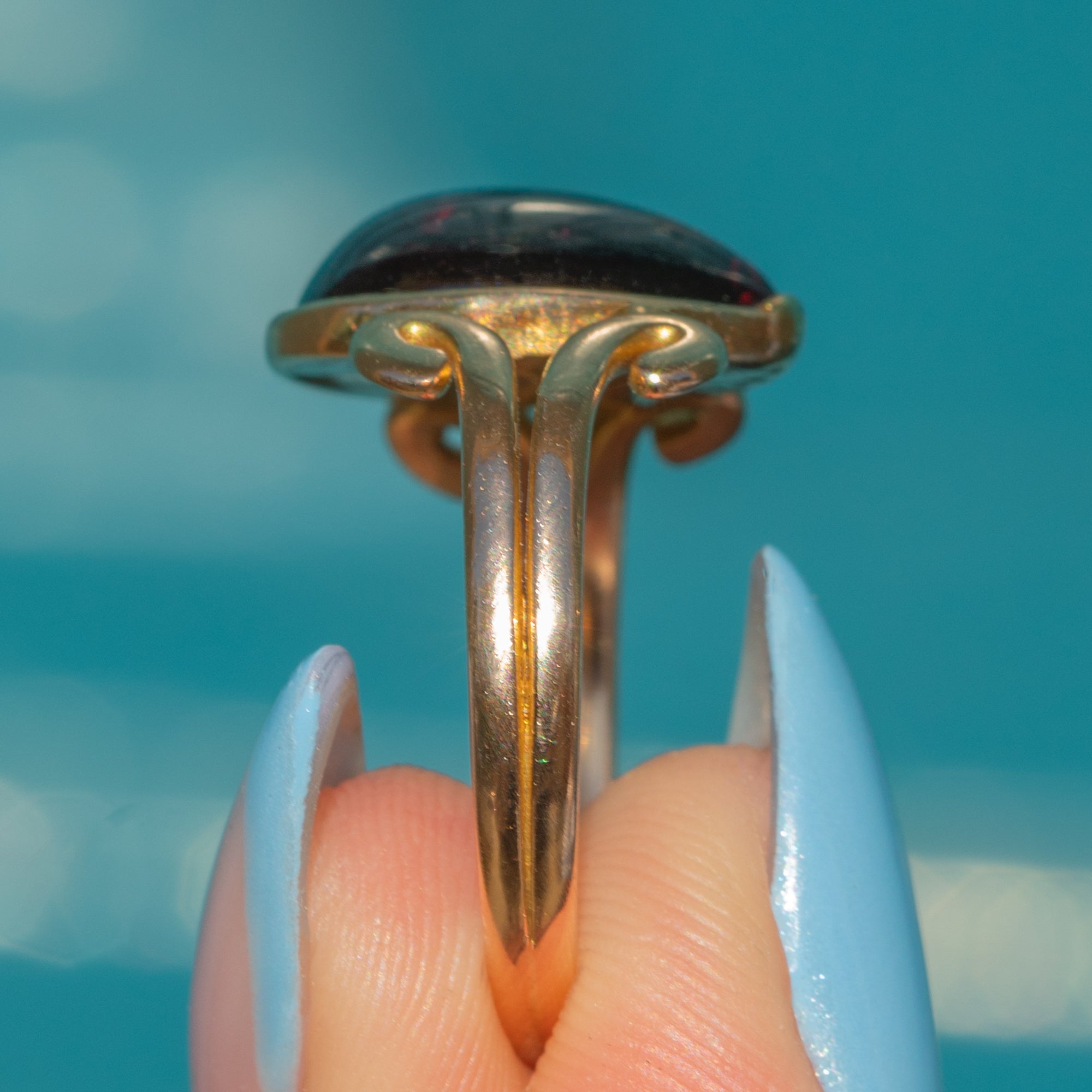 The juicy 1.95ct Garnet cabochon reveals delicious berry-red hues as it moves in the light, effortlessly complemented by the elegant 15ct Gold bezel setting. Offering superb finger coverage, this Victorian ring will make a standout addition to your jewellery collection!