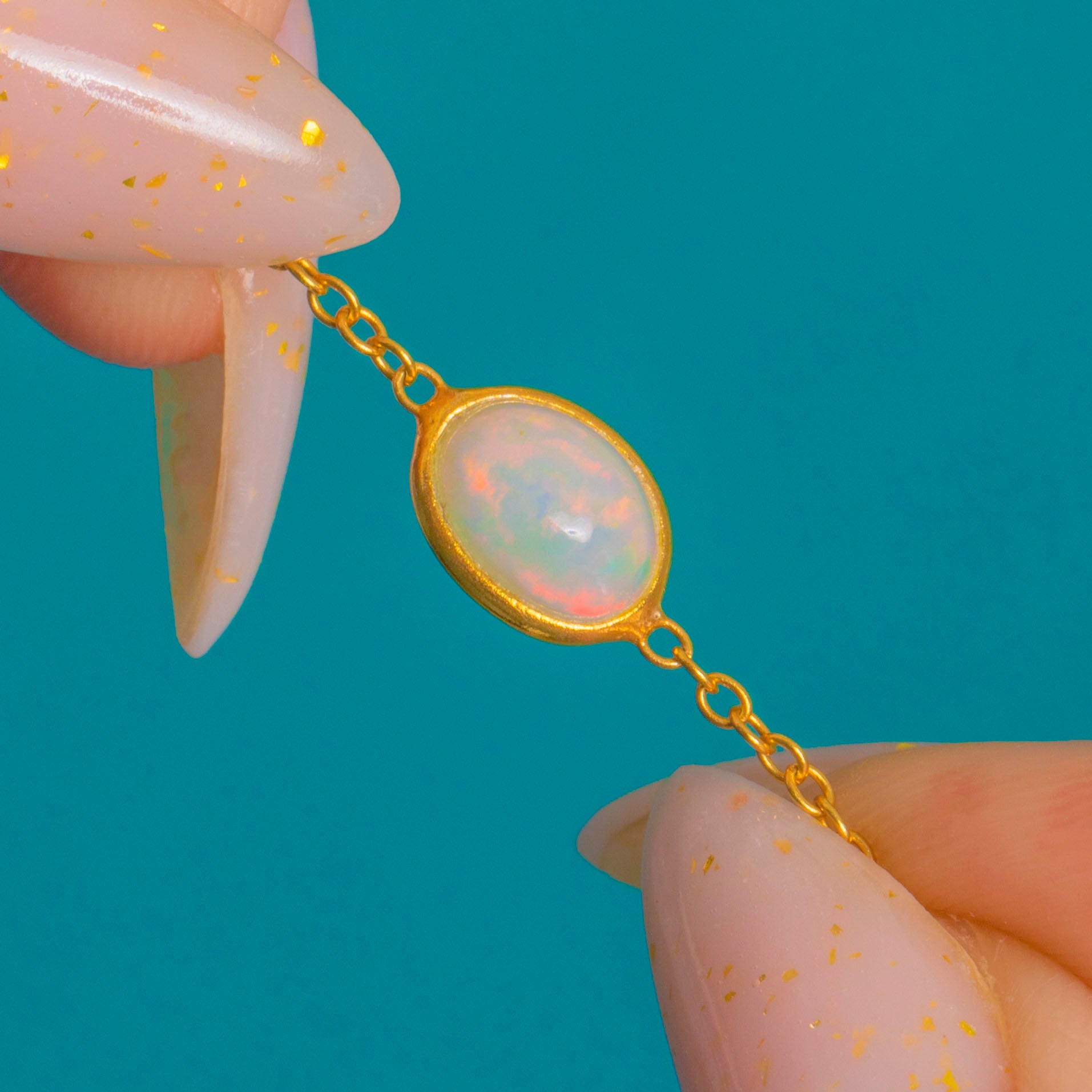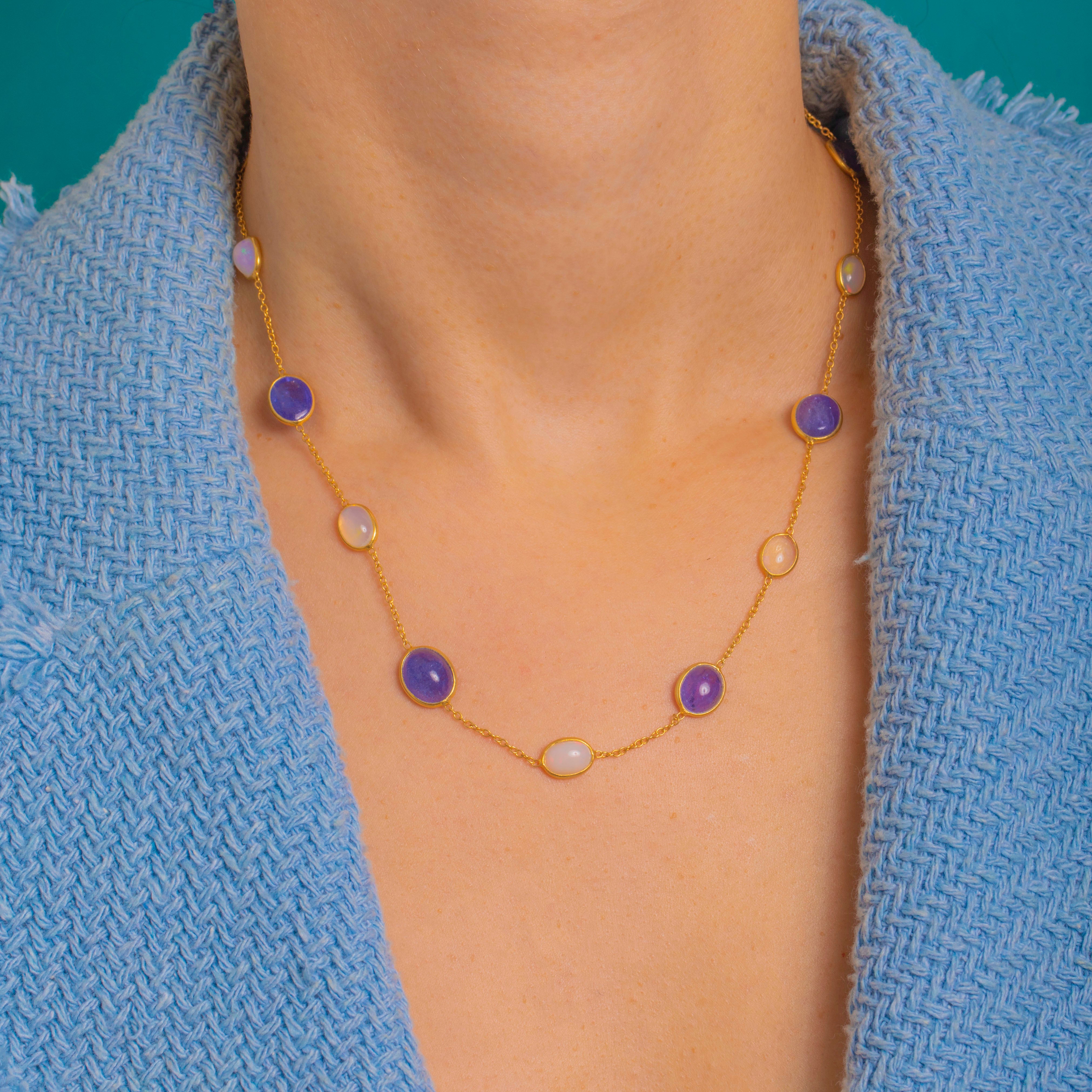 A refined take on colour, this vintage station necklace scatters Opal and Iolite cabochons along a fine chain for an elegant, luminous glow. Smooth rub-over bezels frame the oval silhouettes, the Iolites bringing deep blue-violet saturation while the Opals flash with playful greens, oranges and pinks.