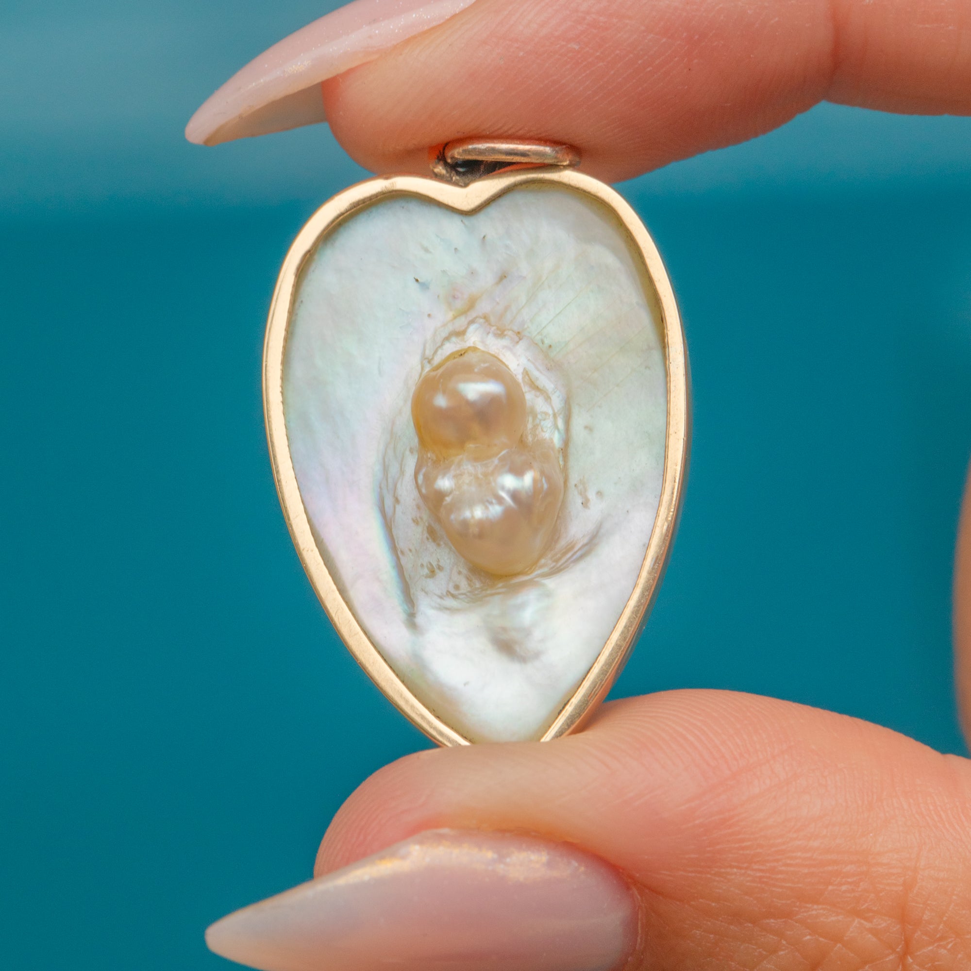 A romantic Victorian pendant, this piece is crafted in 15ct Gold and set with a heart-shaped panel of luminous Mother of Pearl.