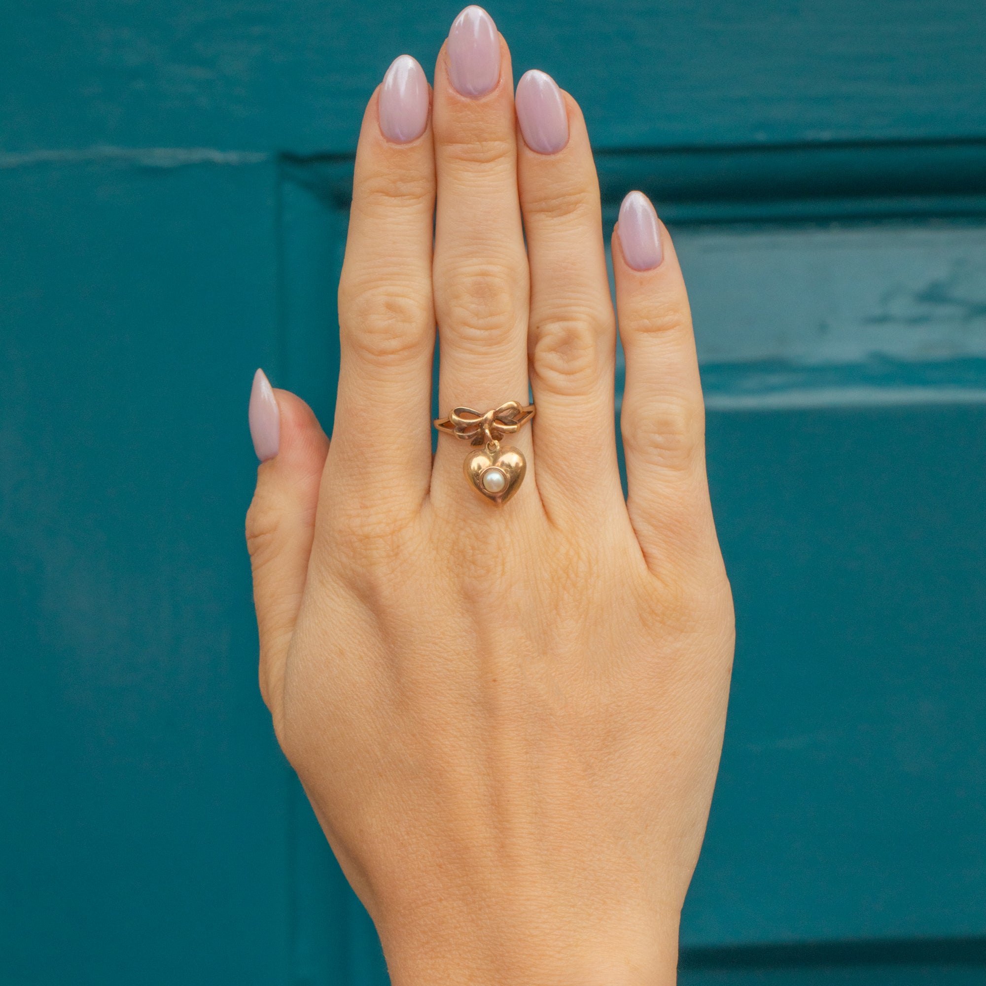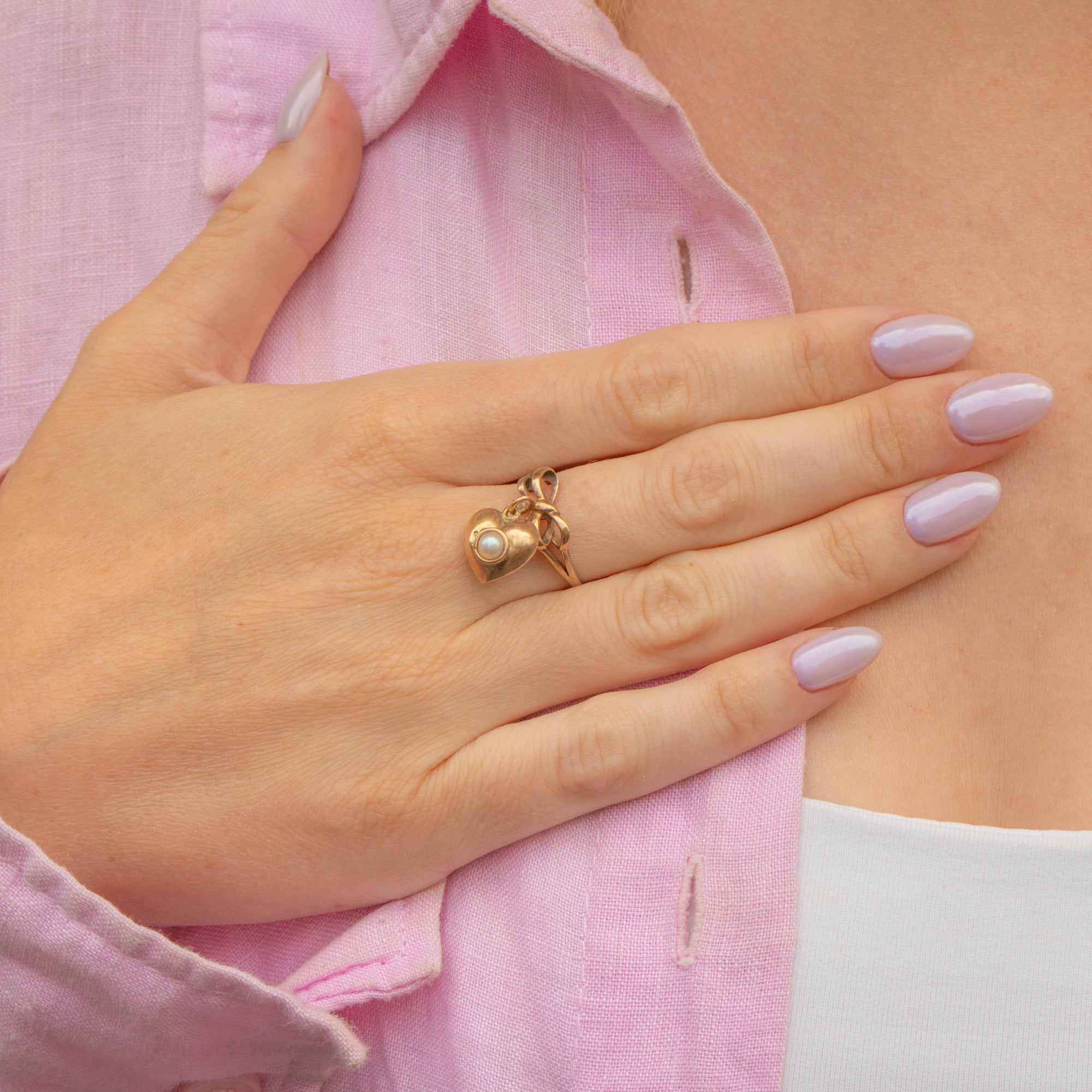 Crafted from sumptuous 15ct Yellow Gold, her elegant design wraps gracefully around your finger with the delicate bow design resting centrally. Featuring a heart charm, ribbon face, and a majestic Pearl on either side, this vintage ring exudes style and is a real eye-catching piece!
