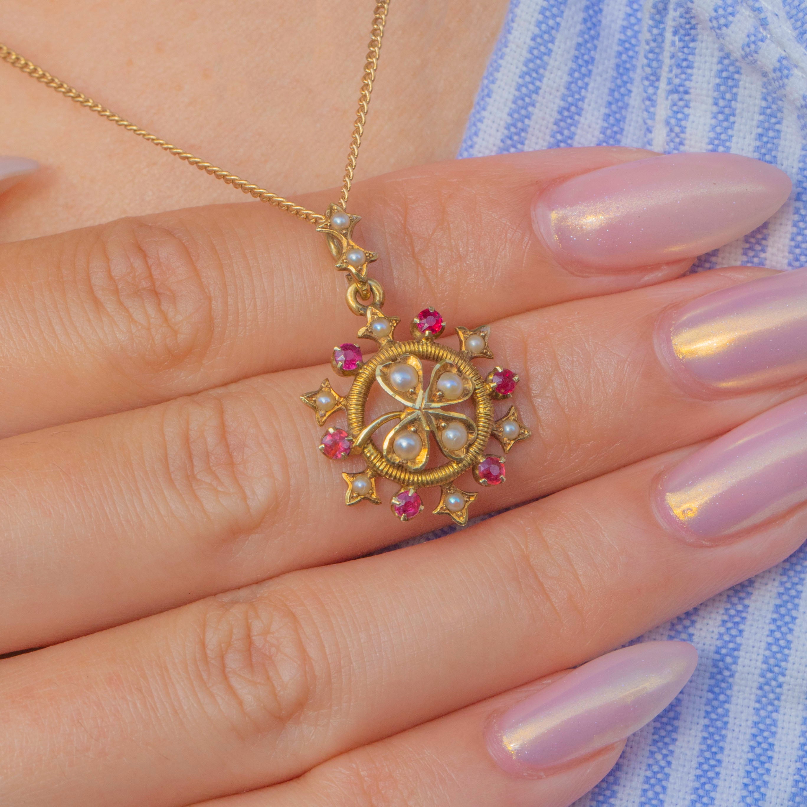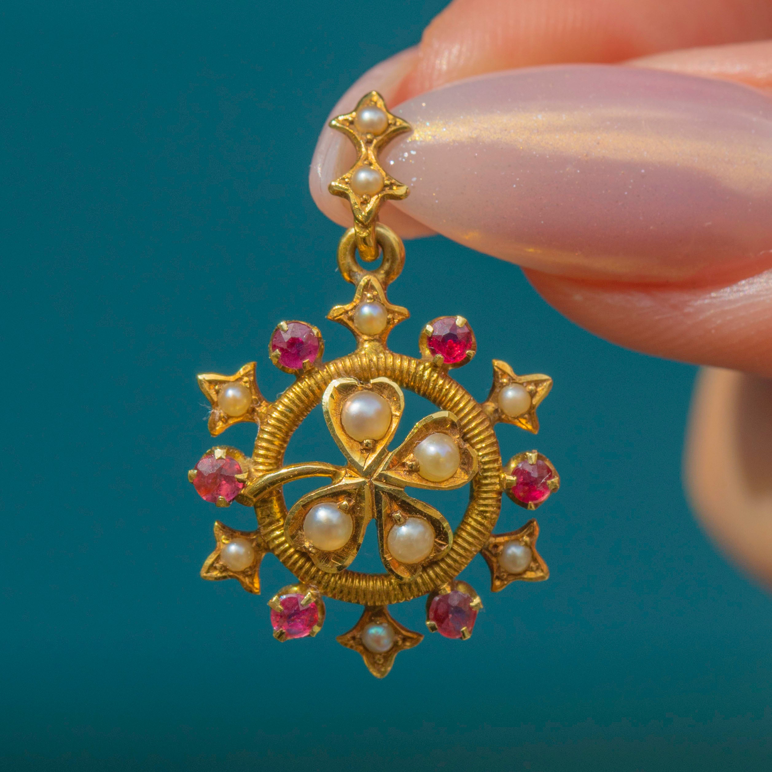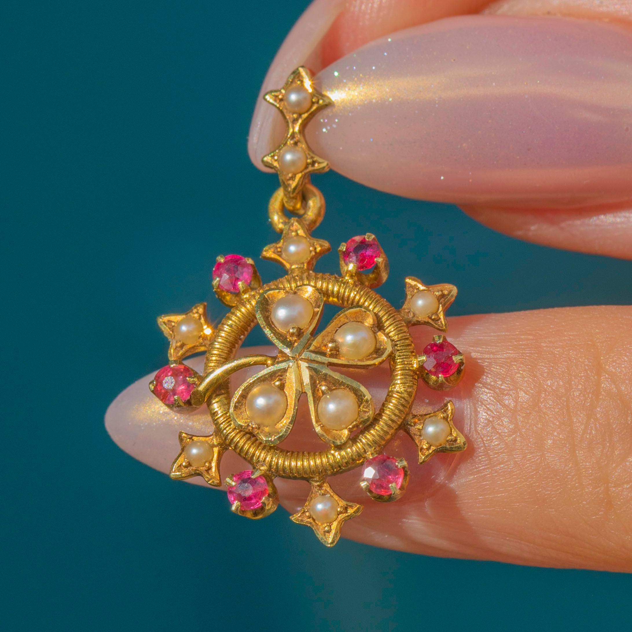Brimming with Victorian charm, this Lucky Shamrock pendant is crafted in rich 15ct Gold and set with creamy Seed Pearls and lively Rubies. A delicate clover sits within a ropetwist circle, surrounded by alternating star and Ruby accents for a sweet, symbolic halo.
