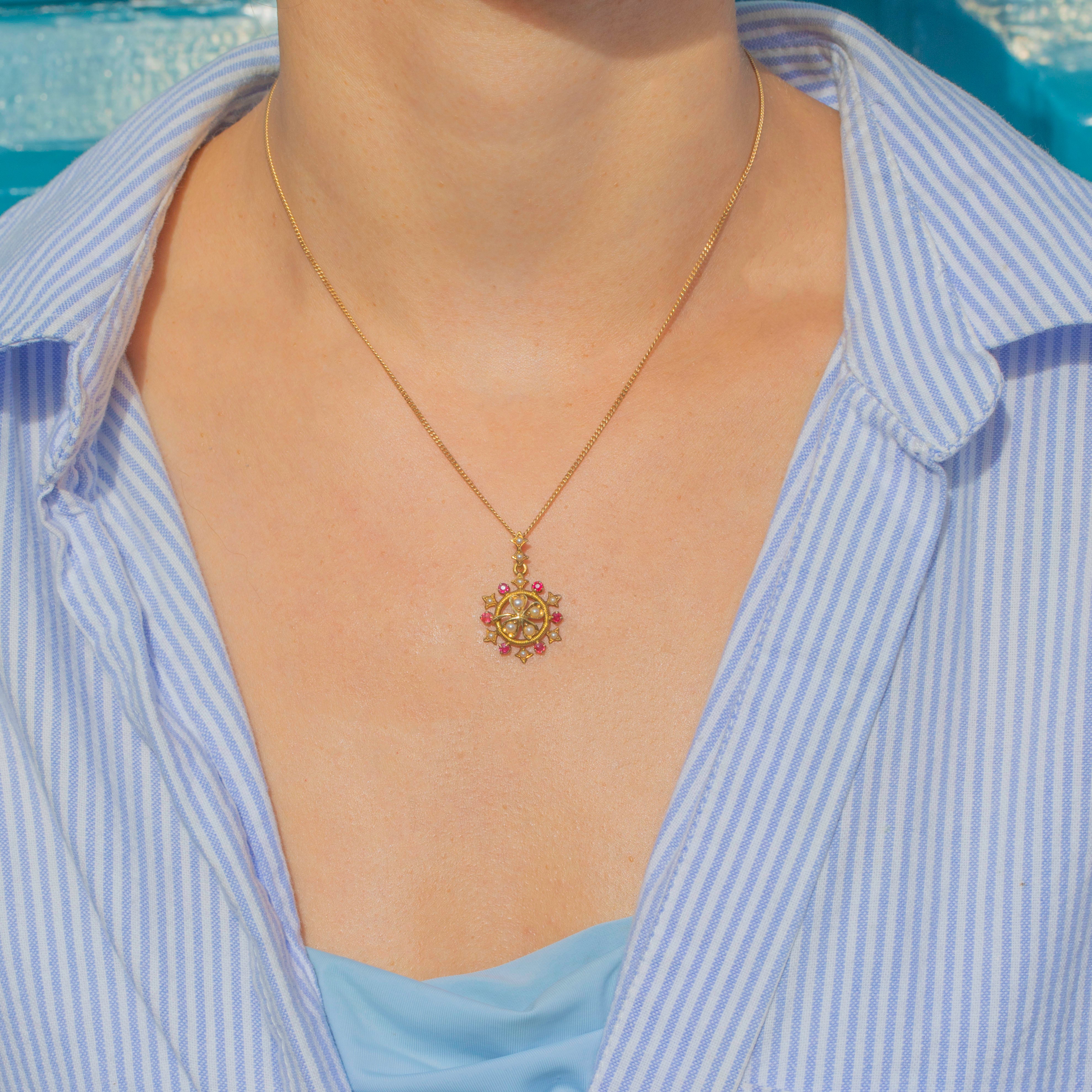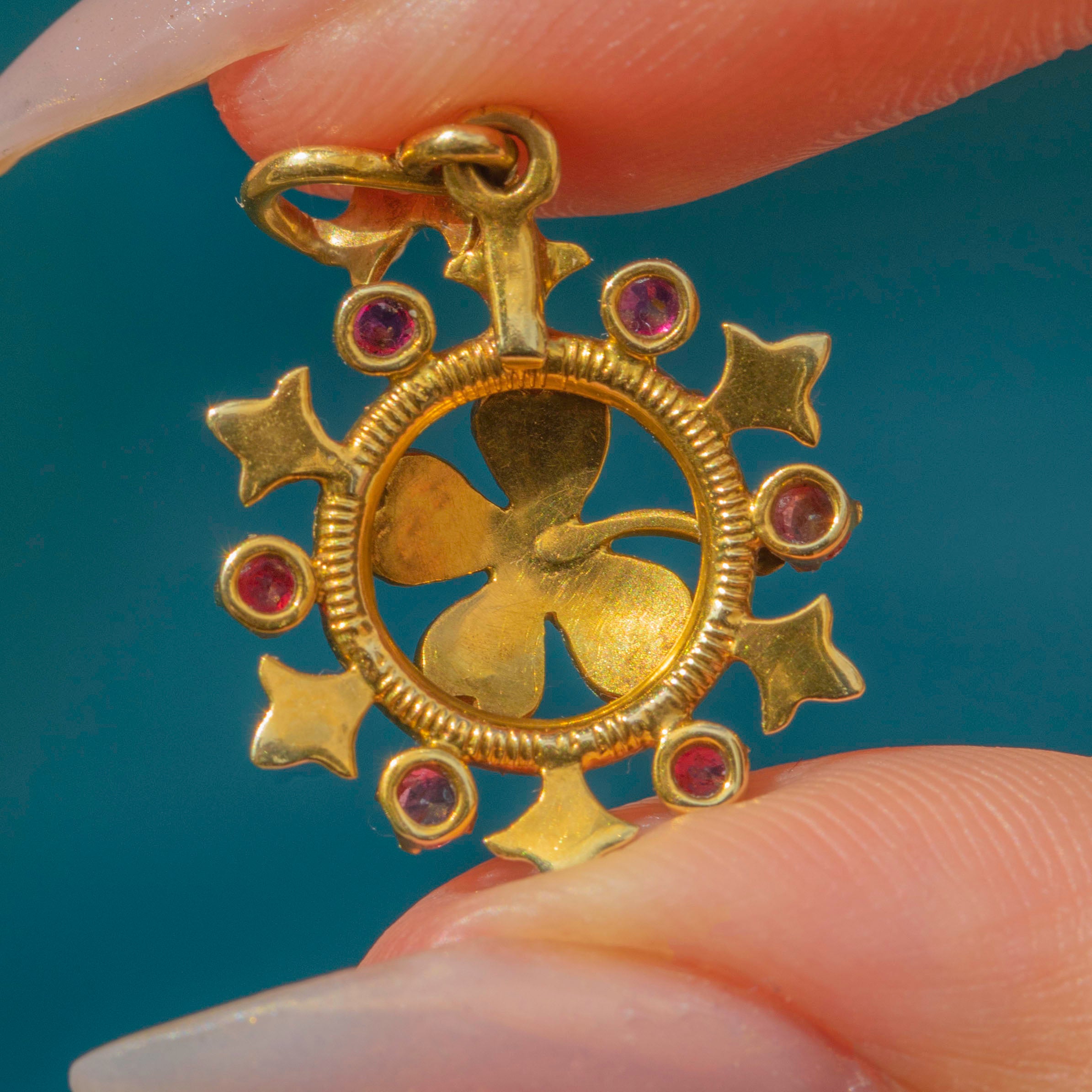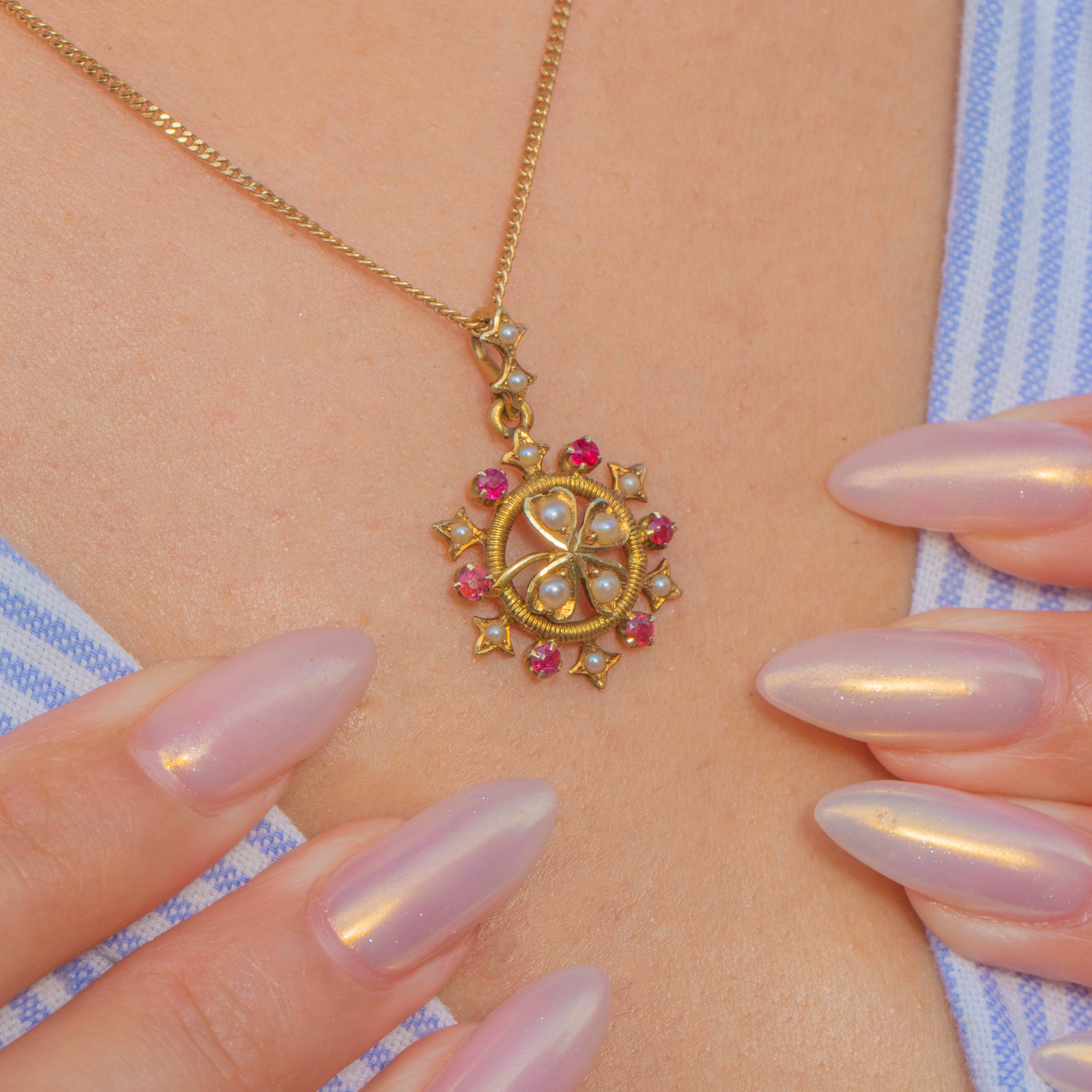 Brimming with Victorian charm, this Lucky Shamrock pendant is crafted in rich 15ct Gold and set with creamy Seed Pearls and lively Rubies. A delicate clover sits within a ropetwist circle, surrounded by alternating star and Ruby accents for a sweet, symbolic halo.