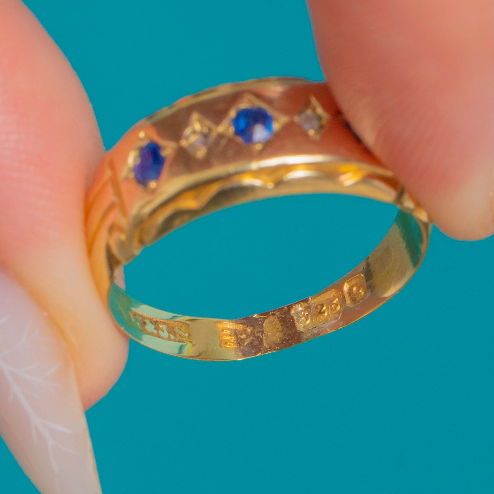 A richly hued 15ct Gold gypsy ring set with Sapphires and Diamonds, bearing the Chester assay and dating to 1899. The gemstones are nestled in bright-cut star and lozenge-shaped panels across a domed band, framed by hand-engraved borders and subtly detailed shoulders.