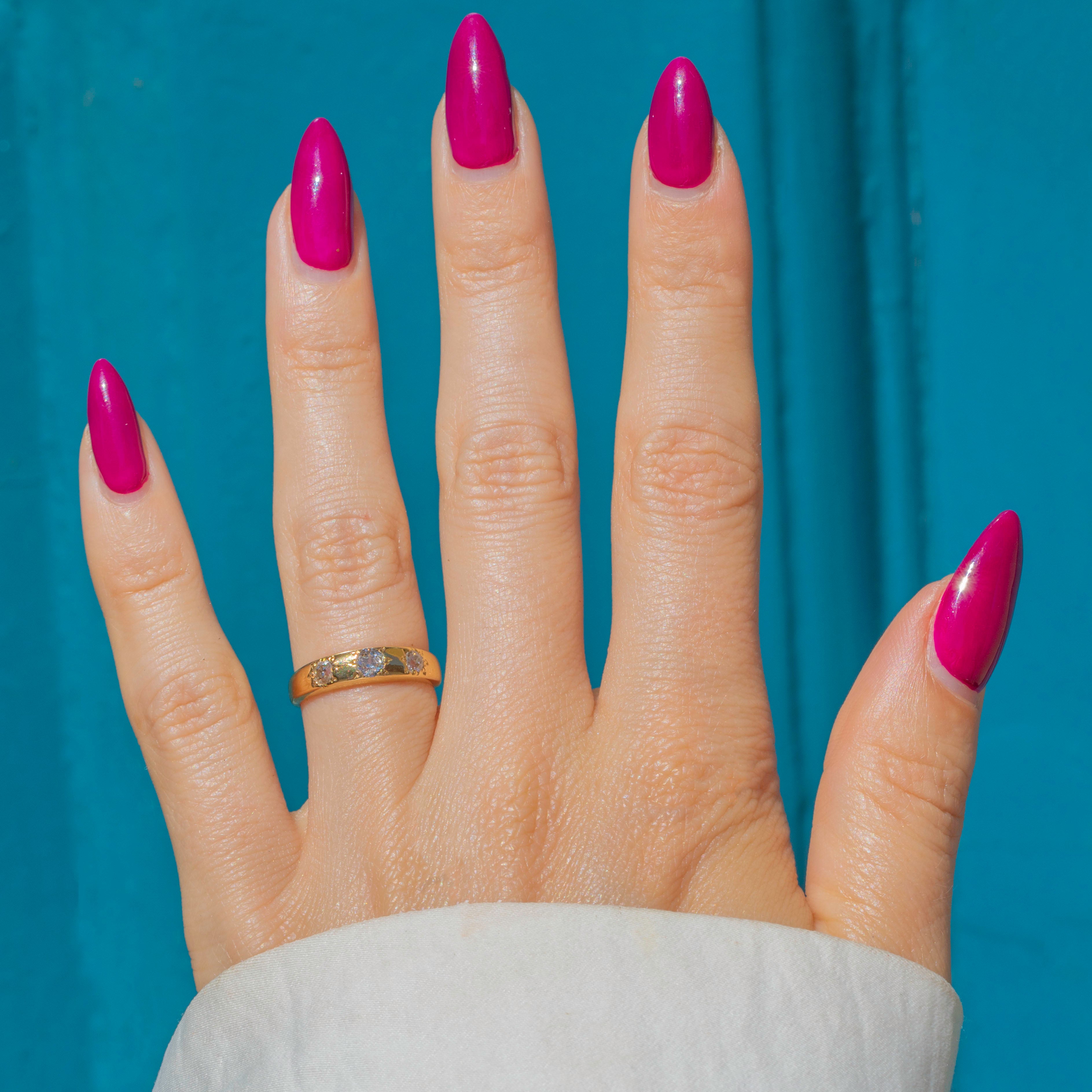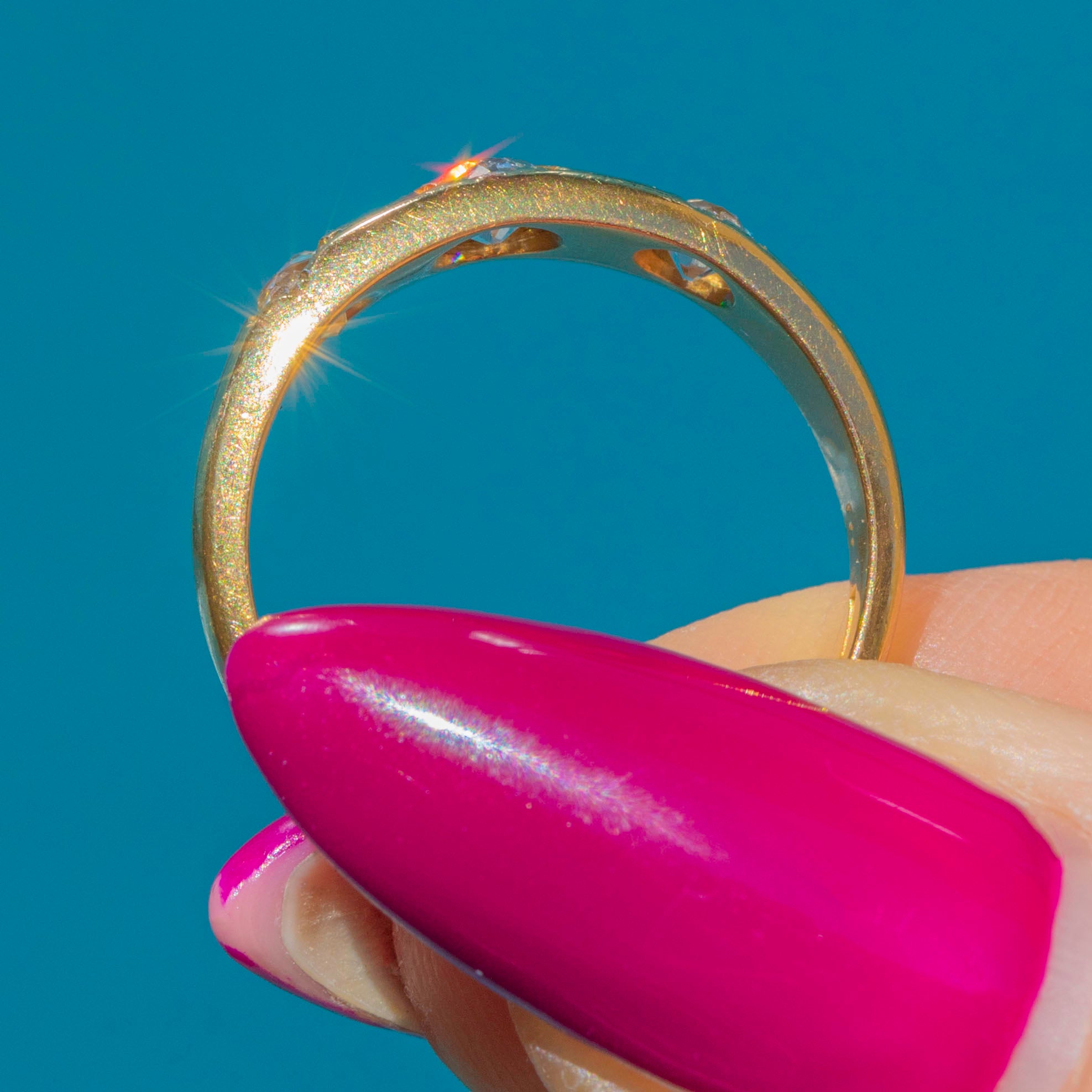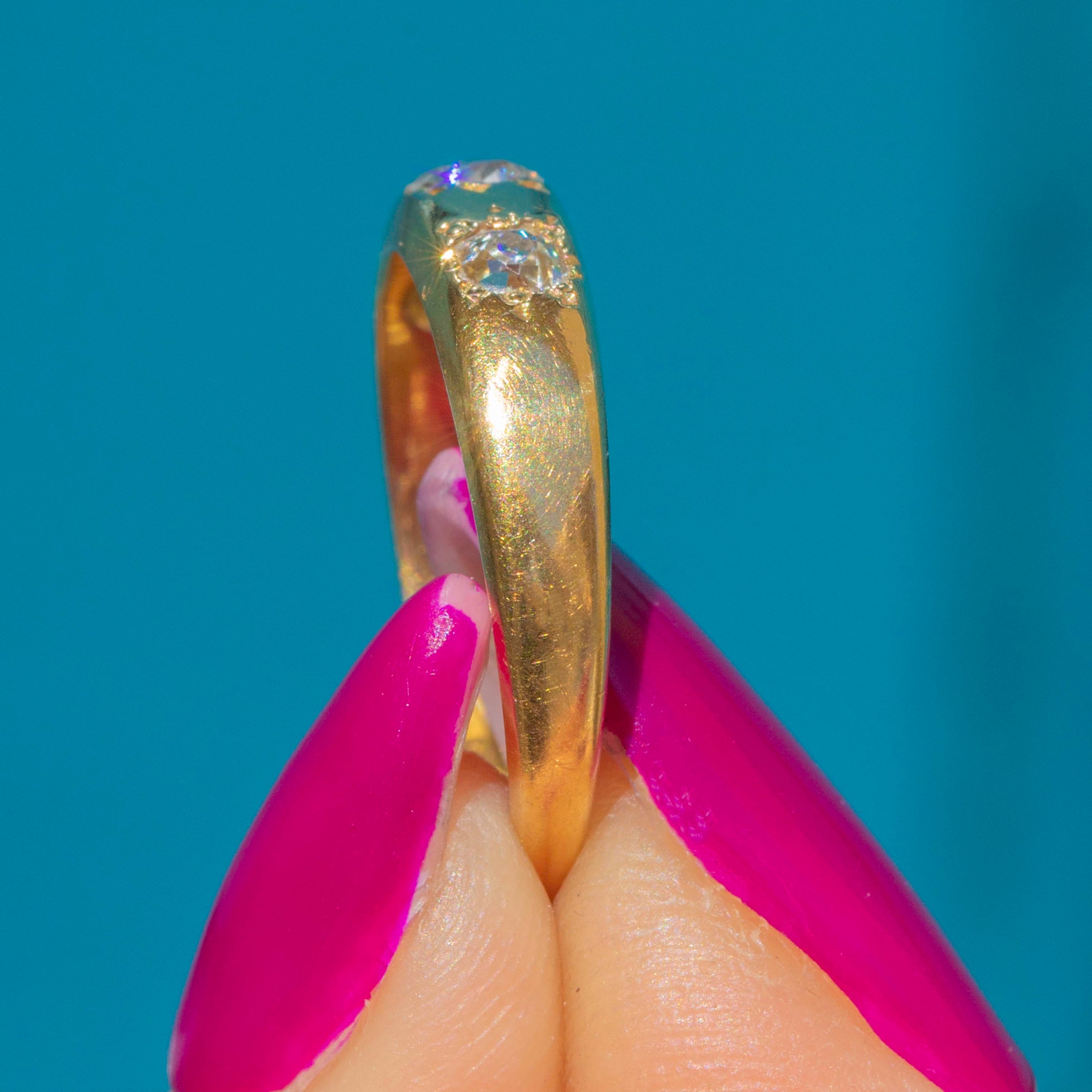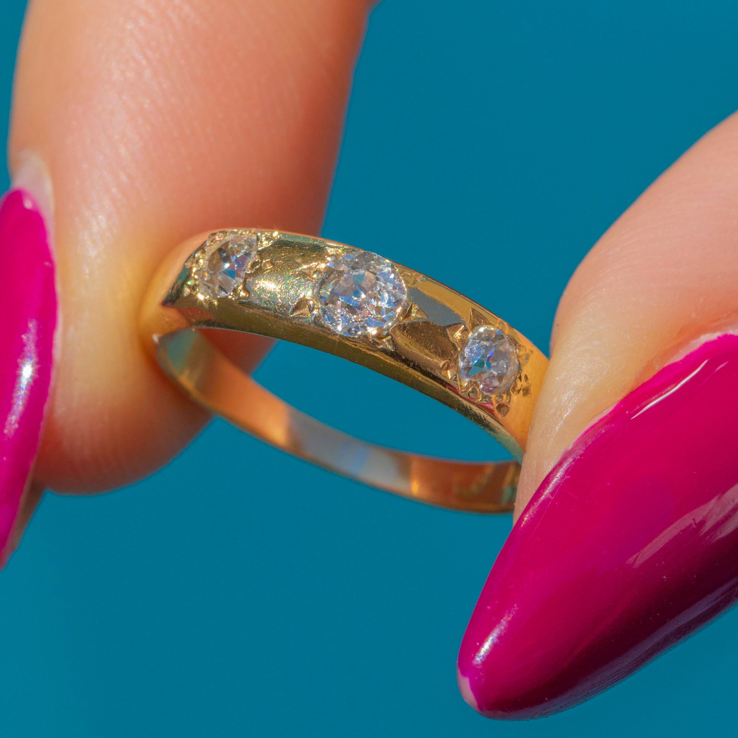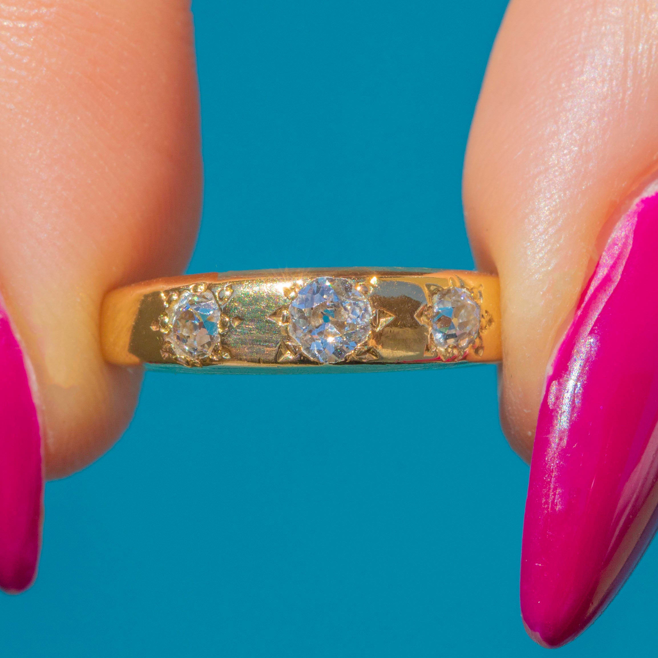 Crafted from buttery 15ct Gold, this Victorian ring features three shimmering Diamonds, each scintillating as they catch the light. Her Diamonds are displayed within star settings, giving this antique gypsy ring a lovely celestial charm.