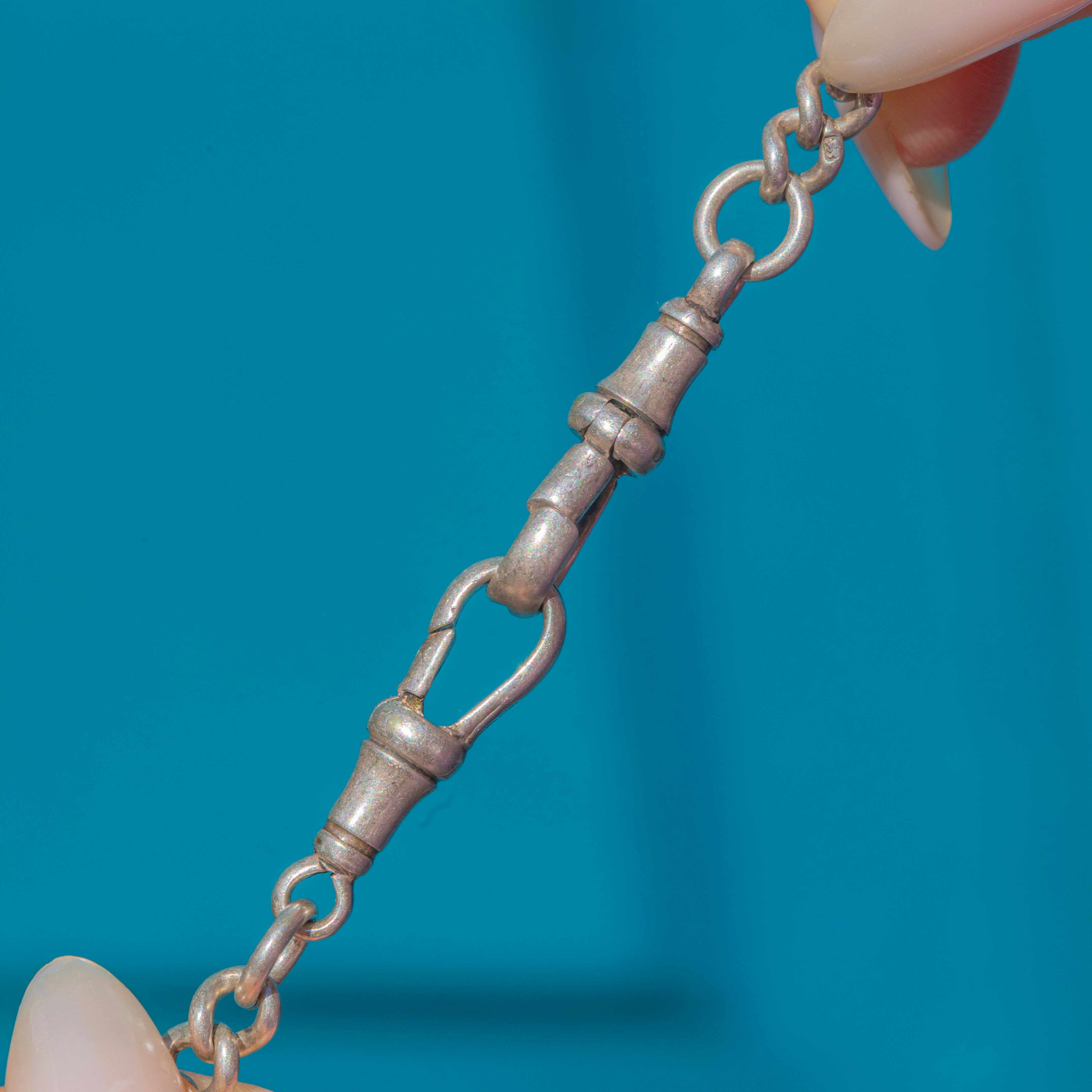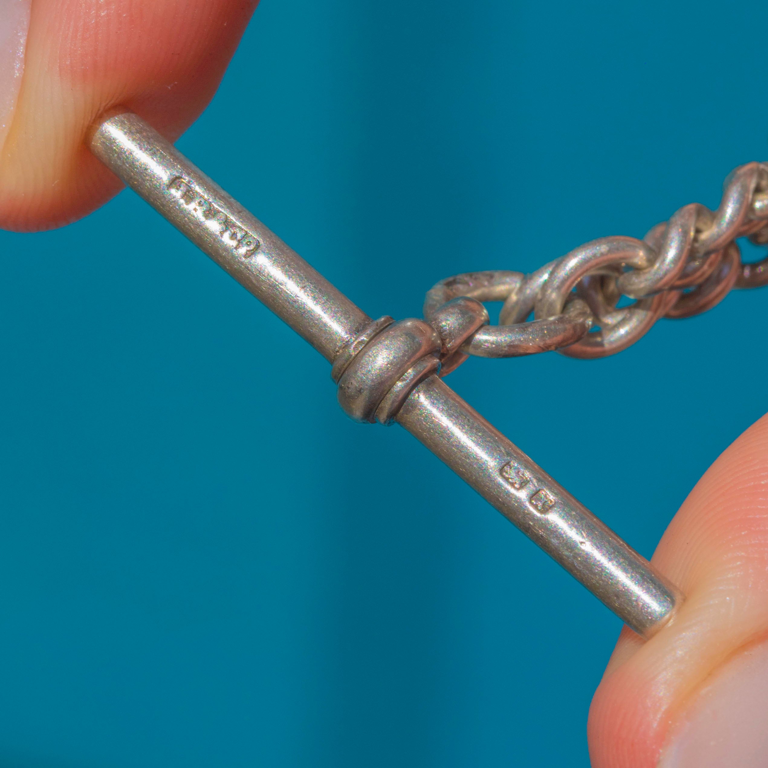 EXCELLENT. An excellent Sterling Silver Albert chain with 2x dog-clips that work perfectly and a t-bar. The links are all secure and gently graduate in size. This is a fabulous piece.