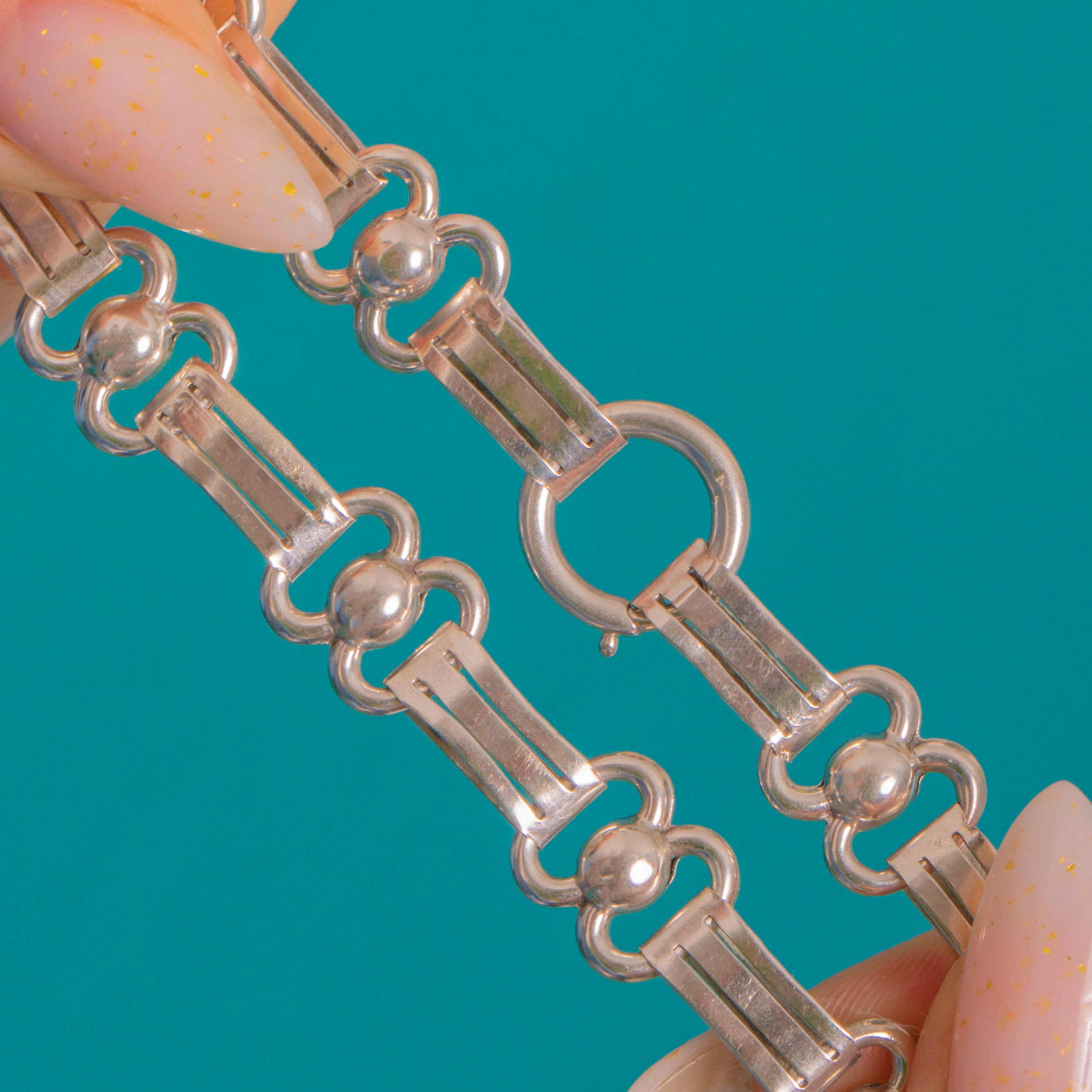 EXCELLENT: The Silver has a bright polish with only light surface wear and a pleasing, even patina in the recesses. The articulated links align and move smoothly, and the bolt ring clasp is secure and in good working order.