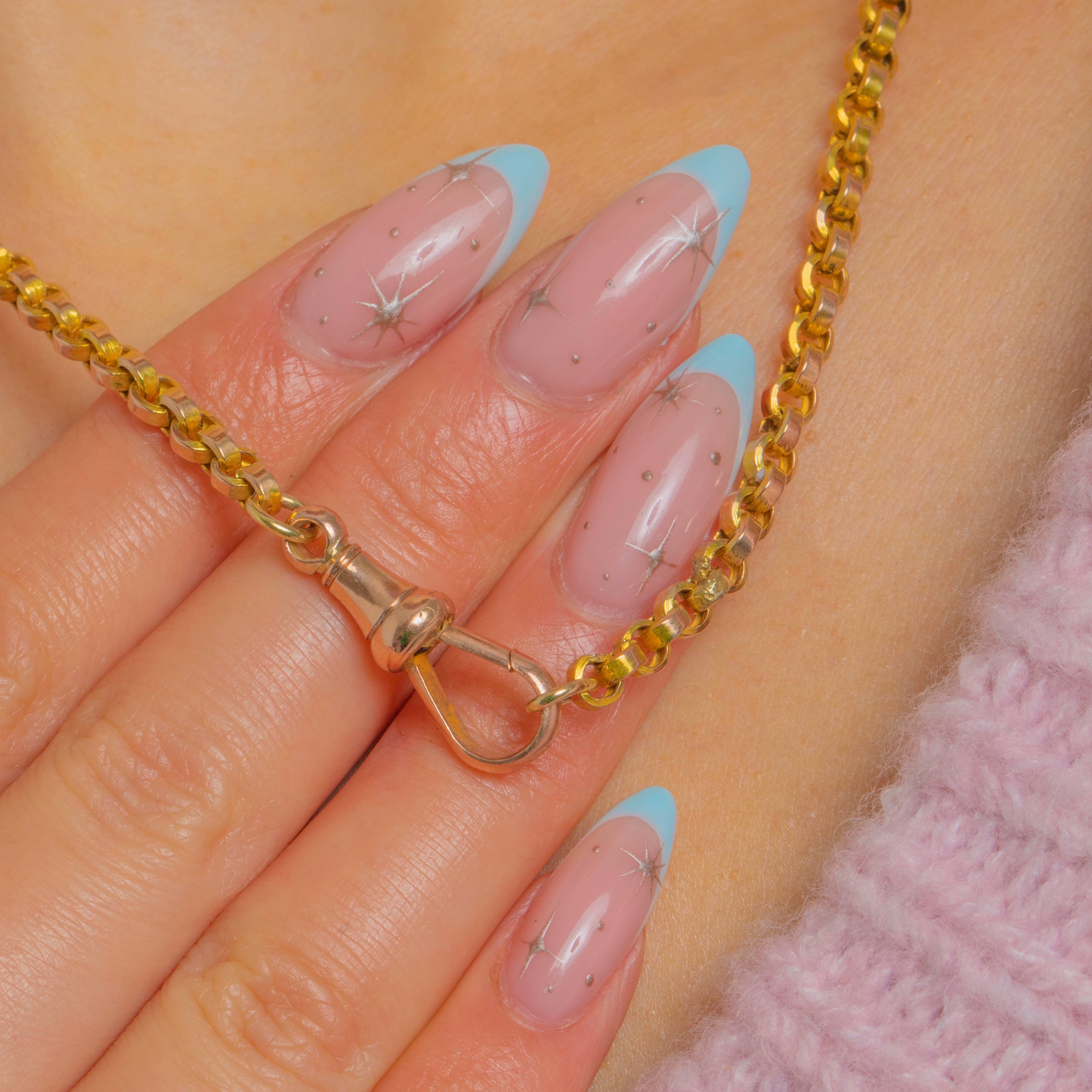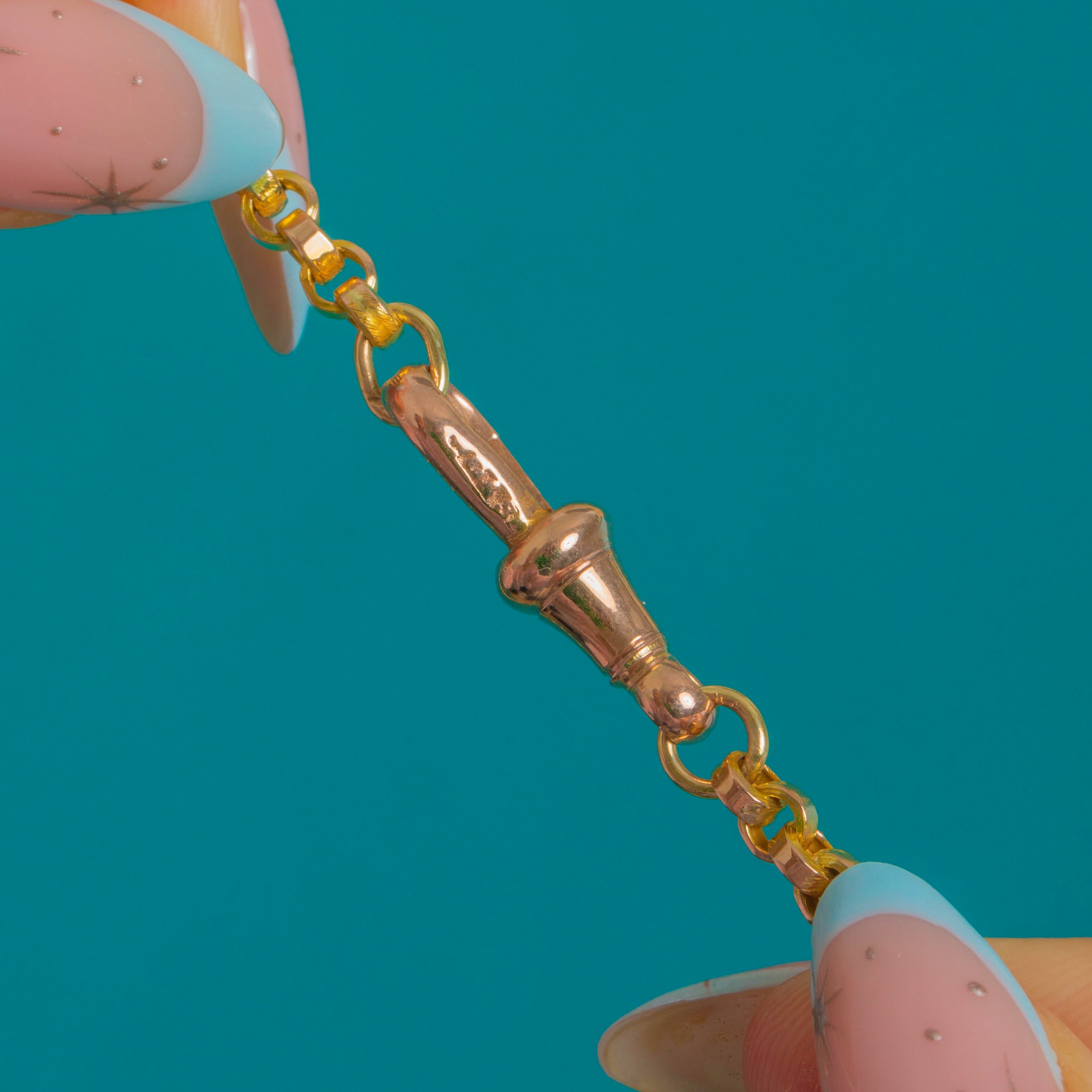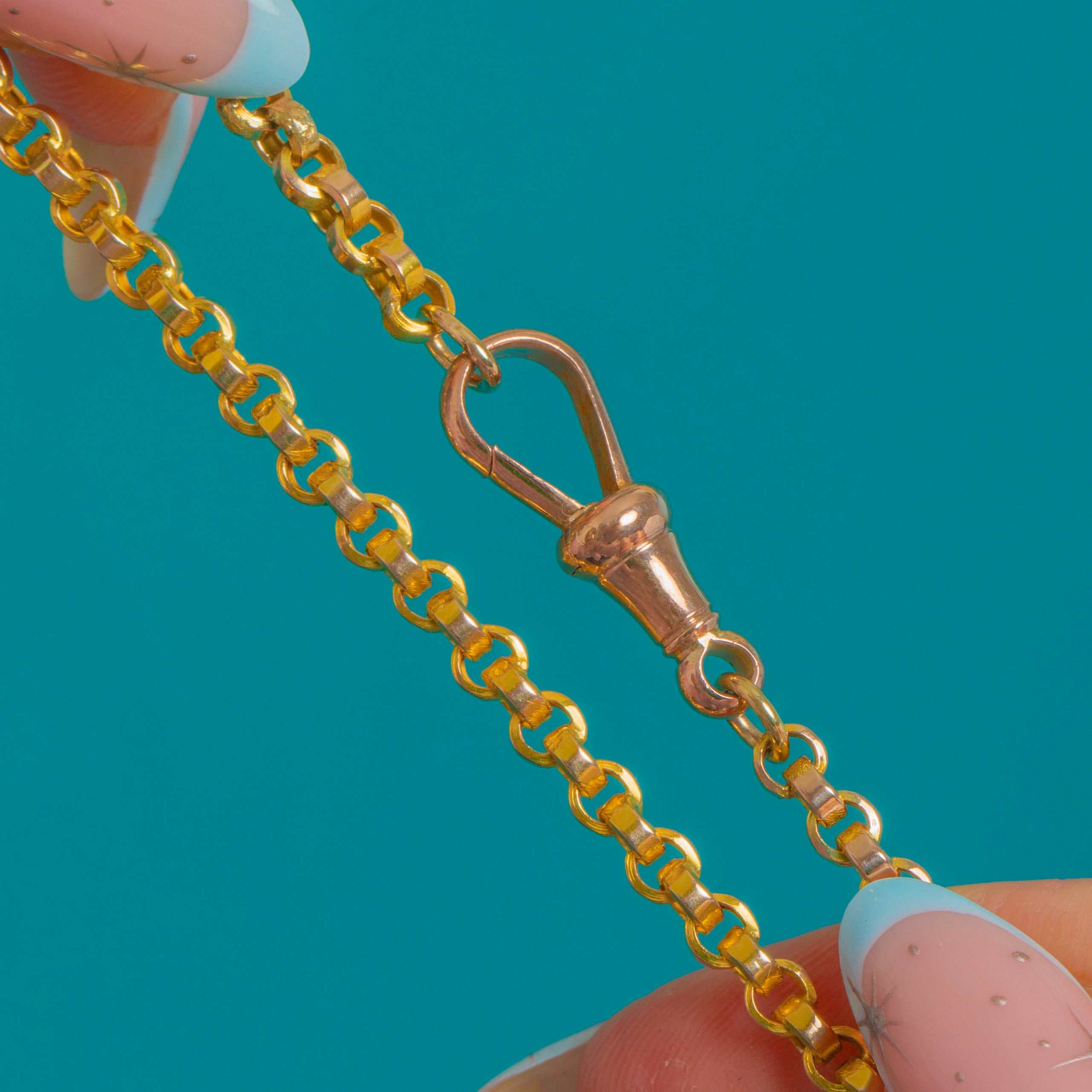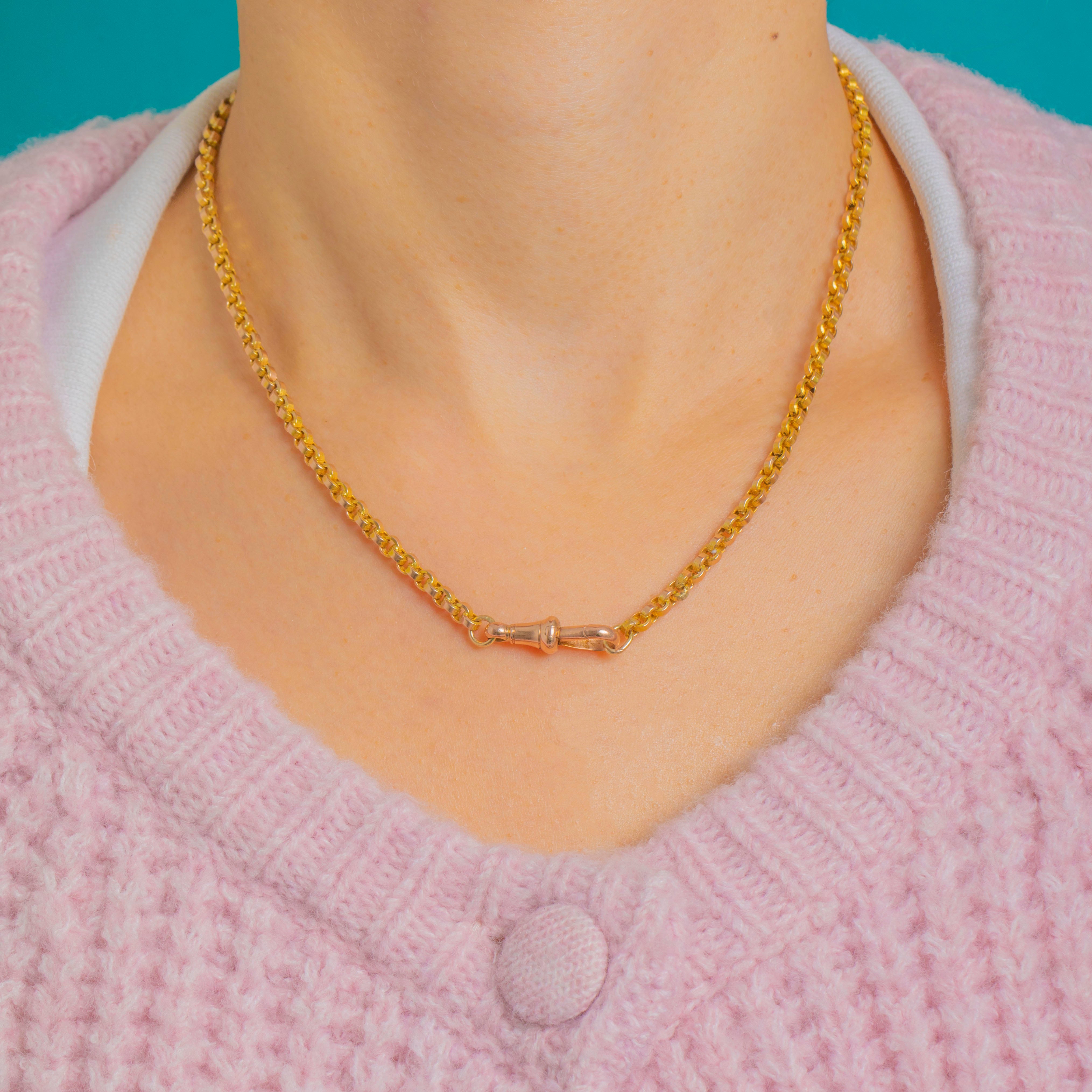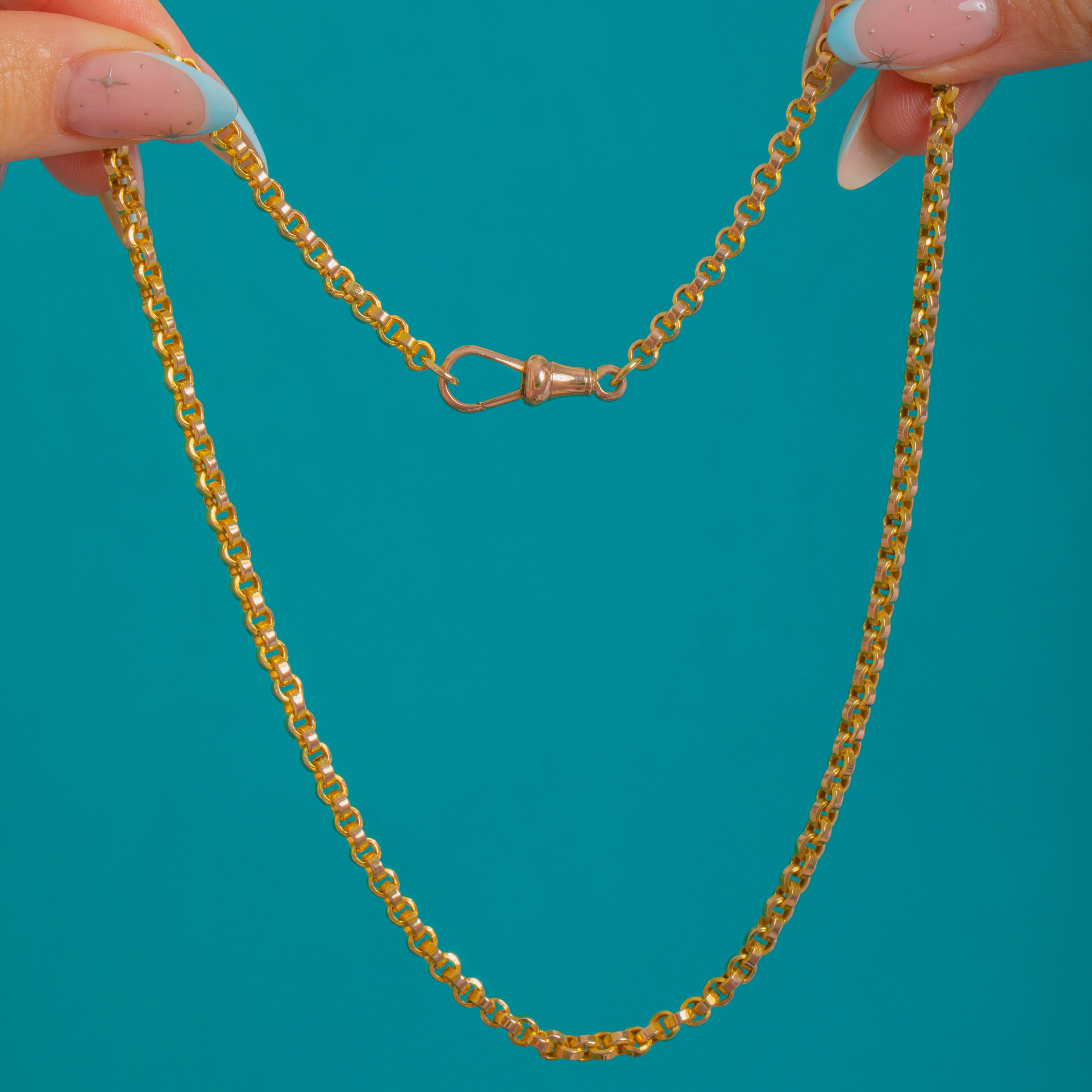 A classic Victorian 9ct Gold belcher chain with uniform rolo-style links, sleek and beautifully articulated. The spring dog-clip clasp gives a refined, watch-chain nod, reading a touch rosier against the yellow Gold for a subtle two-tone effect. At 16", it sits neatly at the base of the neck for a clean, minimalist look.