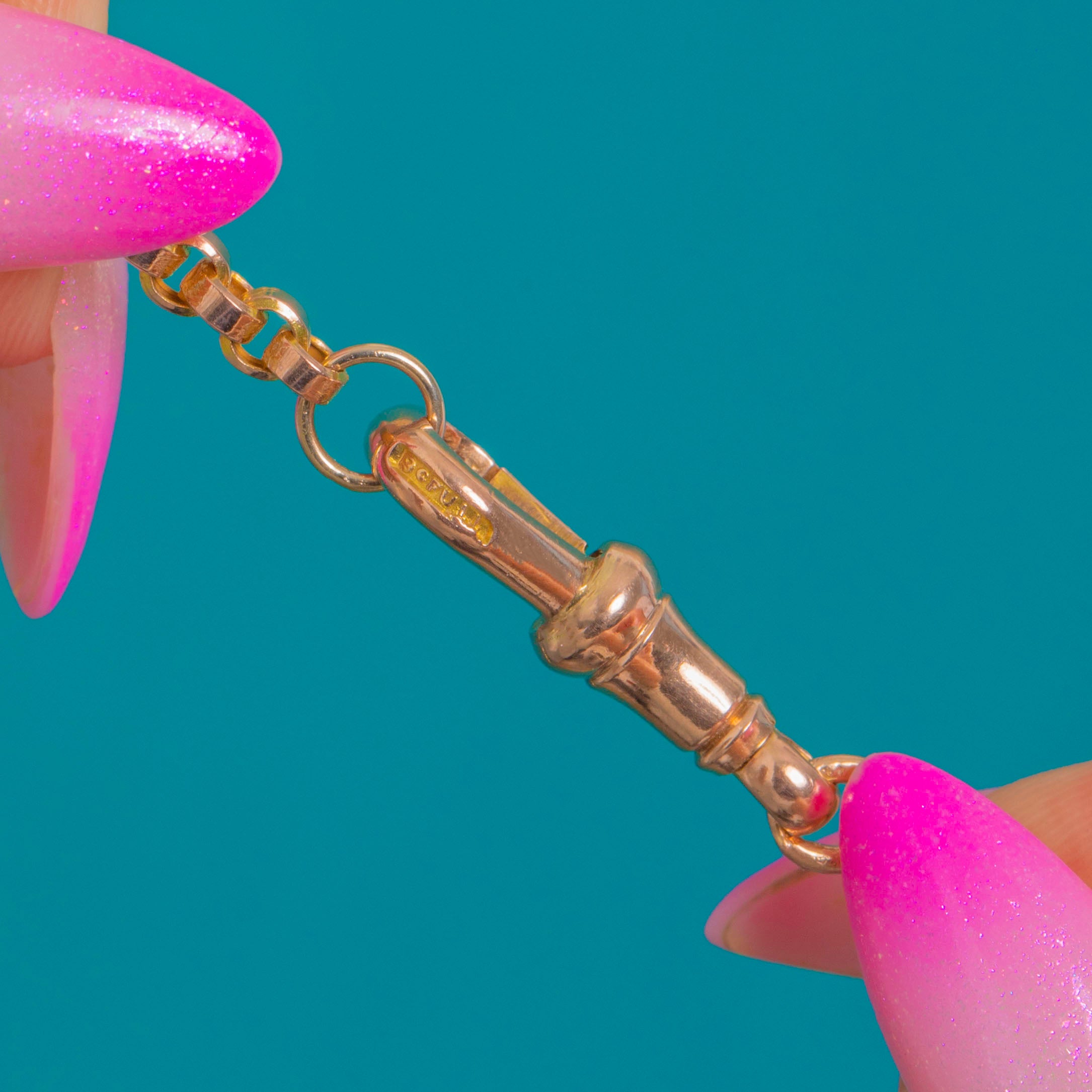 EXCELLENT: Bright, well-preserved Gold with only light surface wear typical of age. The links appear intact and lie smoothly; the dog-clip shows minor surface marks under close inspection.