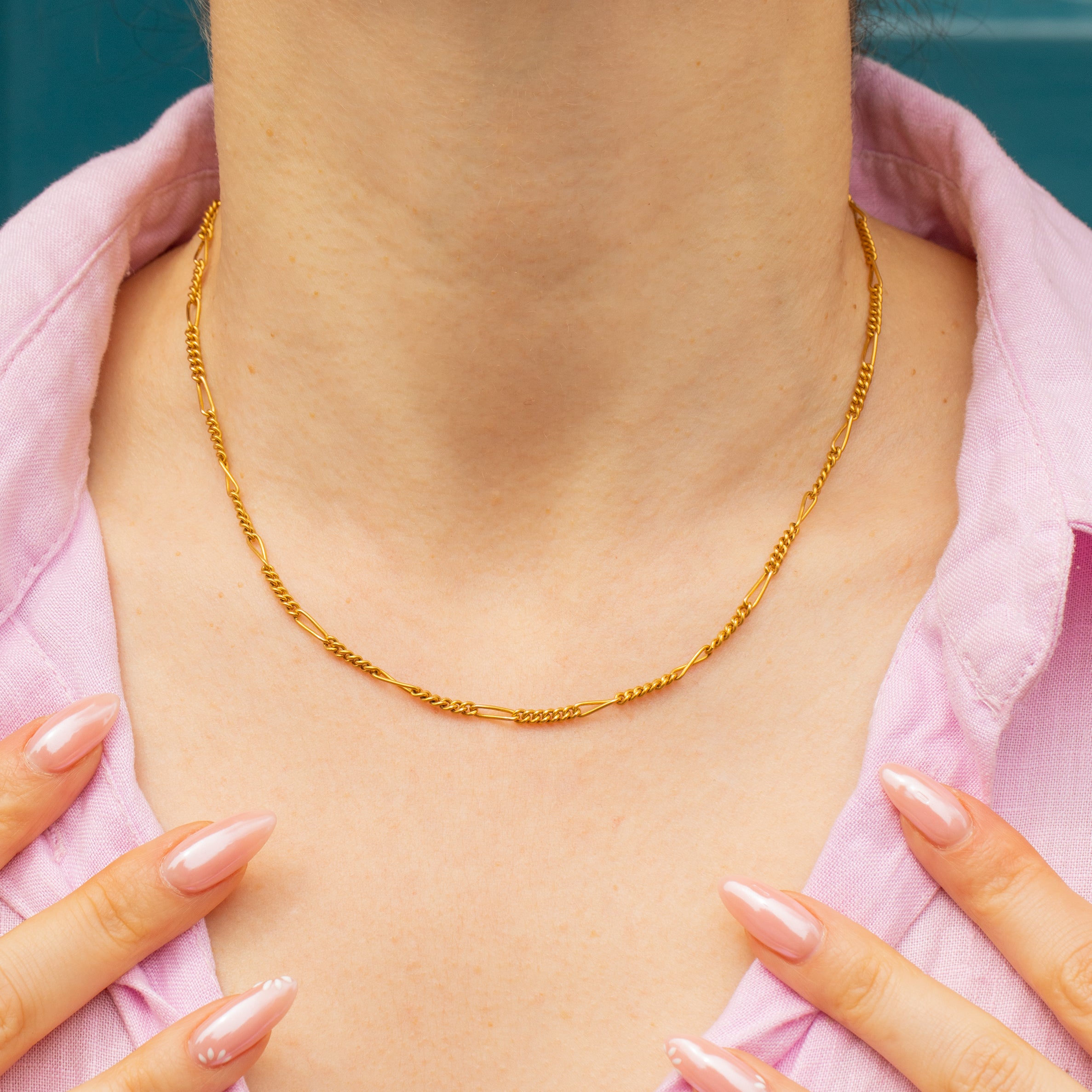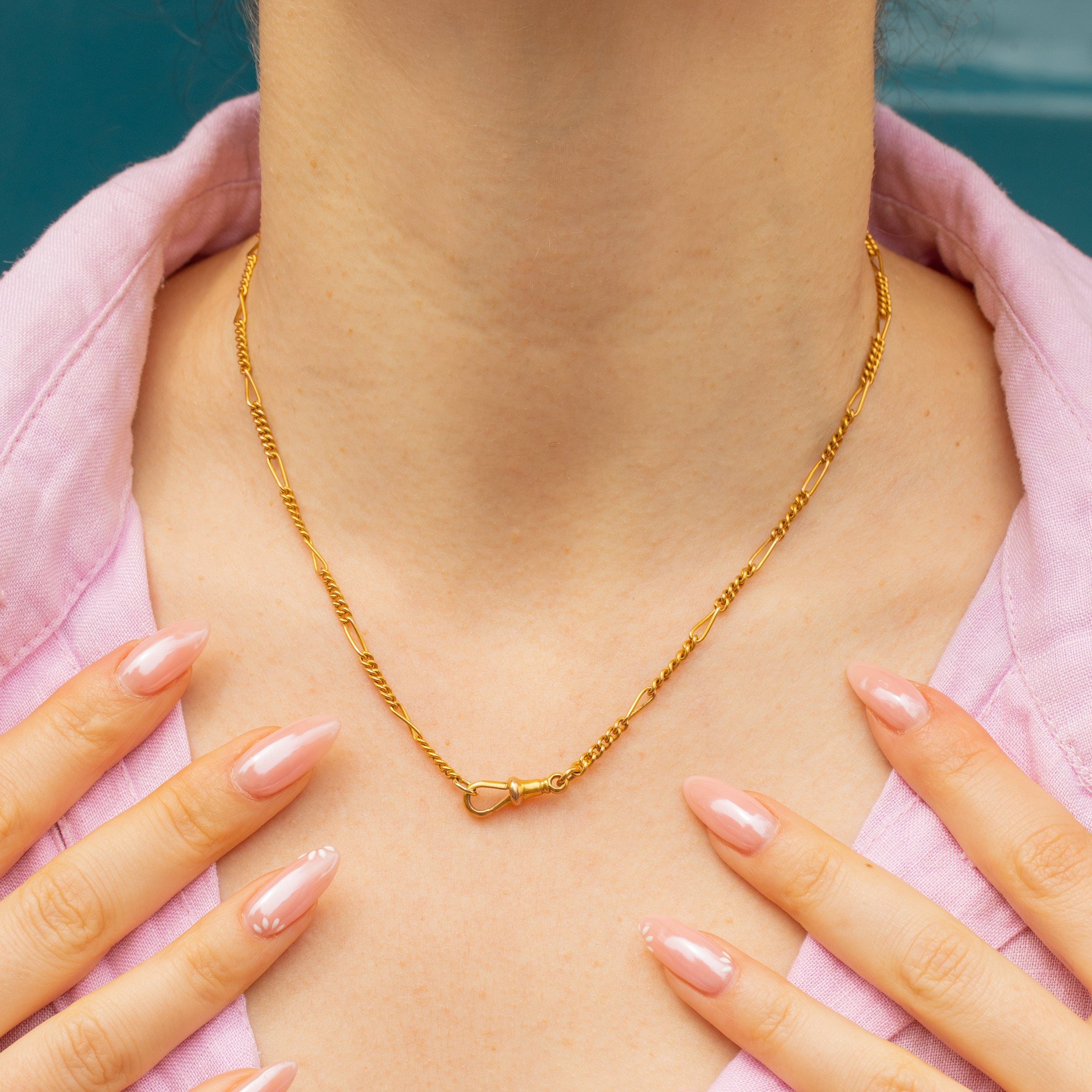 This 16" antique 9ct Gold figaro chain is a delicate delight. Boasting perfectly formed petite flattened links, her splendour is sure to win your heart!