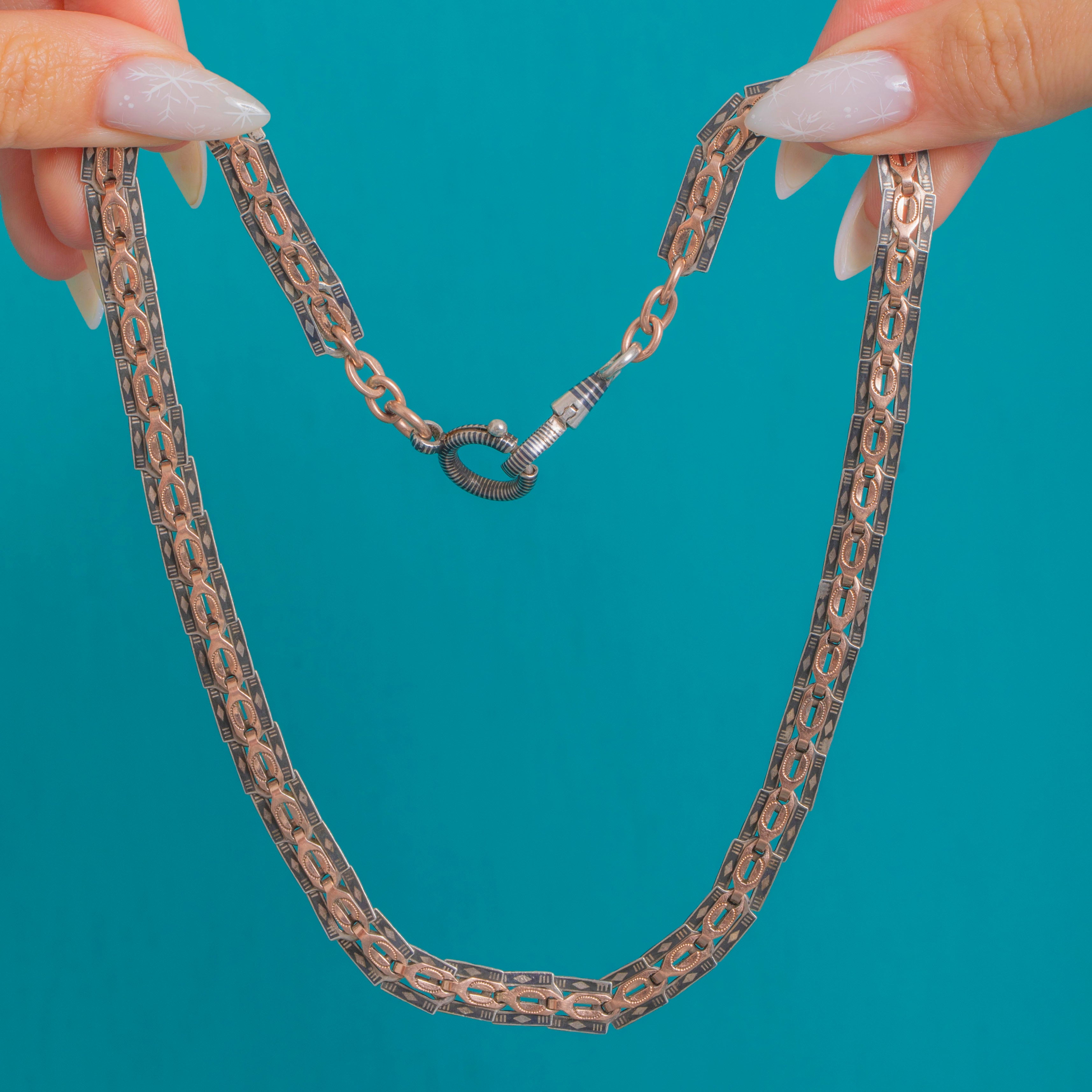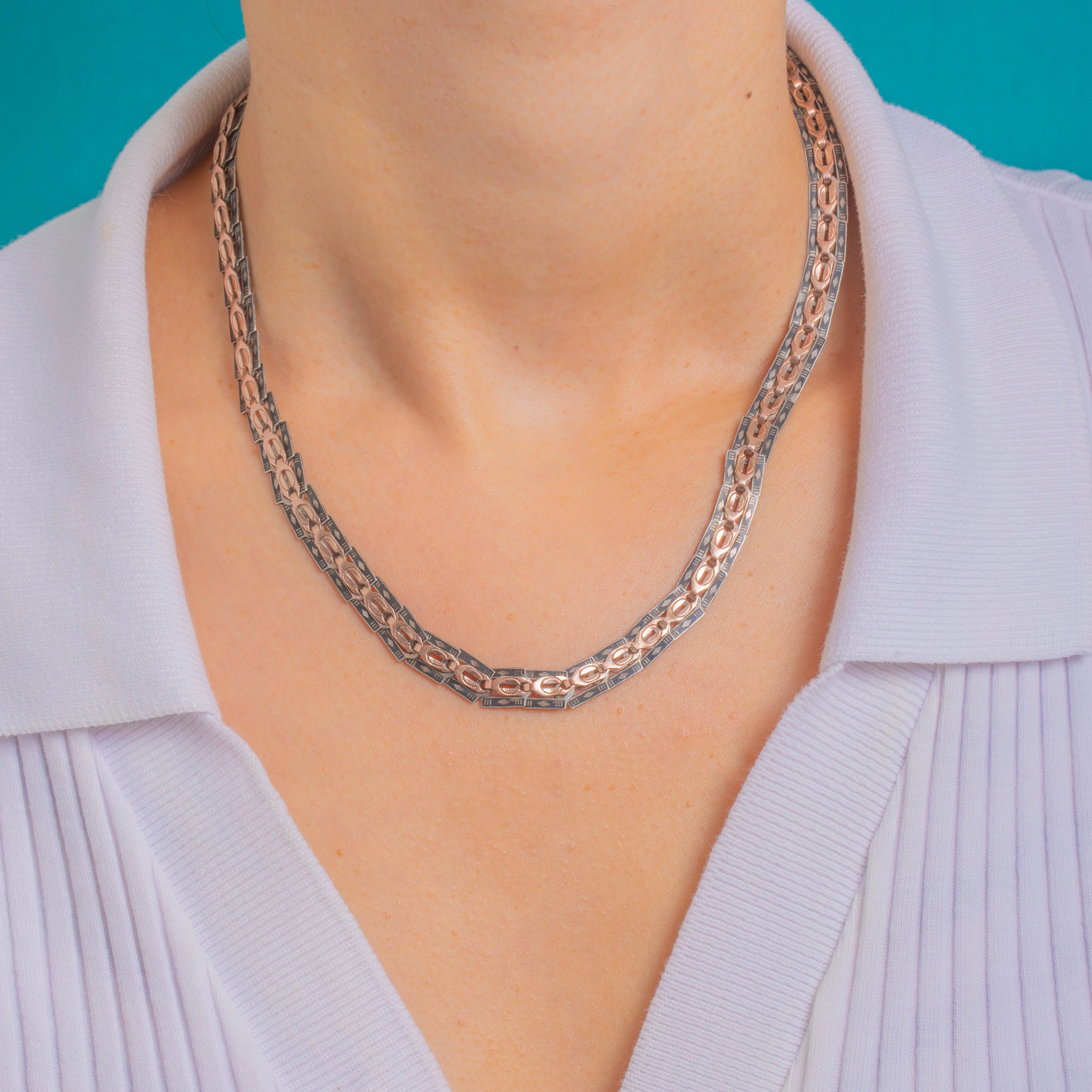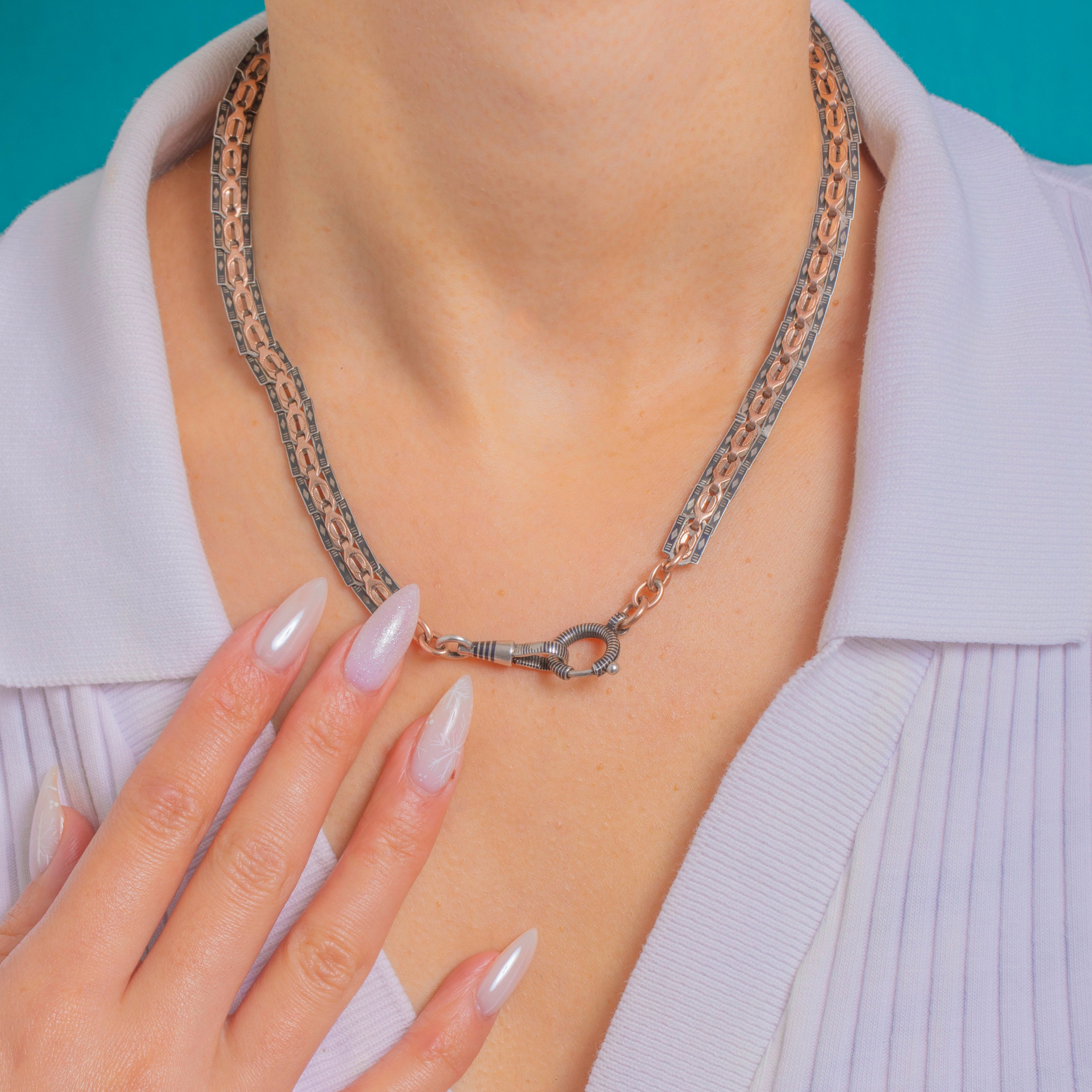 Bold, graphic and deliciously Victorian, this Silver niello collar lays flat around the neck in articulated “book-chain” style panels. Crisp geometric engraving plays against inky niello grounds, giving beautiful light-and-dark contrast that feels elegant.