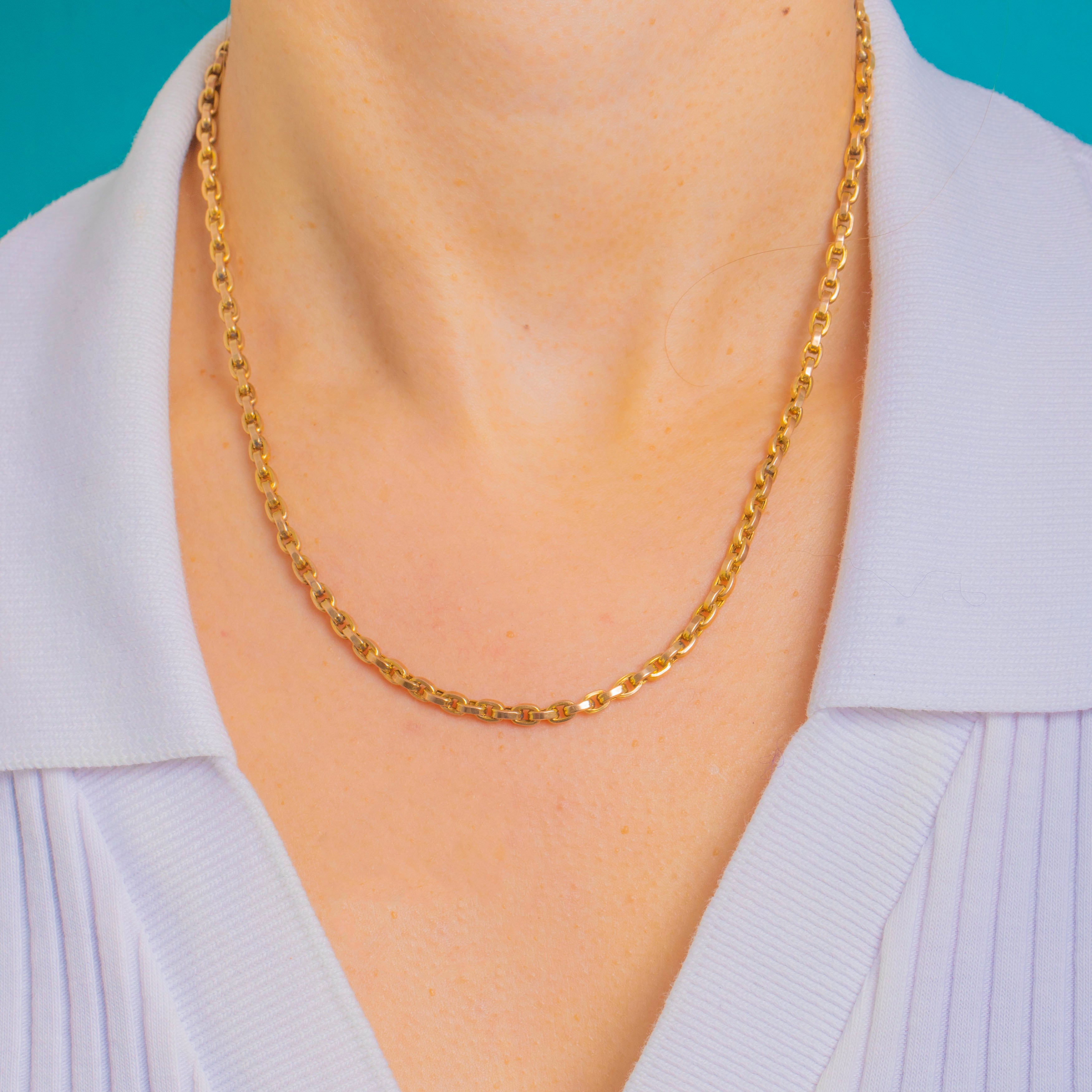 A timeless Victorian 9ct Gold belcher chain, expertly made with smooth 3mm round links and finished with a classic dog-clip. Its warm yellow hue, bright polish and elegant simplicity give this antique staple a refined, versatile presence at the base of the neck.