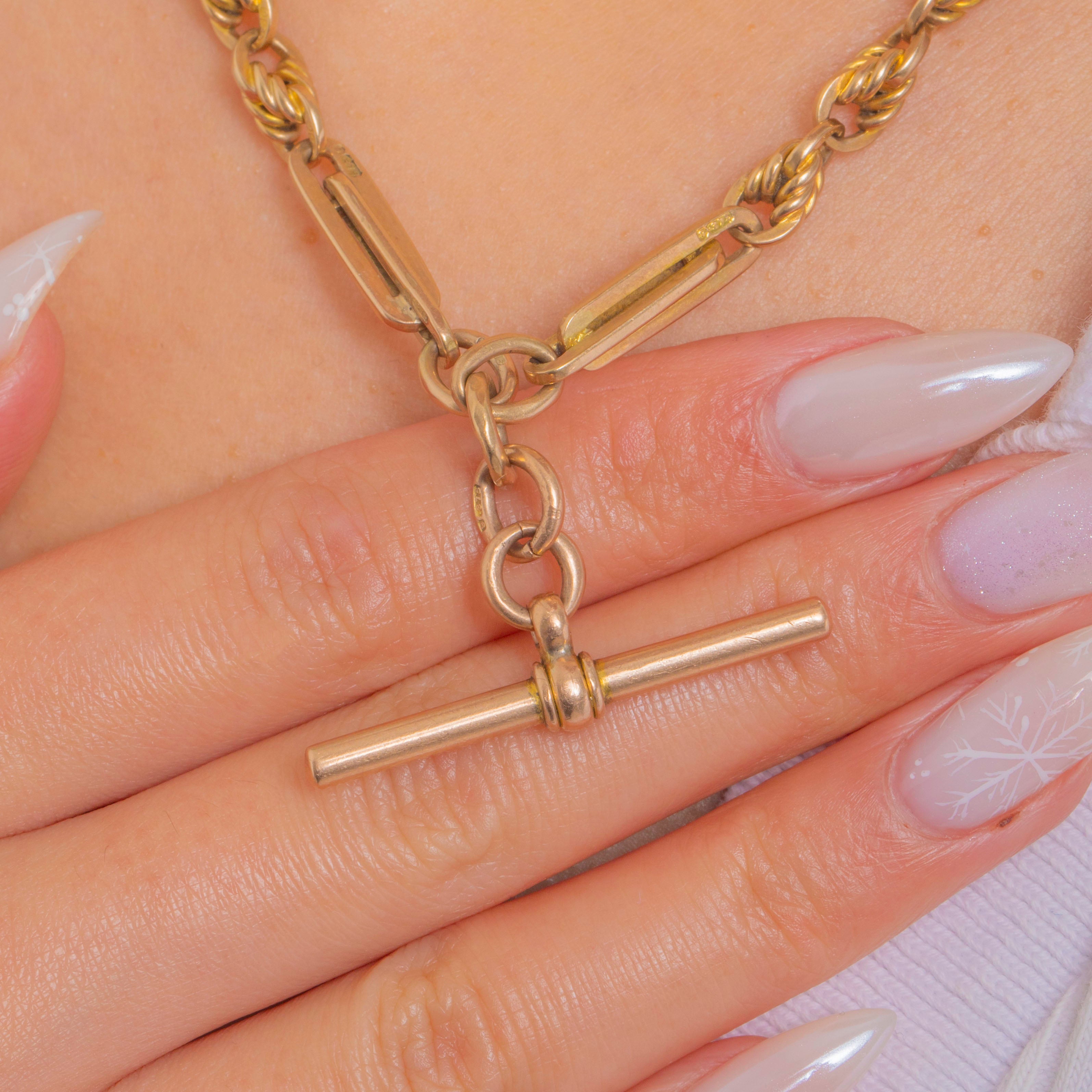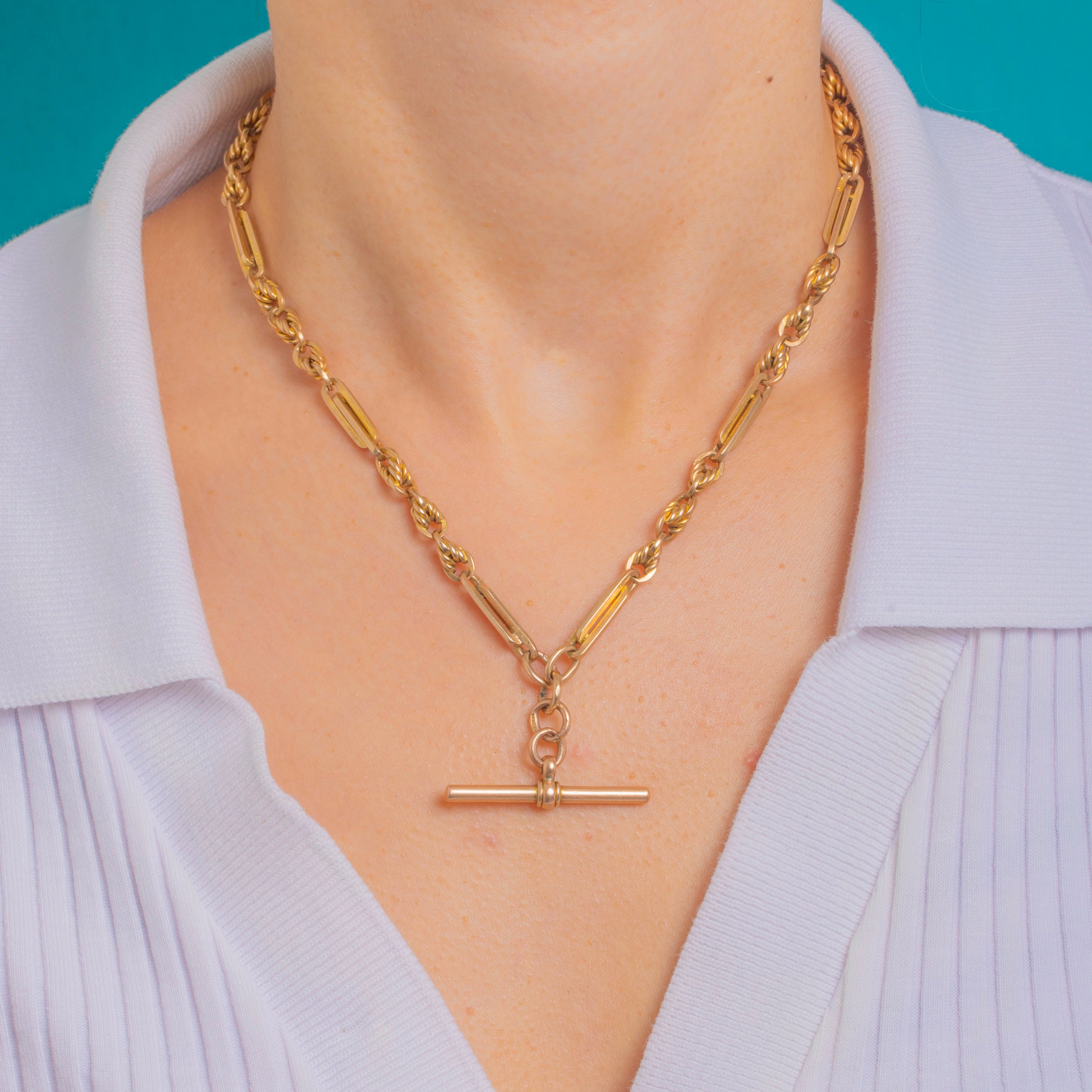 16" Victorian 9ct Gold Fancy Knot & Fetter Link Chain with T-bar, Bolt-Ring & Dog-Clip 30.7g