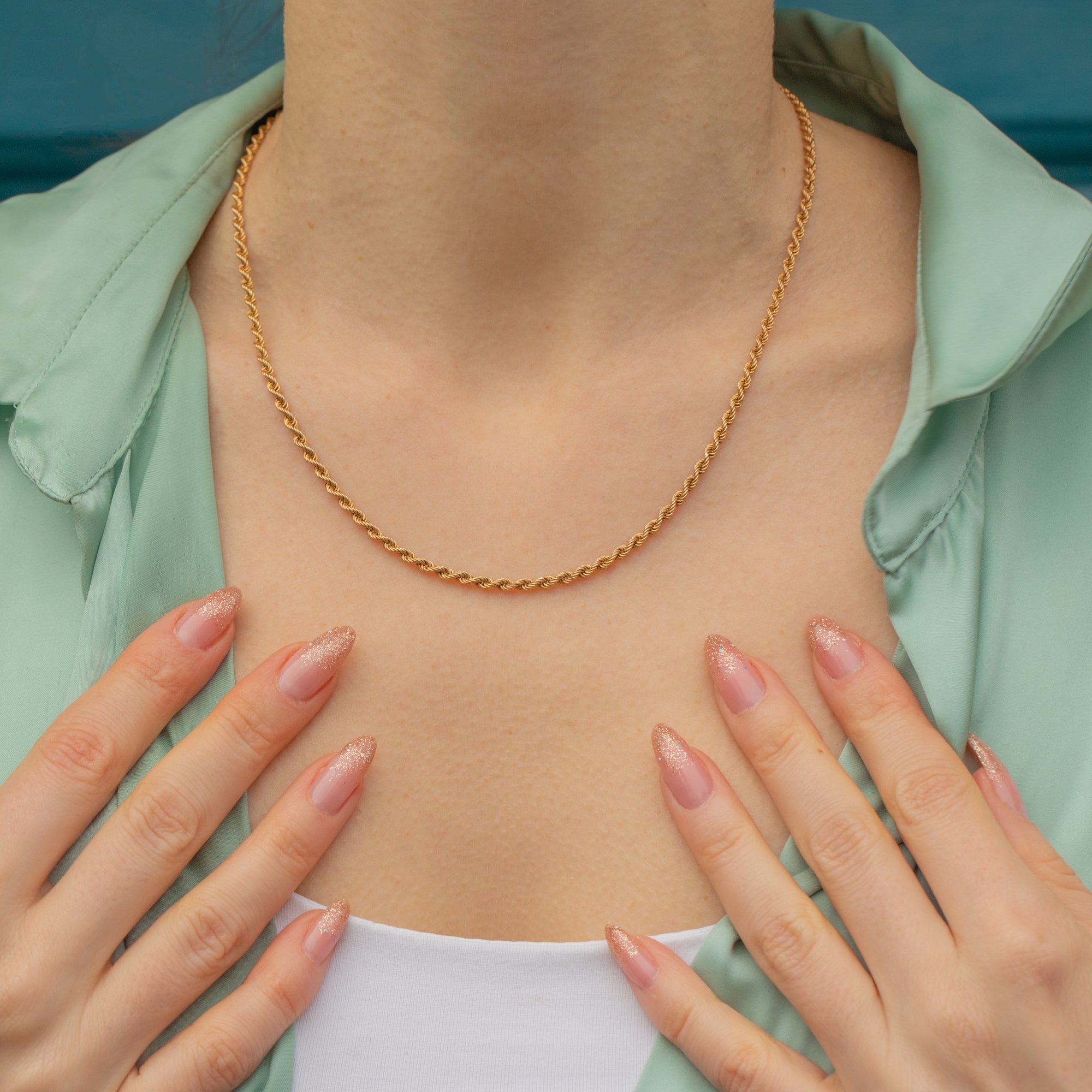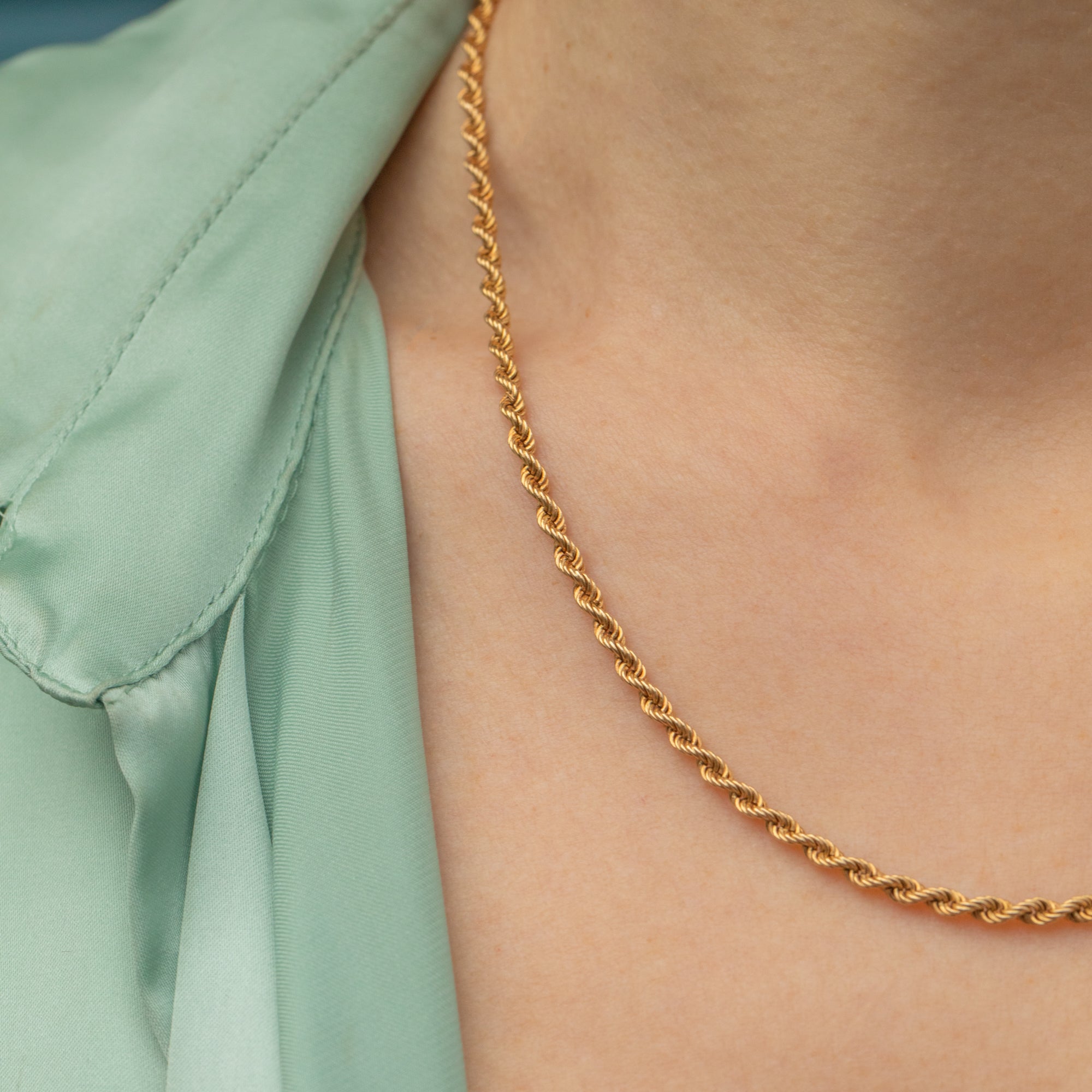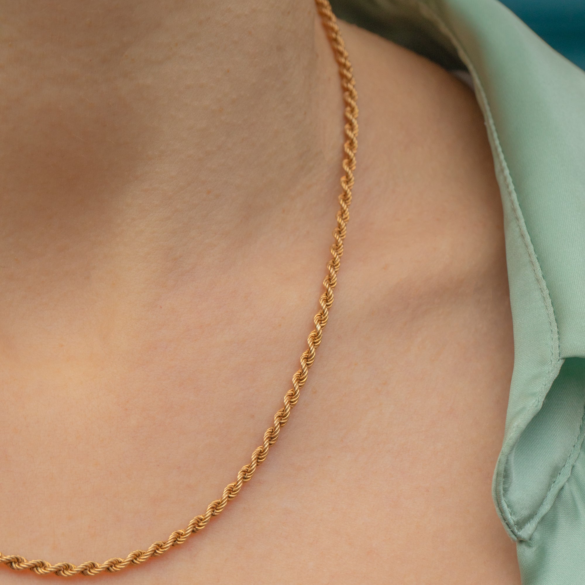 This 17.5" 9ct Gold twisted rope chain is a gorgeous piece that will become your new staple. Crafted from saturated, buttery 9ct Gold, she is a sumptuous delight to adorn your décolletage!