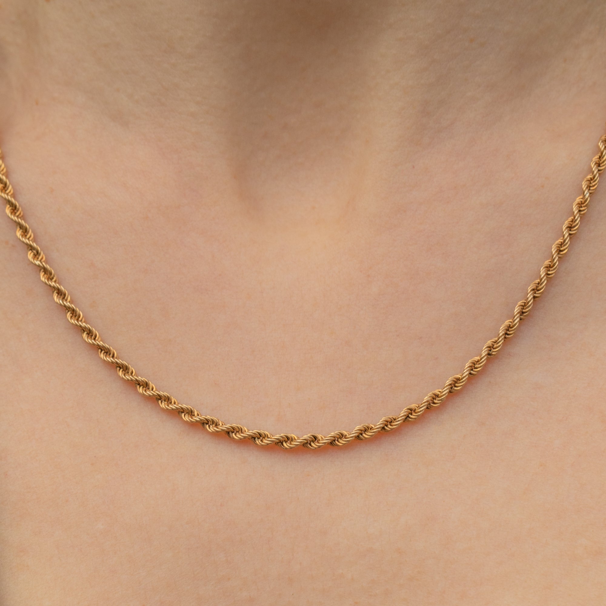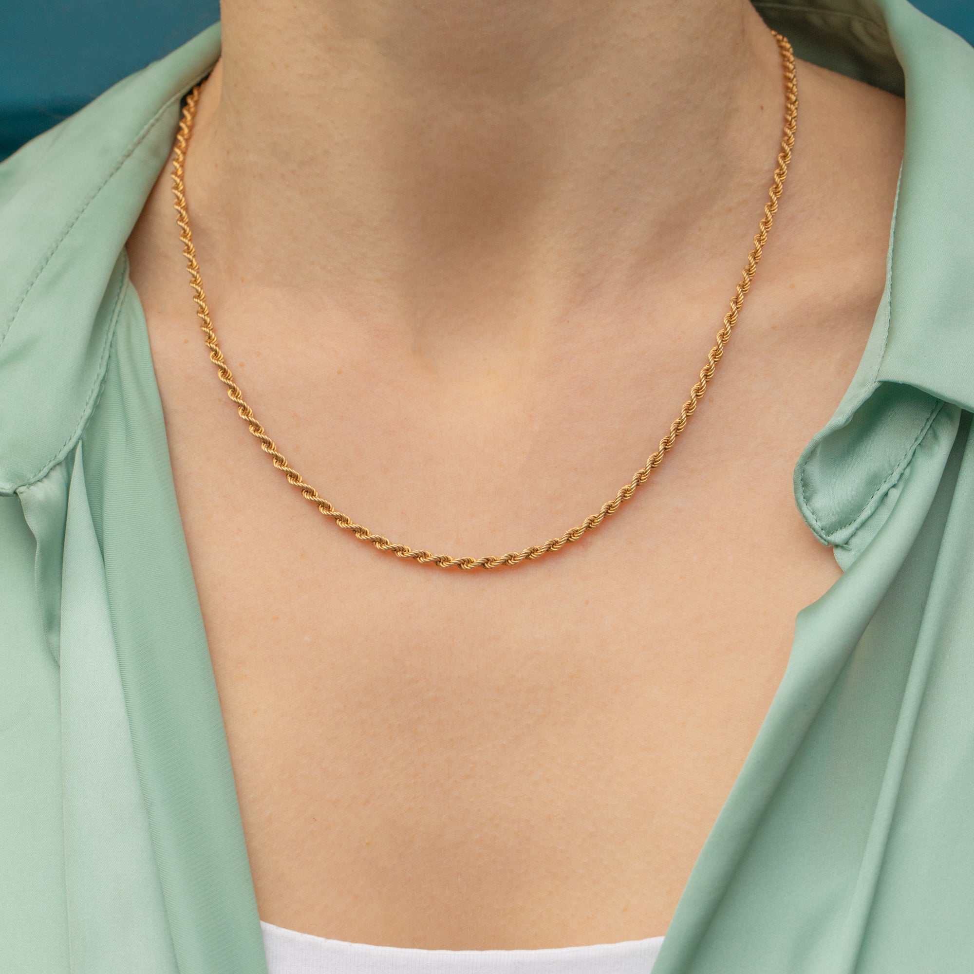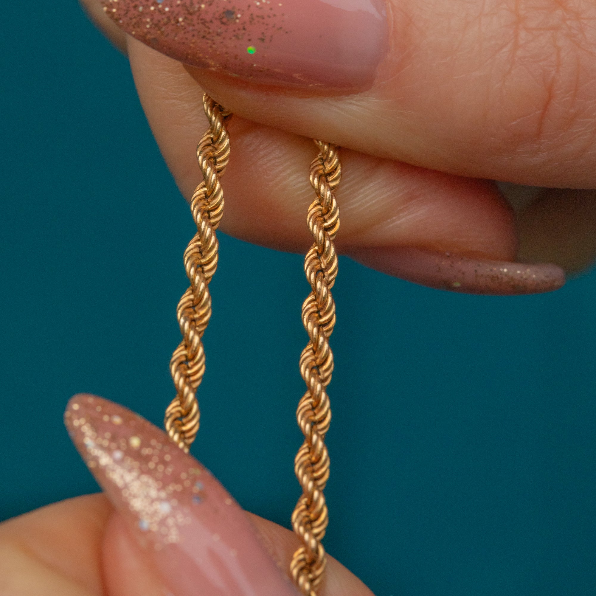 This 17.5" 9ct Gold twisted rope chain is a gorgeous piece that will become your new staple. Crafted from saturated, buttery 9ct Gold, she is a sumptuous delight to adorn your décolletage!
