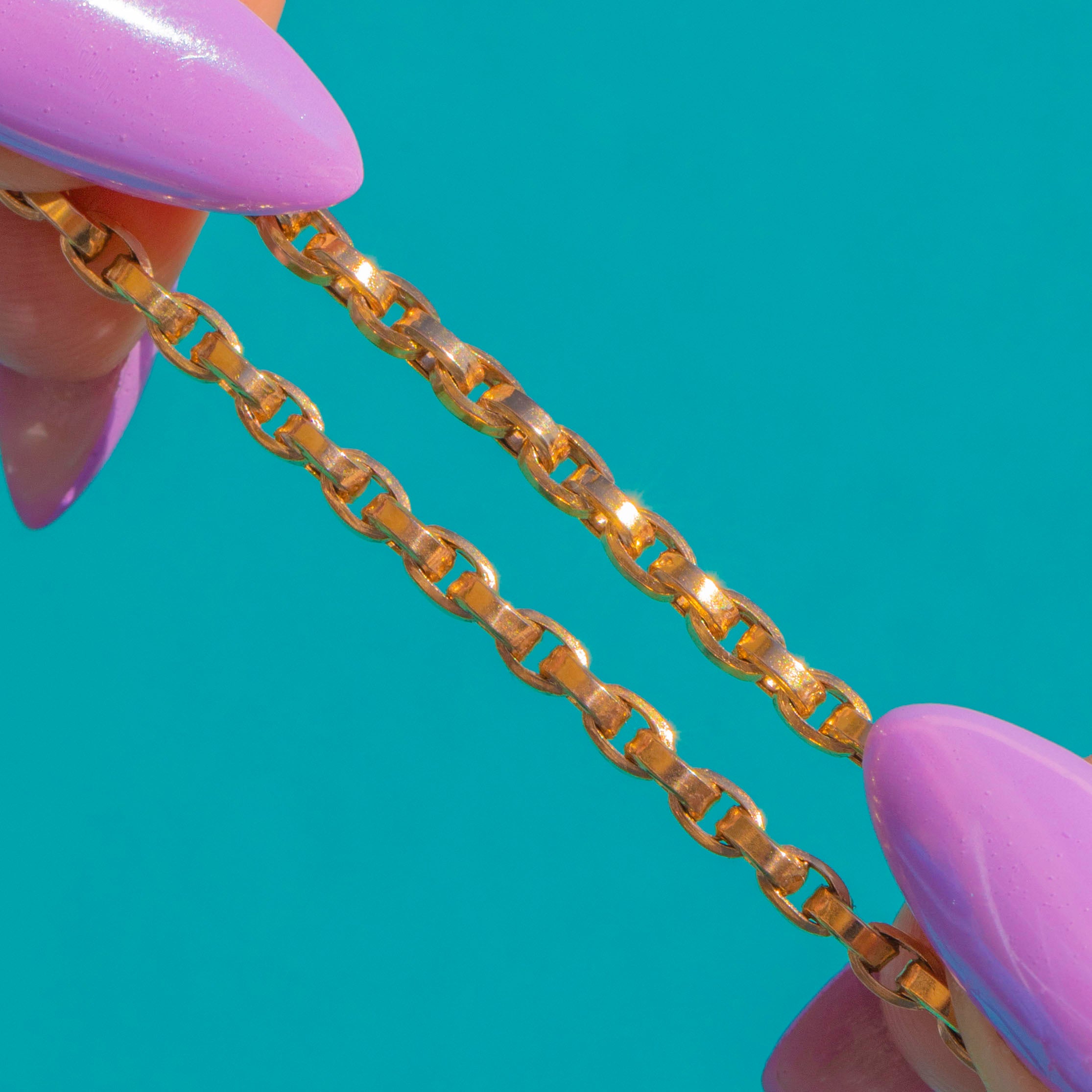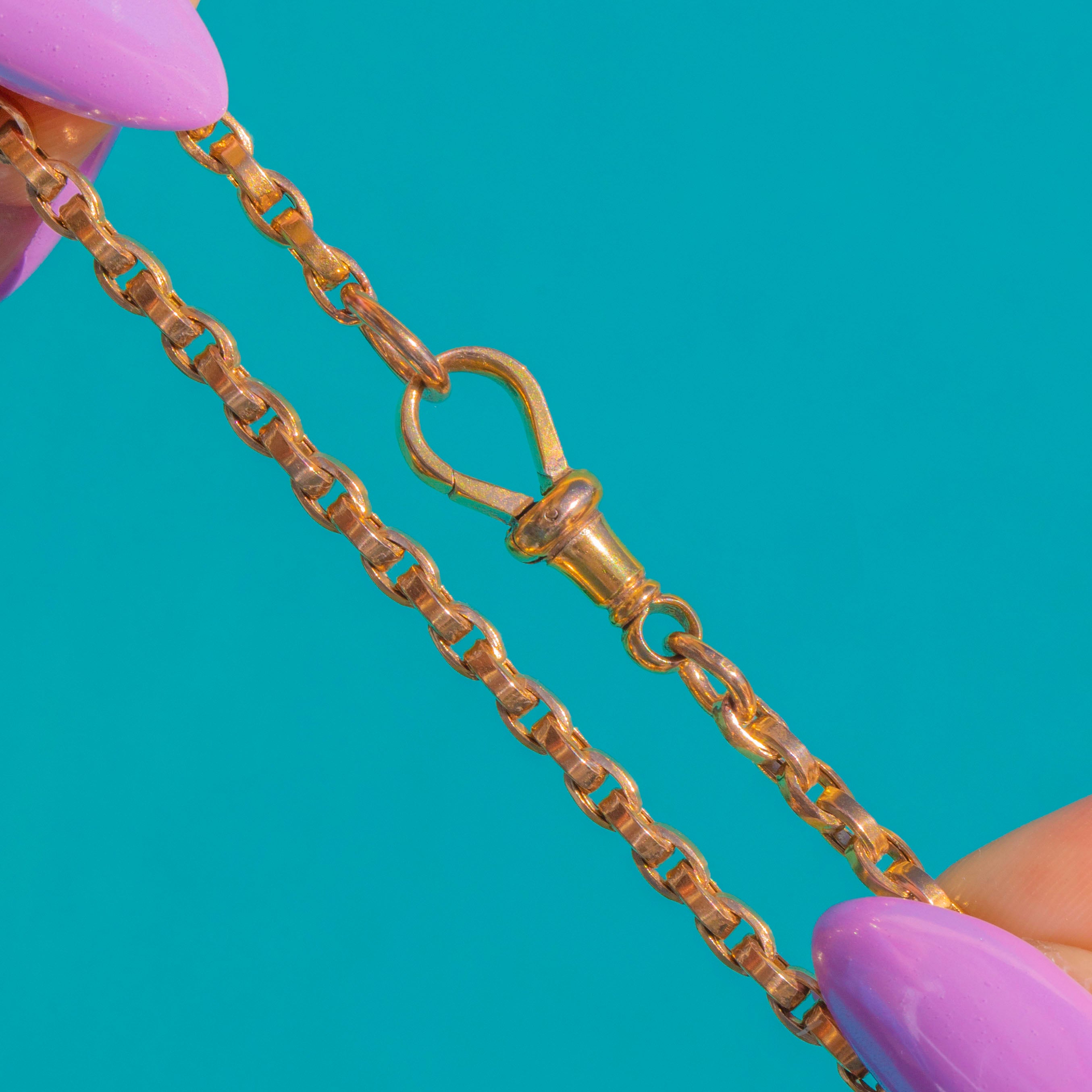 Timeless and beautifully versatile, this antique 9ct Gold belcher chain hails from the Victorian era. The classic belcher links catch the light with an elegant, honeyed glow, creating a sleek silhouette that sits effortlessly at the collarbone.