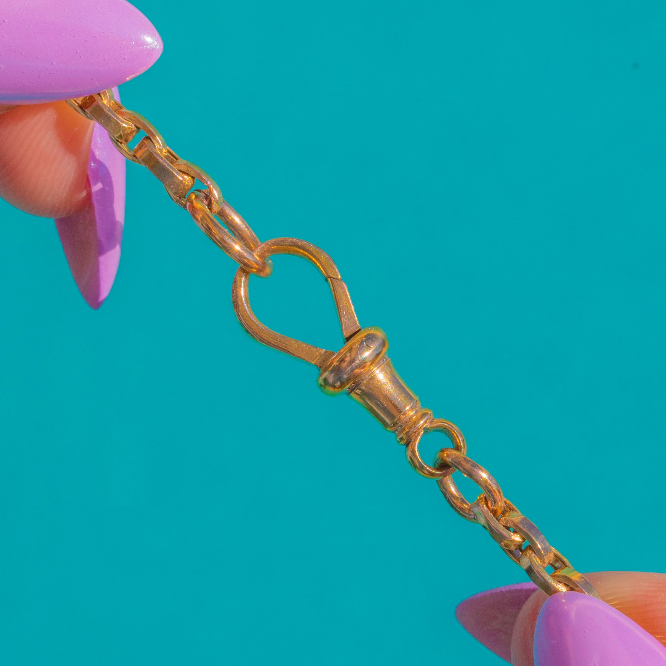 EXCELLENT: All links are securely connected with no damage to note, retaining a lovely antique glow. The dog-clip is in wonderful condition and fastens securely. Light, sympathetic wear consistent with age, showing this piece has been well cared for.