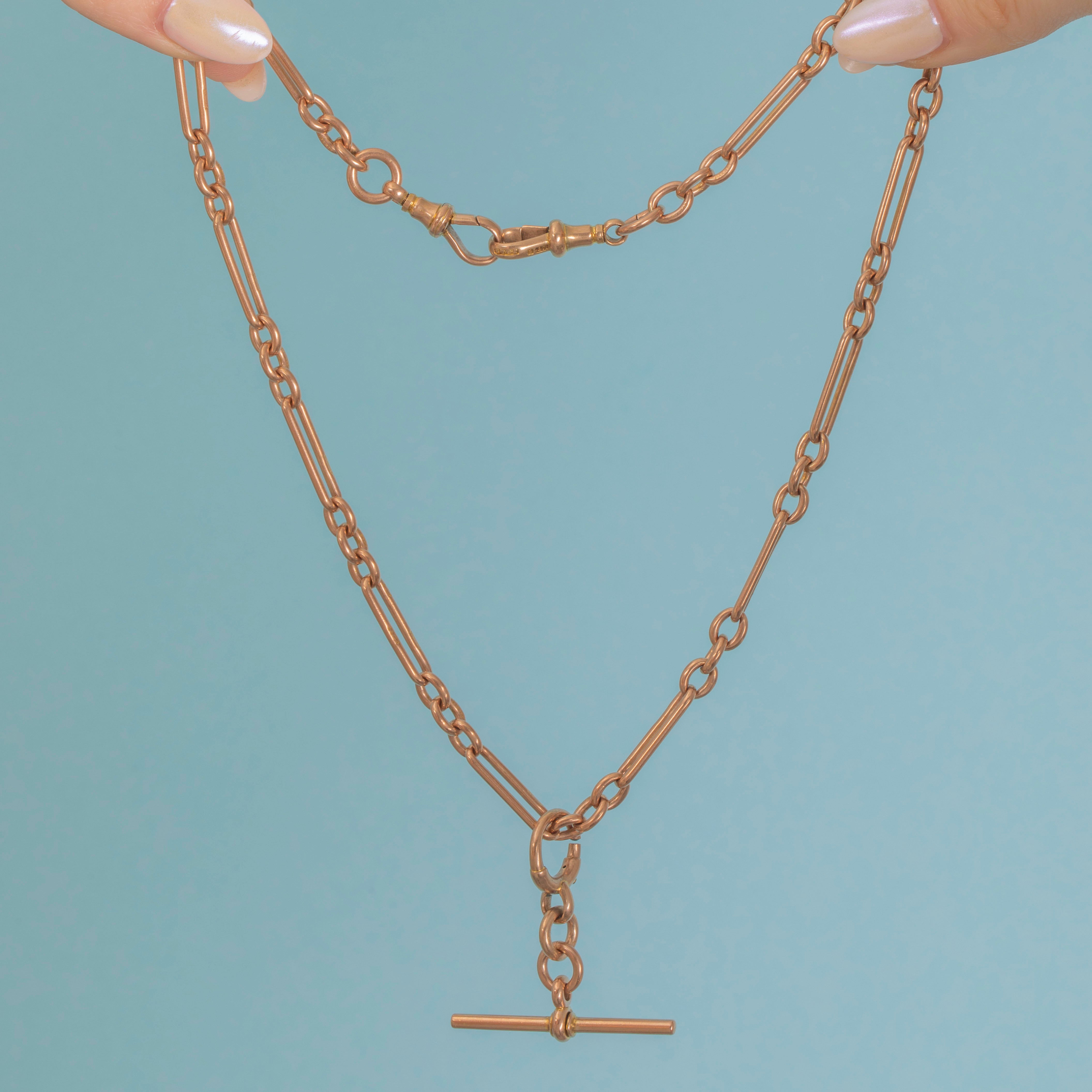 This exquisite antique 9ct Gold Albert chain will instantly bring statement to your attire! Crafted entirely from sumptuous 9ct rose-hued Gold, this chunky delight is formed of elegant trombone links and comes complete with two matching dog-clips making this antique chain a highly collectible piece.