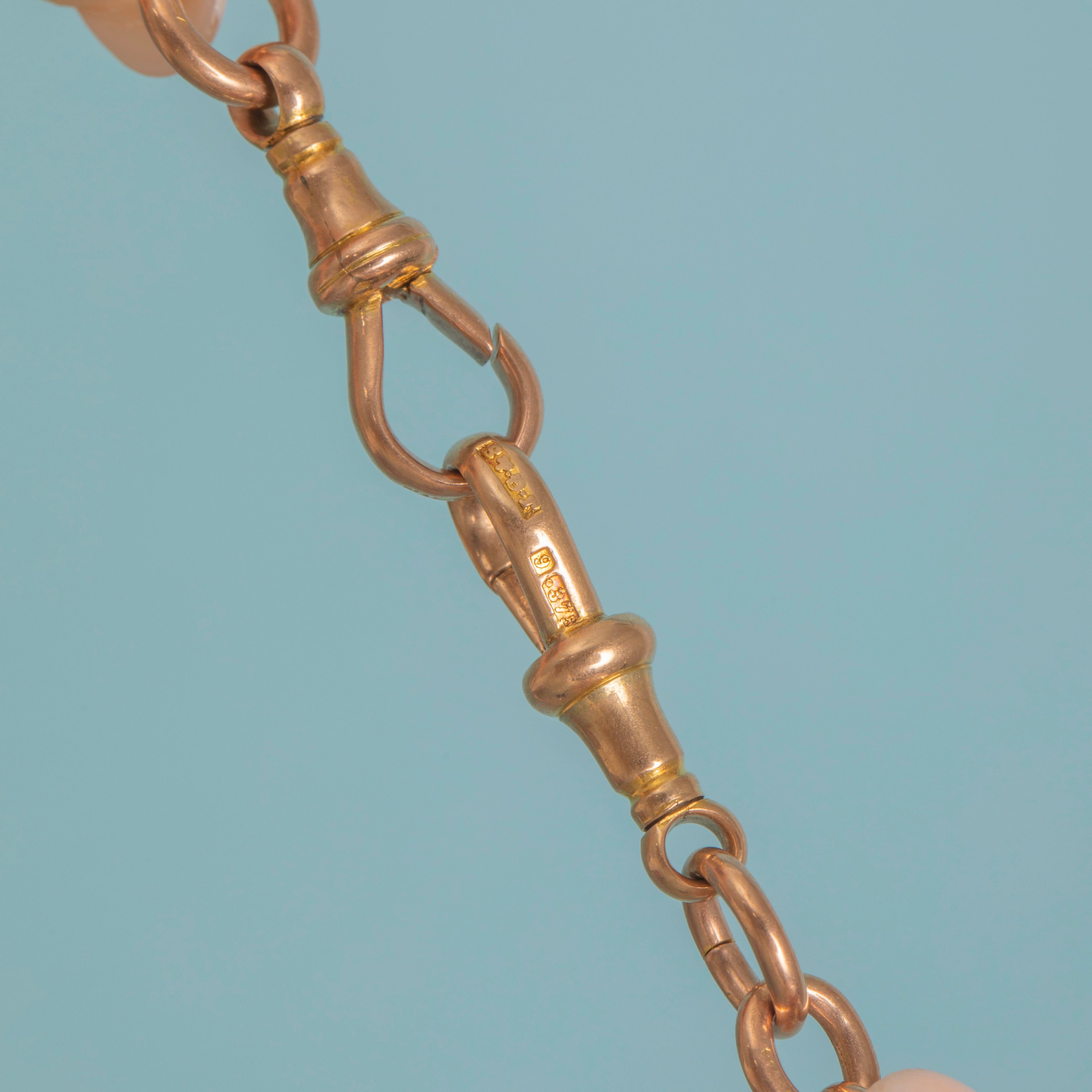 VERY GOOD. This antique 9ct Gold Albert chain is in very good condition. The Gold is radiant and has a lovely blushed hue and each link is securely affixed and free from dings. The bolt-ring needs a helping hand to close, but once in place, it does shut securely. The dog clips are in perfect working condition, promising you many more years of wear and enjoyment!