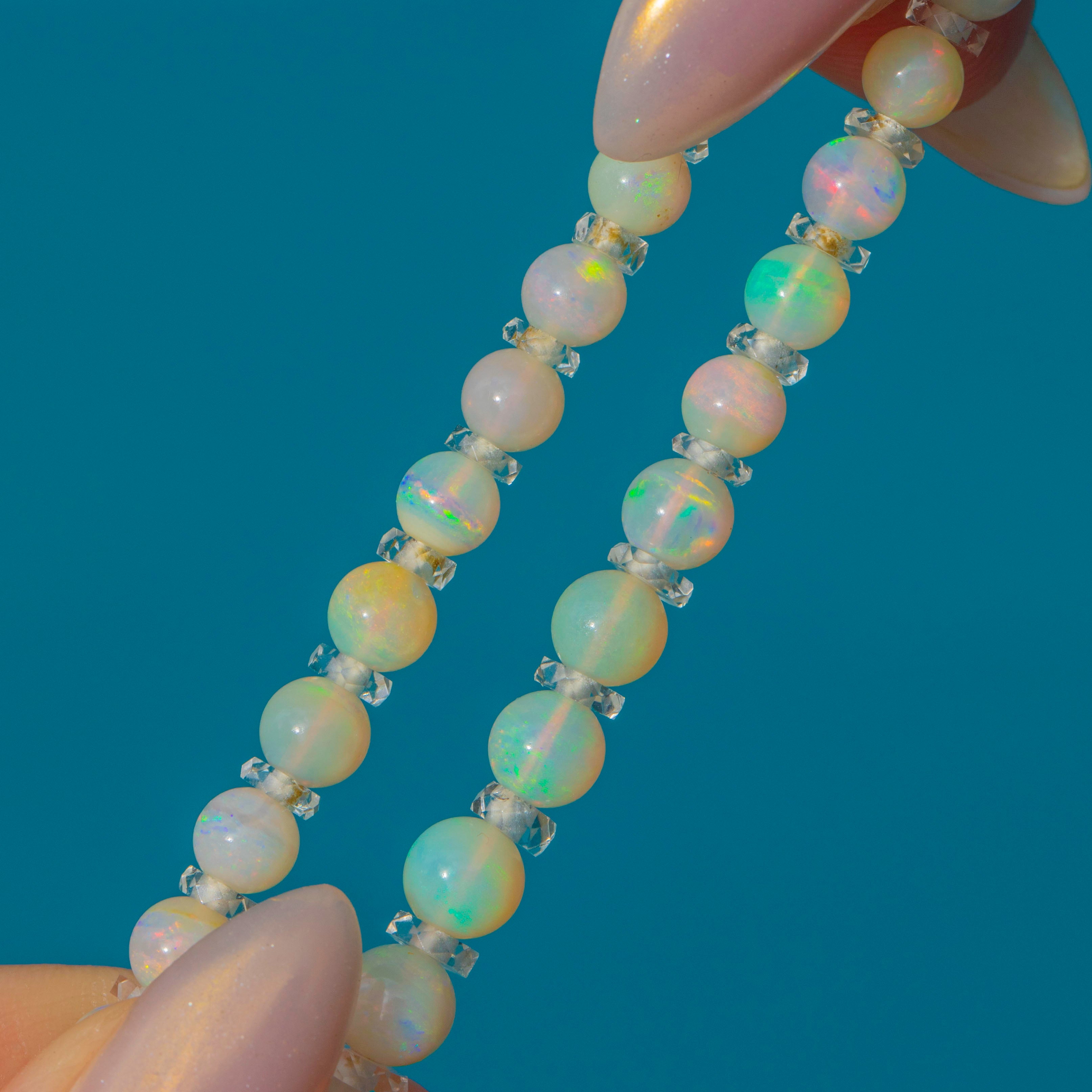 EXCELLENT: The Opal beads are free from chips, abrasions or cracks, retaining good lustre and play-of-colour. Rock Crystal spacers are intact and clear, and the 9ct Gold clasp is in full working order with minimal age-related wear.