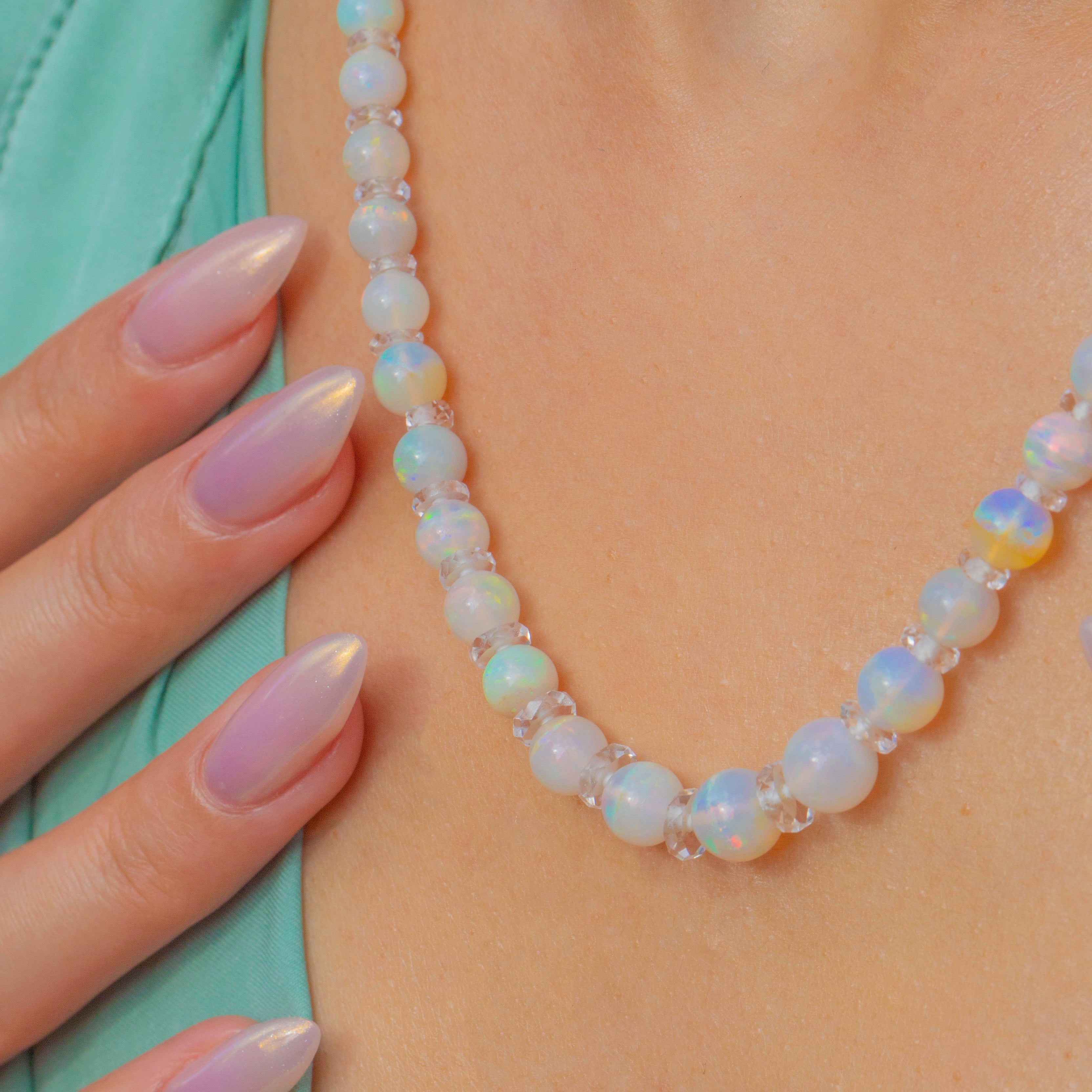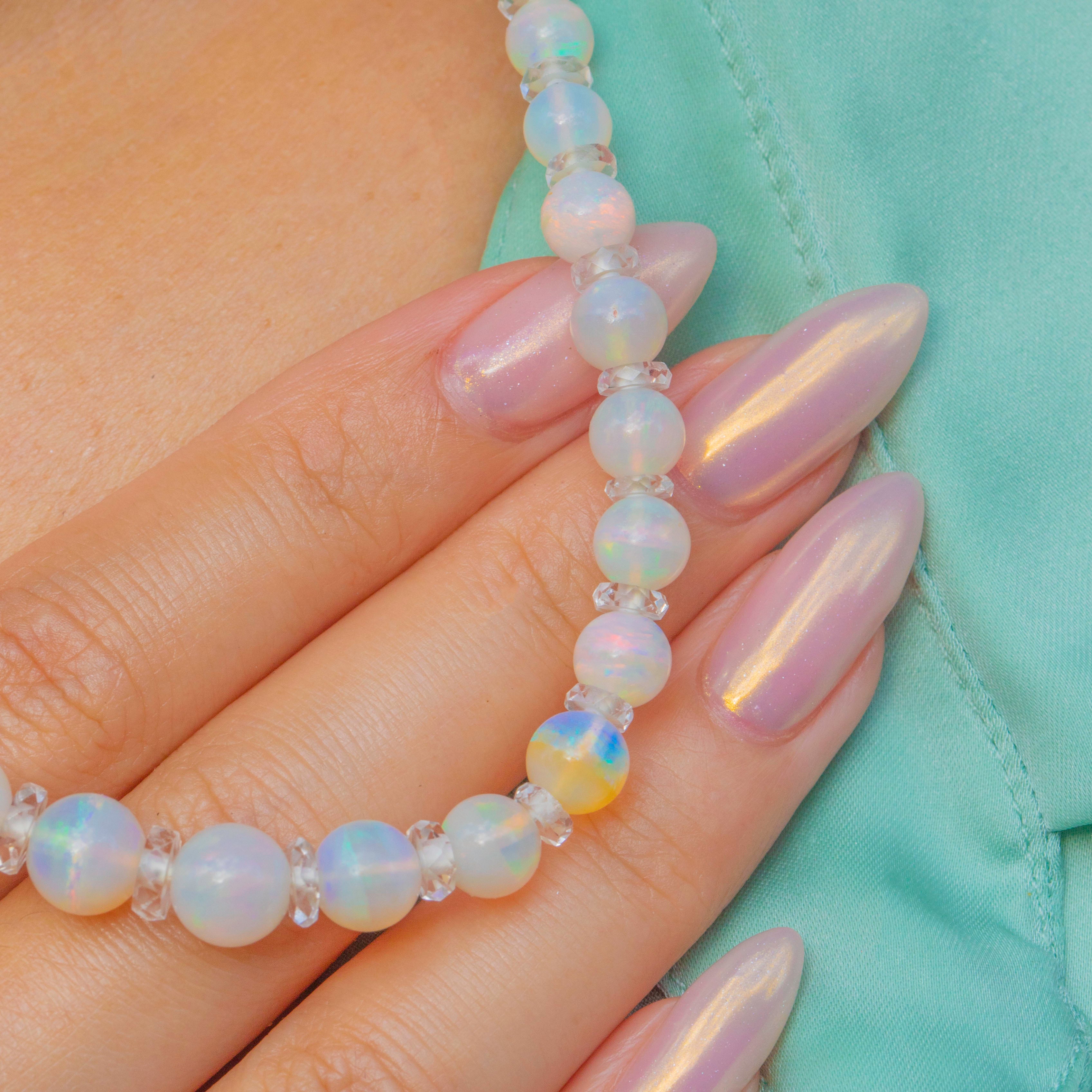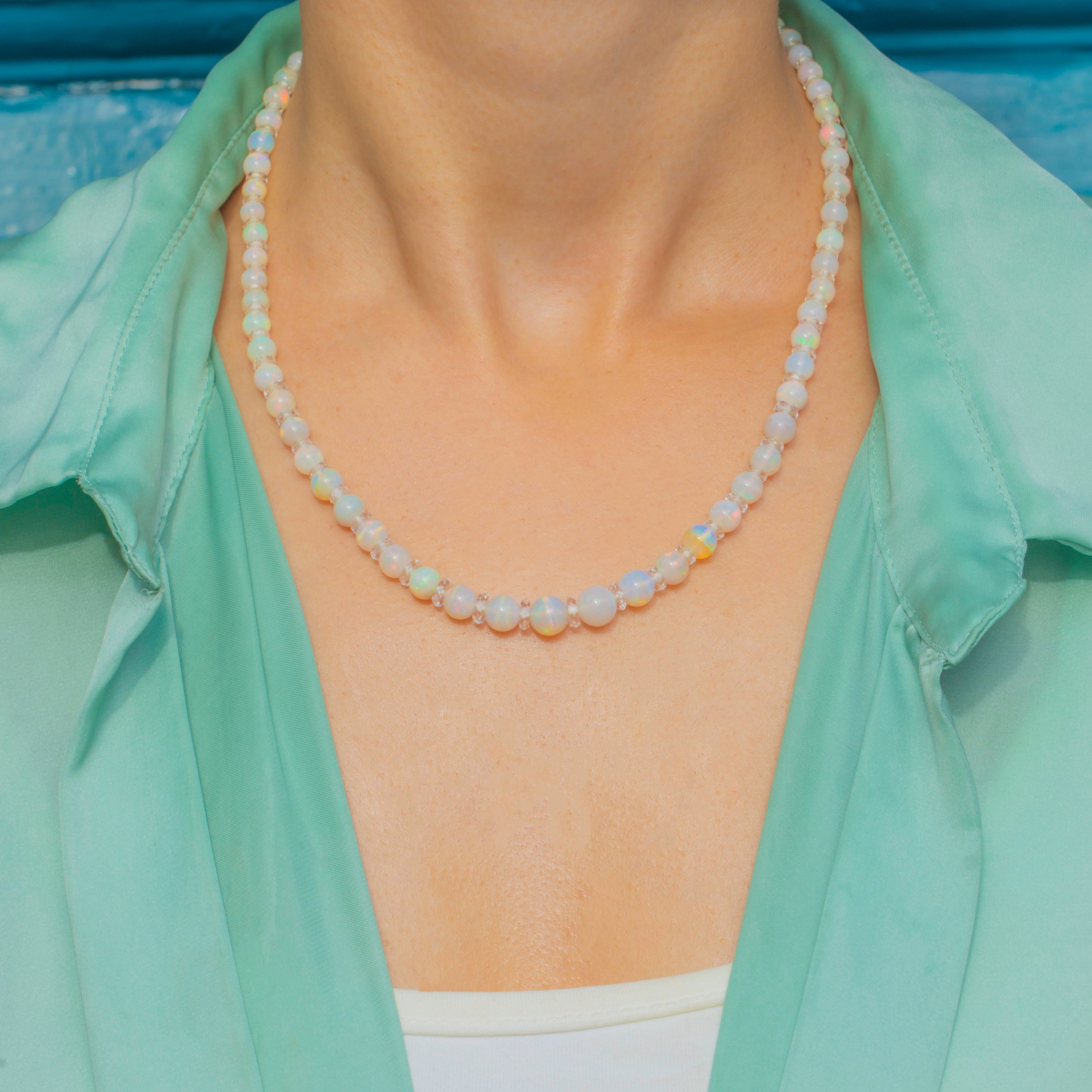 17" Art Deco Opal Bead Necklace with Rock Crystal Spacers, Antique Bolt Ring Clasp