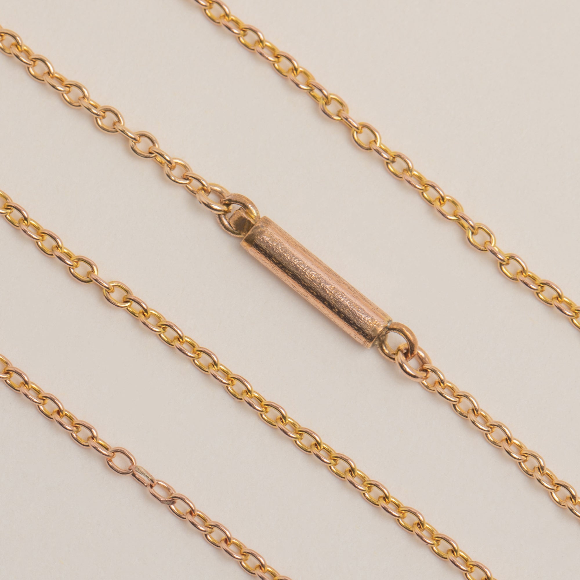 EXCELLENT. This antique 9ct Gold skinny chain is in excellent condition. Her saturated yellow Gold links are uniform and secure, flowing effortlessly across your collarbones. Paired with a secure barrel clasp, this skinny Victorian chain is the perfect item for suspending charms and allows for confident wear.