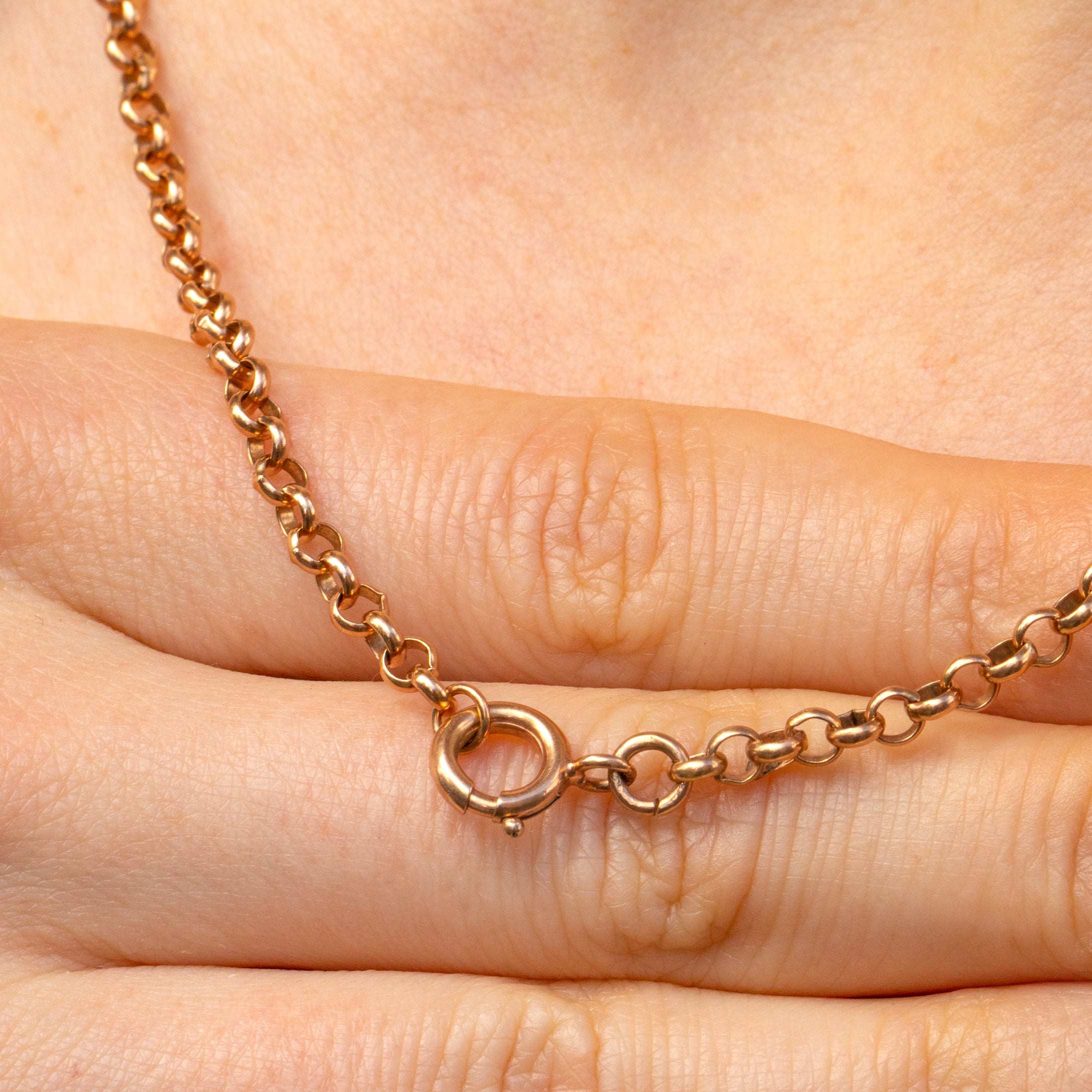 EXCELLENT. This 18" 9ct Rose Gold belcher chain is in excellent condition. The links are smooth and securely affixed with no dings or scuffs. There is a rare 9C tag and stamps on the jump ring near the clasp making this antique Gold chain a collectible piece. The rosy tone is divine and looks gorgeous on the skin! The bolt-ring allows you to wear this treasure securely, and you could even suspend a charm from it!